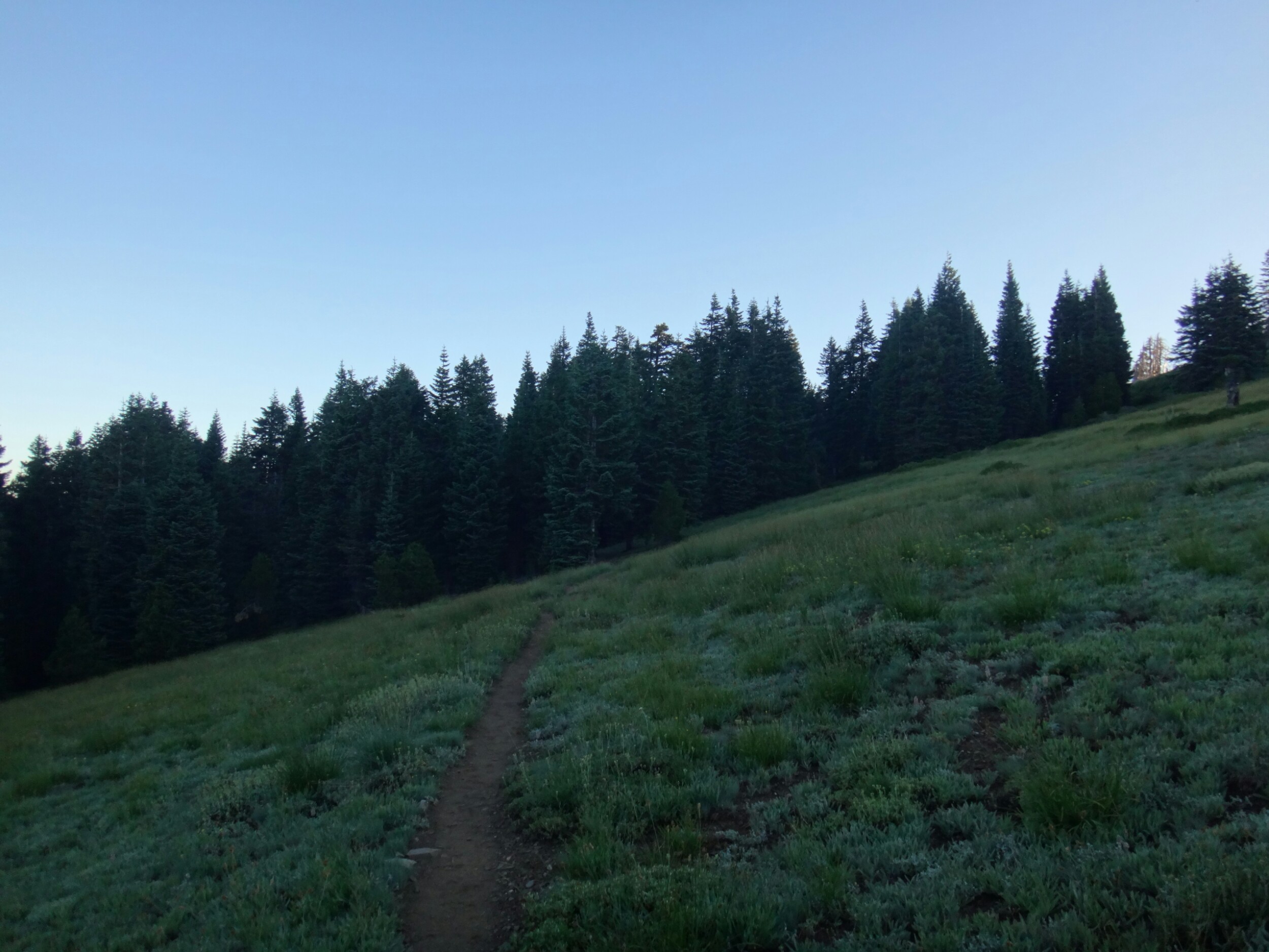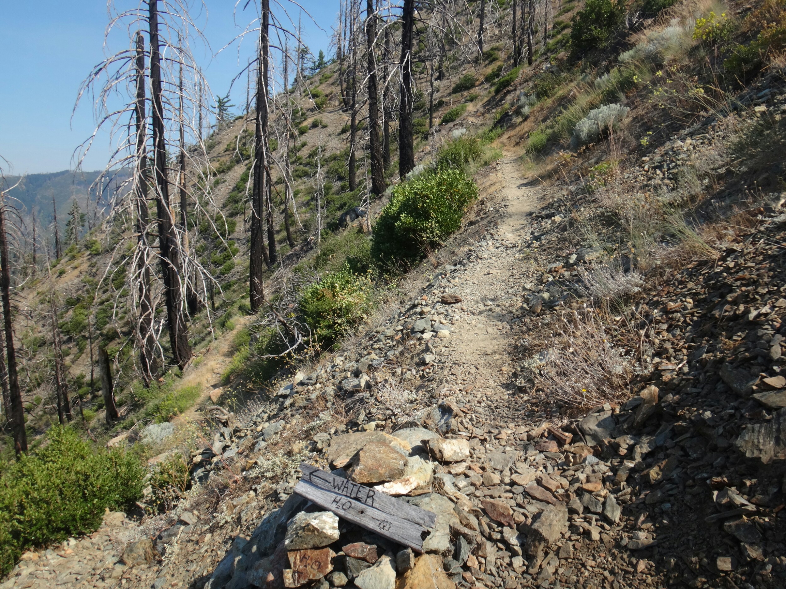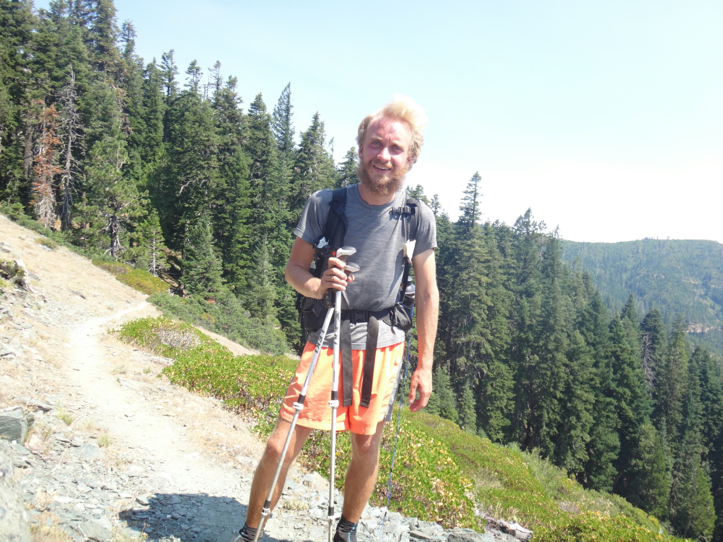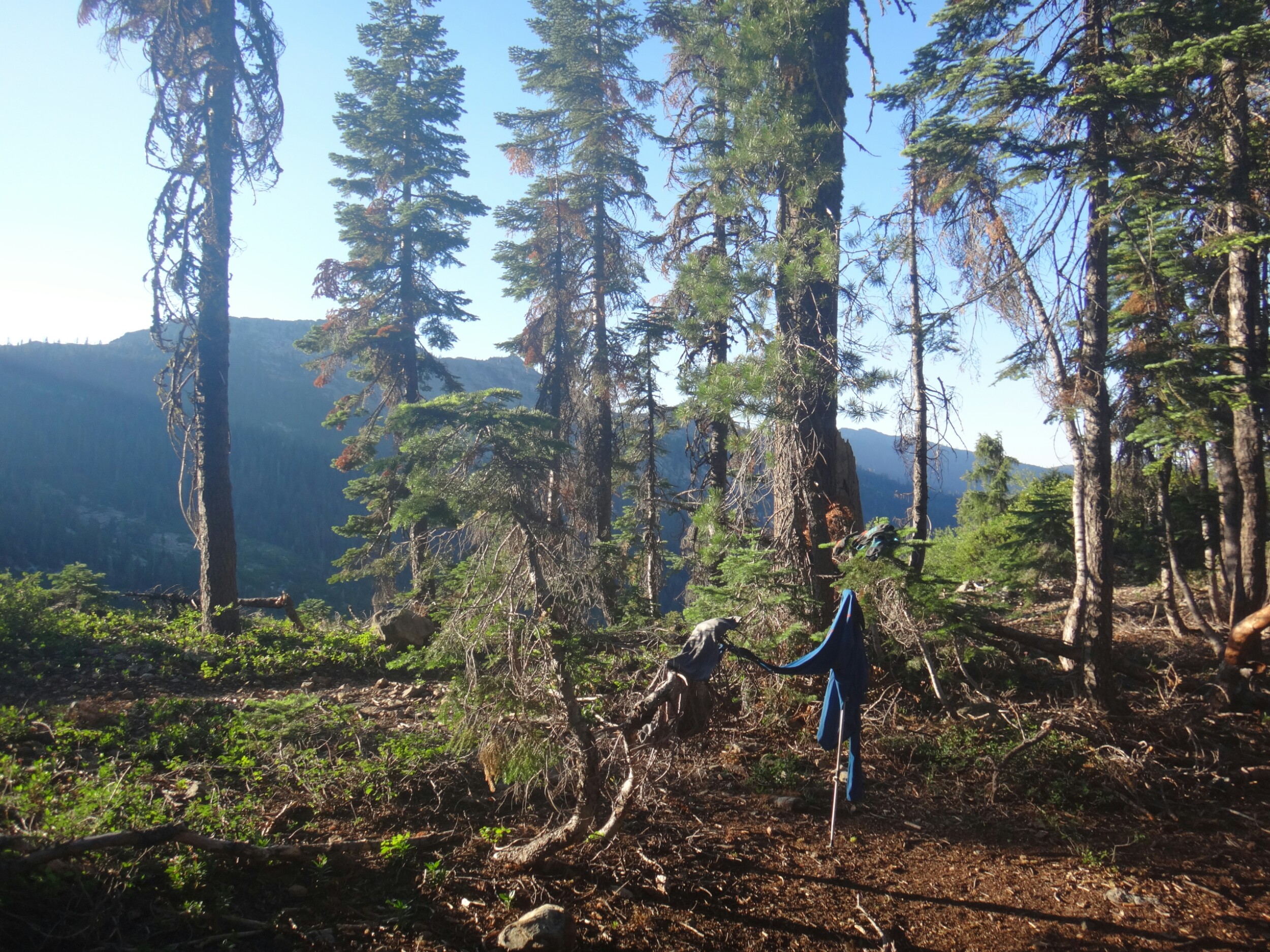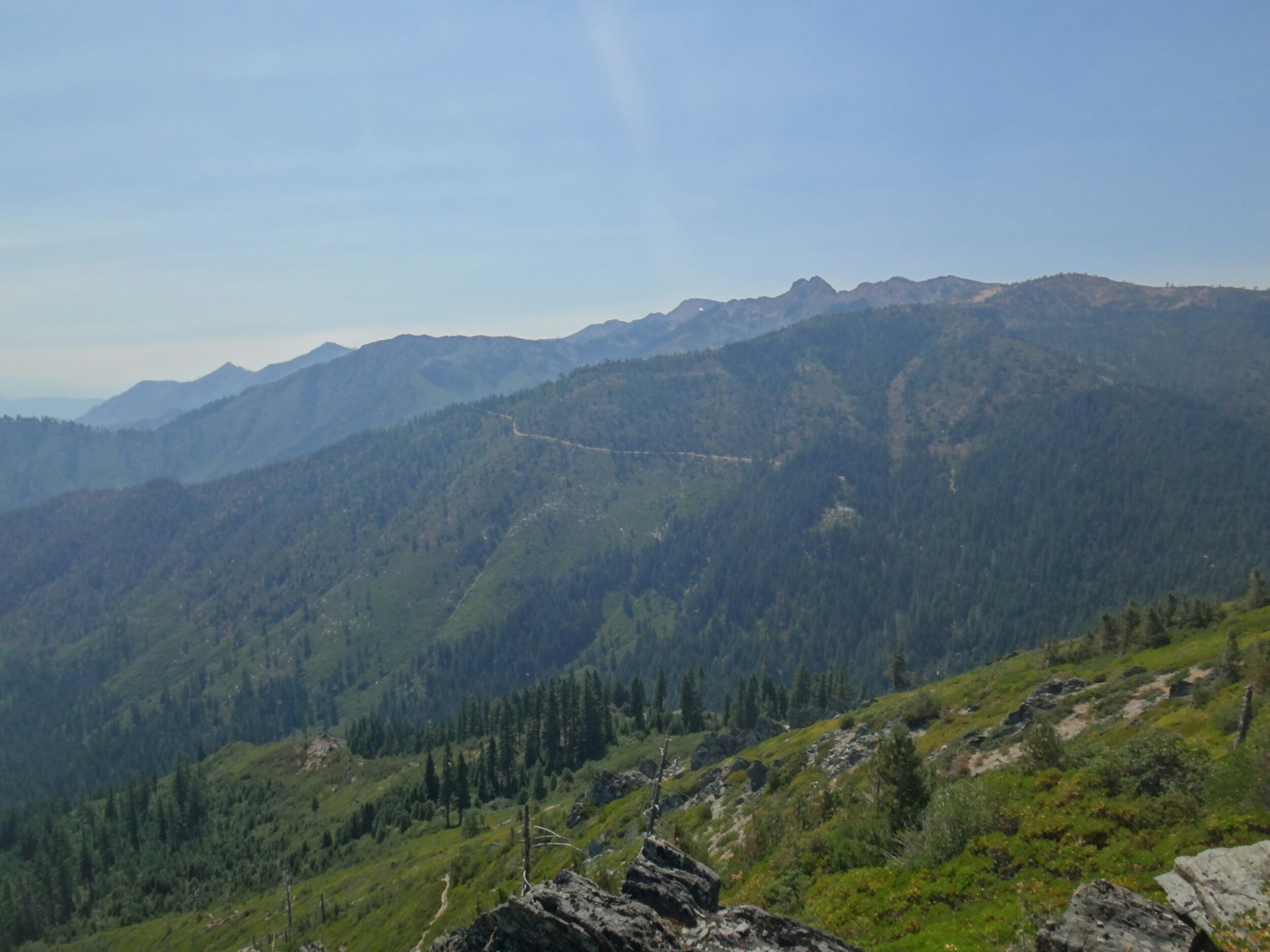 Ich hab mich einfach wieder umgedreht als die ersten an mir vorbei zogen. Dachte schon ich bin super spät dran. Nach einem Blick auf die Uhr konnte ich aber schon um 7.00 auf den Trail. Ich passierte den 1600 Meilen Marker und folgte dem Berg hinauf. Auf dem Bergrücken standen noch 2 Zelte in der Sonne und ich war froh auf der anderen Seite im Schatten zu laufen. Es ging immer leicht bergauf und ab. In den Tälern lag noch der Nebel. Aus einem Tal nicht weit entfernt stieg noch zusätzlich Rauch. Hier brennt es an einigen Stellen. Ich laufe den ganzen Tag am Berg entlang. Es idt wieder heiß. Gegen Mittag komme ich am einen See und kann Mittag im Schatten machen. Die Seen sind alle super klar aber bis auf ein paar Eidechsen sehe ich nichts schwimmen. Das Gelände ist ziemlich raff. Viele Steine und Wasser auf dieser Seite des Berges. Ich muss über ein Schneefeld wieder hoch um auf der anderen Seite weiter zu kommen. In der Ferne sehe ich die Marble Mountains. 2 weiße Berge die aus der Umgebung hinausstechen. Im Marble Tal gibt es eine Rainger Hütte an der ich kurz Rast mache und am Nachmittag endlich mal wieder ein paar Wanderer treffe. Von hier ist es nicht mehr mega weit und ich bin dem nicht abgeneigt. Allerdings geht es ersr wieder einige hundert Meter hinauf. Über mir fliegen die Löschhubschrauber ihre Einsätze. Der Wald wird ziemlich düster und die zu überquerenden Schneefelder tragen ihren Schatten dazu bei. Tief im Gras versunken laufe ich weiter. Ich treffe auf OptimisticTourtle bevor ich an einem See drei weitere Wanderer treffe. Aber ich will noch ein wenig höher und auf einer Ridgelinen pennen. Dort oben stürmt es aber ordentlich und ich koche nur schnell Abendessen bevor ich weiter ziehen muss. Leider wieder 100 Meter hinauf. Aber das geht schnell. Hier gehts in einem schönen Wald, abwechselnd zu Gras, über en Bergrücken. Zwischen ein paar Bäumen schlage ich mein Zelt auf. Gegen 20 Uhr liege ich in Bett. Zum Glück habe ich vor mein Zelt gepinkelt. Jetzt kann ich aus dem Schlafsack Bilder von einem jungen Hirsch schießen der Salzdurst hat. Allerdings läuft erndie halbe Nacht um mein Zelt. Ich schlafe trotzdem gut. Meine Schienbeine sind sind immer noch top. Allerdings hat mein rechtes Knie ab und an mal geschmerz. Aber man hat ja immer etwas das weh tut.