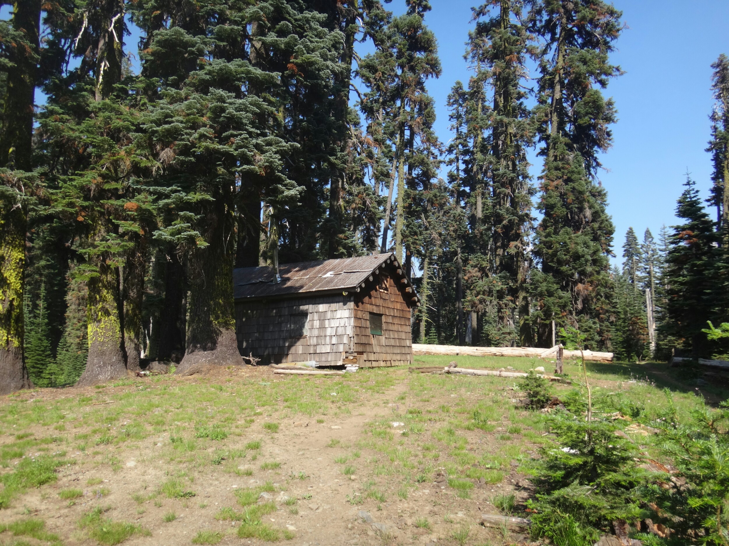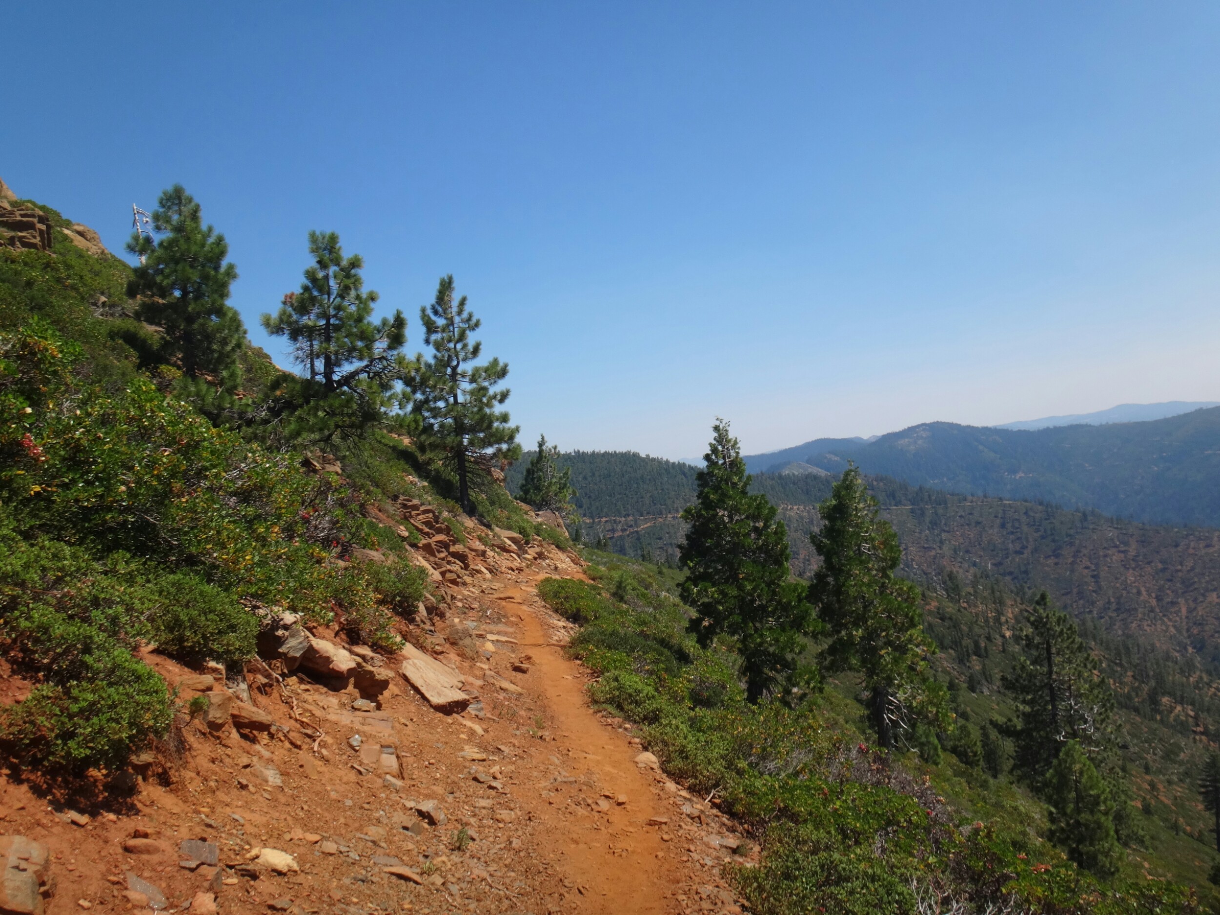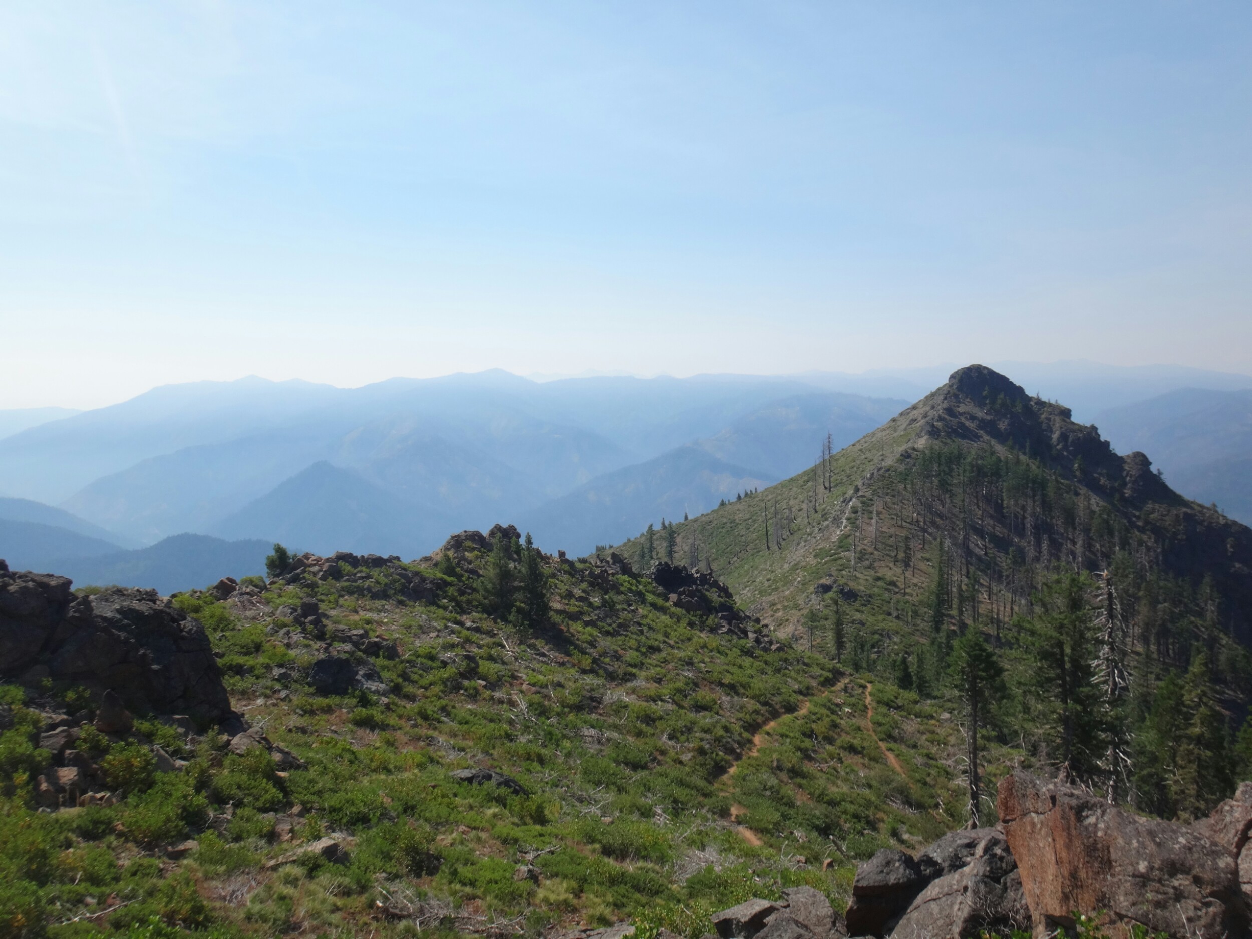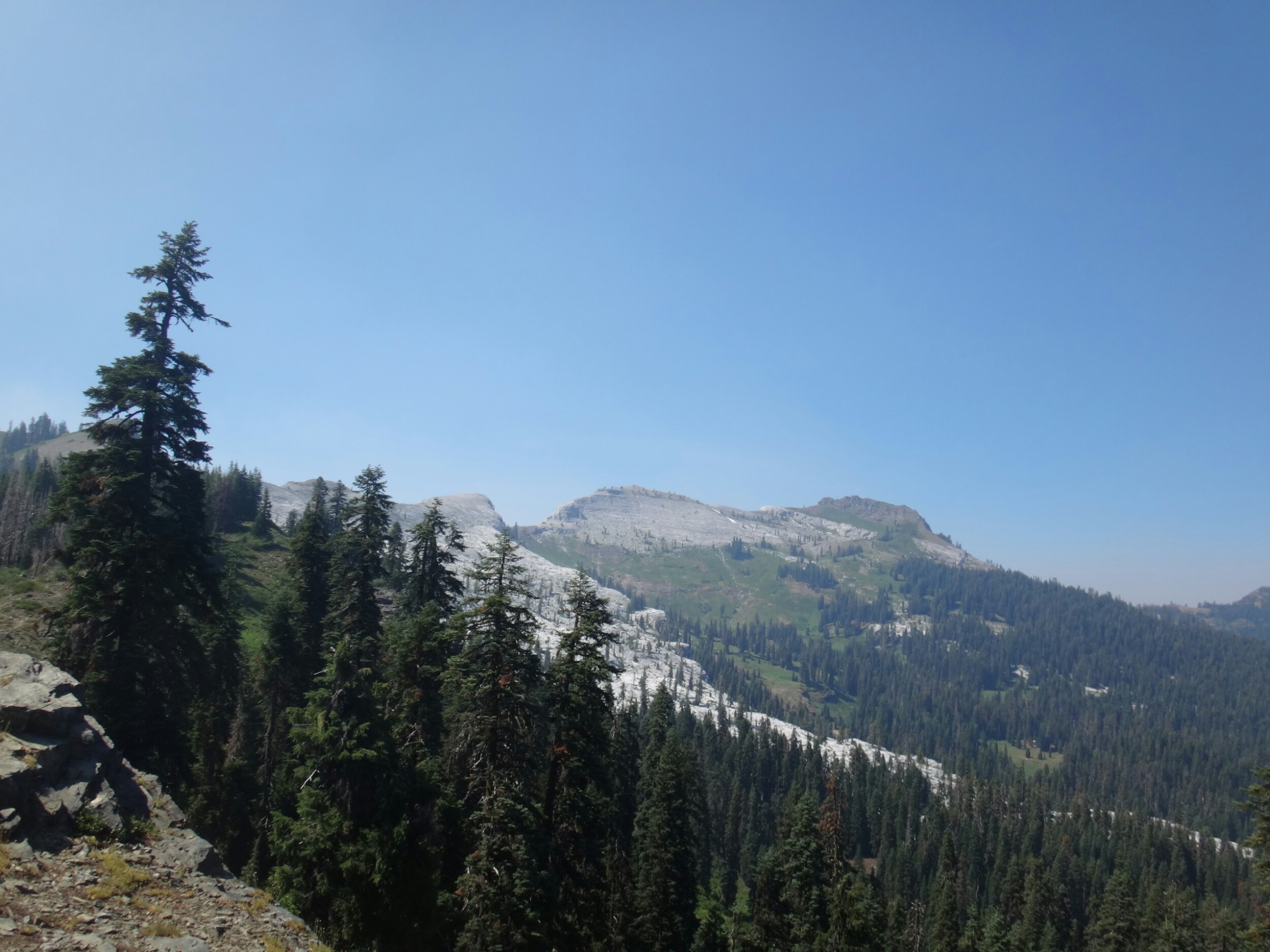 Ich hab mich einfach wieder umgedreht als die ersten an mir vorbei zogen. Dachte schon ich bin super spät dran. Nach einem Blick auf die Uhr konnte ich aber schon um 7.00 auf den Trail. Ich passierte den 1600 Meilen Marker und folgte dem Berg hinauf. Auf dem Bergrücken standen noch 2 Zelte in der Sonne und ich war froh auf der anderen Seite im Schatten zu laufen. Es ging immer leicht bergauf und ab. In den Tälern lag noch der Nebel. Aus einem Tal nicht weit entfernt stieg noch zusätzlich Rauch. Hier brennt es an einigen Stellen. Ich laufe den ganzen Tag am Berg entlang. Es idt wieder heiß. Gegen Mittag komme ich am einen See und kann Mittag im Schatten machen. Die Seen sind alle super klar aber bis auf ein paar Eidechsen sehe ich nichts schwimmen. Das Gelände ist ziemlich raff. Viele Steine und Wasser auf dieser Seite des Berges. Ich muss über ein Schneefeld wieder hoch um auf der anderen Seite weiter zu kommen. In der Ferne sehe ich die Marble Mountains. 2 weiße Berge die aus der Umgebung hinausstechen. Im Marble Tal gibt es eine Rainger Hütte an der ich kurz Rast mache und am Nachmittag endlich mal wieder ein paar Wanderer treffe. Von hier ist es nicht mehr mega weit und ich bin dem nicht abgeneigt. Allerdings geht es ersr wieder einige hundert Meter hinauf. Über mir fliegen die Löschhubschrauber ihre Einsätze. Der Wald wird ziemlich düster und die zu überquerenden Schneefelder tragen ihren Schatten dazu bei. Tief im Gras versunken laufe ich weiter. Ich treffe auf OptimisticTourtle bevor ich an einem See drei weitere Wanderer treffe. Aber ich will noch ein wenig höher und auf einer Ridgelinen pennen. Dort oben stürmt es aber ordentlich und ich koche nur schnell Abendessen bevor ich weiter ziehen muss. Leider wieder 100 Meter hinauf. Aber das geht schnell. Hier gehts in einem schönen Wald, abwechselnd zu Gras, über en Bergrücken. Zwischen ein paar Bäumen schlage ich mein Zelt auf. Gegen 20 Uhr liege ich in Bett. Zum Glück habe ich vor mein Zelt gepinkelt. Jetzt kann ich aus dem Schlafsack Bilder von einem jungen Hirsch schießen der Salzdurst hat. Allerdings läuft erndie halbe Nacht um mein Zelt. Ich schlafe trotzdem gut. Meine Schienbeine sind sind immer noch top. Allerdings hat mein rechtes Knie ab und an mal geschmerz. Aber man hat ja immer etwas das weh tut.