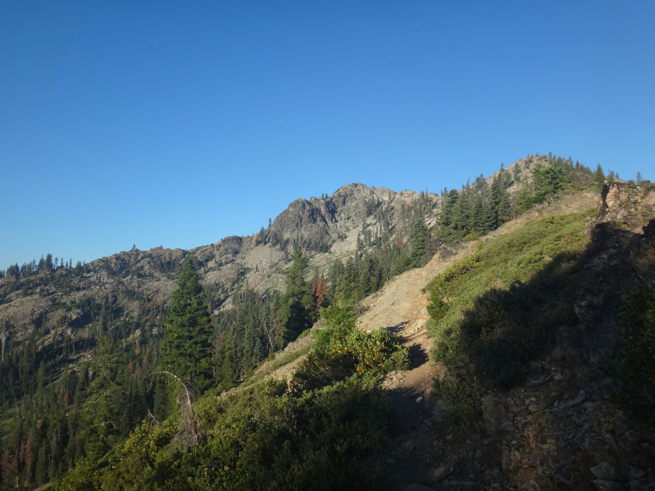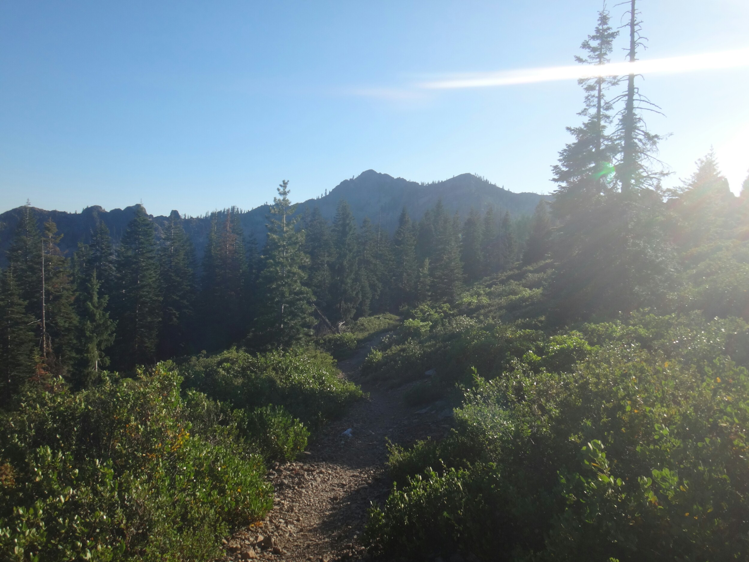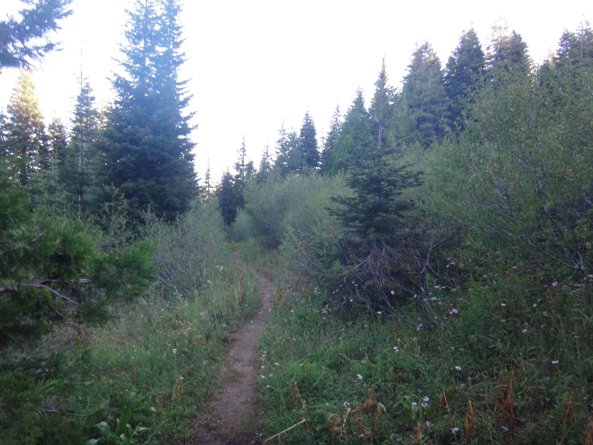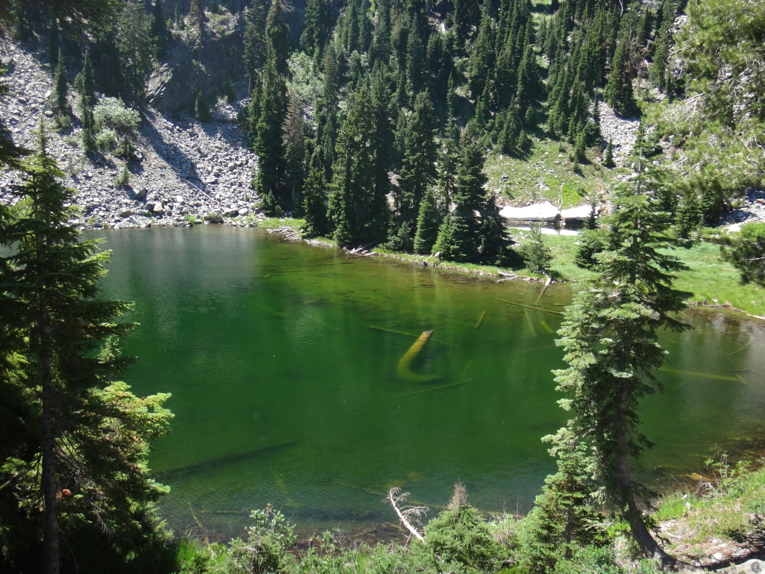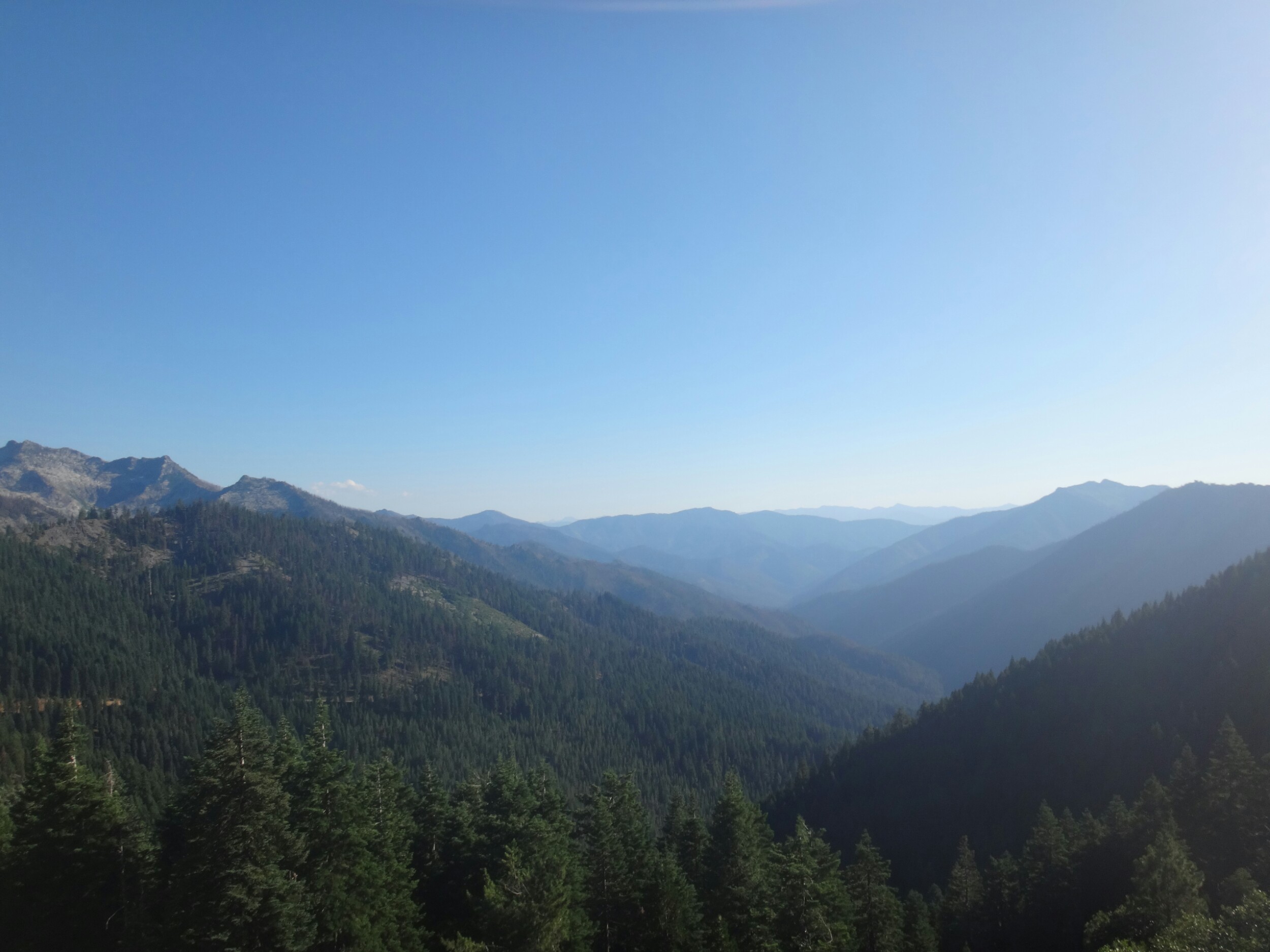 Ich hab mich einfach wieder umgedreht als die ersten an mir vorbei zogen. Dachte schon ich bin super spät dran. Nach einem Blick auf die Uhr konnte ich aber schon um 7.00 auf den Trail. Ich passierte den 1600 Meilen Marker und folgte dem Berg hinauf. Auf dem Bergrücken standen noch 2 Zelte in der Sonne und ich war froh auf der anderen Seite im Schatten zu laufen. Es ging immer leicht bergauf und ab. In den Tälern lag noch der Nebel. Aus einem Tal nicht weit entfernt stieg noch zusätzlich Rauch. Hier brennt es an einigen Stellen. Ich laufe den ganzen Tag am Berg entlang. Es idt wieder heiß. Gegen Mittag komme ich am einen See und kann Mittag im Schatten machen. Die Seen sind alle super klar aber bis auf ein paar Eidechsen sehe ich nichts schwimmen. Das Gelände ist ziemlich raff. Viele Steine und Wasser auf dieser Seite des Berges. Ich muss über ein Schneefeld wieder hoch um auf der anderen Seite weiter zu kommen. In der Ferne sehe ich die Marble Mountains. 2 weiße Berge die aus der Umgebung hinausstechen. Im Marble Tal gibt es eine Rainger Hütte an der ich kurz Rast mache und am Nachmittag endlich mal wieder ein paar Wanderer treffe. Von hier ist es nicht mehr mega weit und ich bin dem nicht abgeneigt. Allerdings geht es ersr wieder einige hundert Meter hinauf. Über mir fliegen die Löschhubschrauber ihre Einsätze. Der Wald wird ziemlich düster und die zu überquerenden Schneefelder tragen ihren Schatten dazu bei. Tief im Gras versunken laufe ich weiter. Ich treffe auf OptimisticTourtle bevor ich an einem See drei weitere Wanderer treffe. Aber ich will noch ein wenig höher und auf einer Ridgelinen pennen. Dort oben stürmt es aber ordentlich und ich koche nur schnell Abendessen bevor ich weiter ziehen muss. Leider wieder 100 Meter hinauf. Aber das geht schnell. Hier gehts in einem schönen Wald, abwechselnd zu Gras, über en Bergrücken. Zwischen ein paar Bäumen schlage ich mein Zelt auf. Gegen 20 Uhr liege ich in Bett. Zum Glück habe ich vor mein Zelt gepinkelt. Jetzt kann ich aus dem Schlafsack Bilder von einem jungen Hirsch schießen der Salzdurst hat. Allerdings läuft erndie halbe Nacht um mein Zelt. Ich schlafe trotzdem gut. Meine Schienbeine sind sind immer noch top. Allerdings hat mein rechtes Knie ab und an mal geschmerz. Aber man hat ja immer etwas das weh tut.