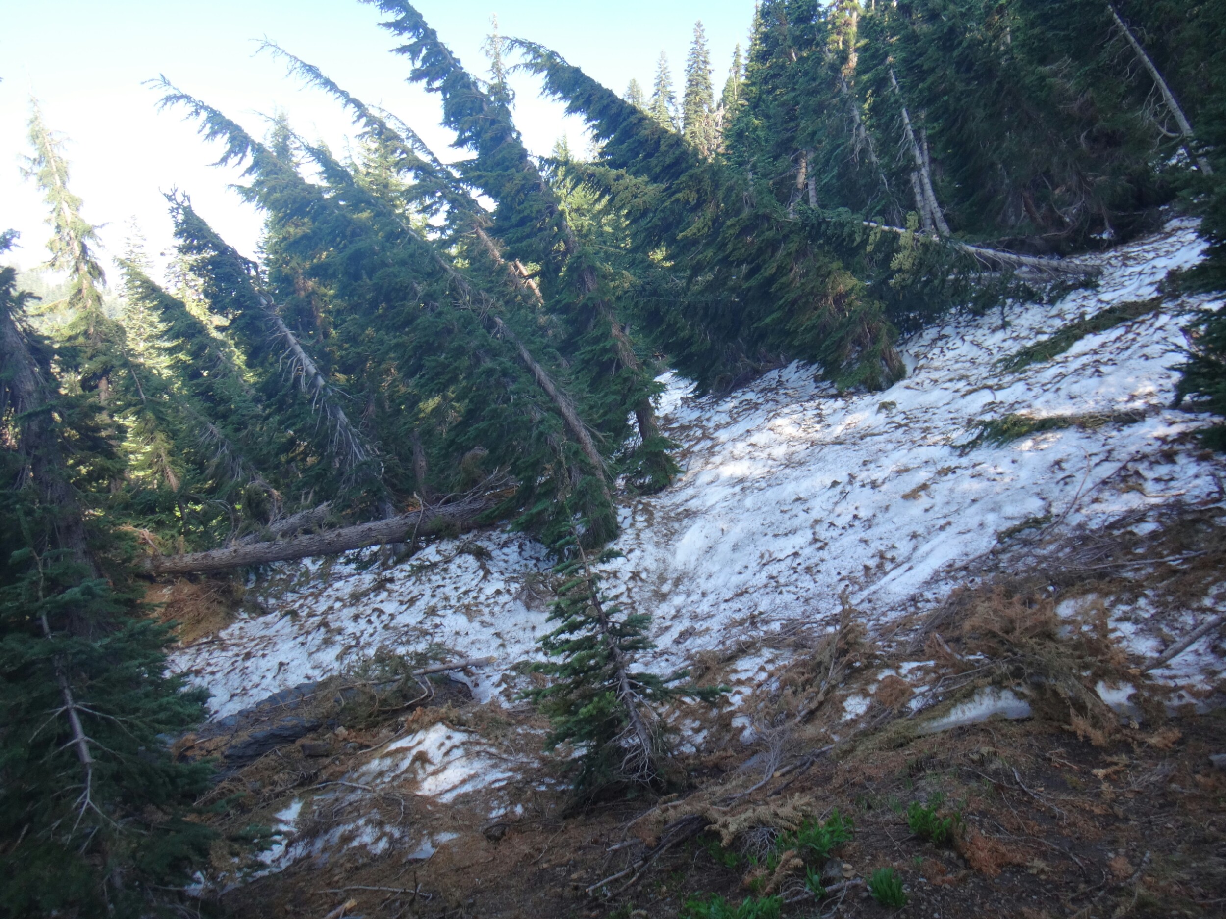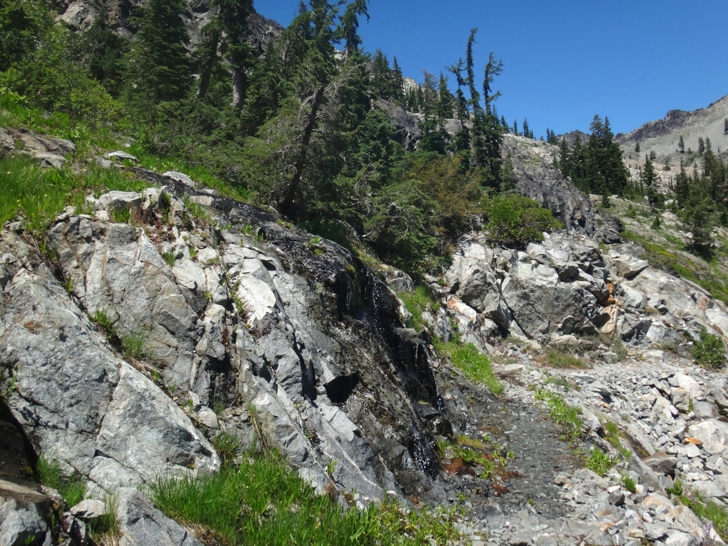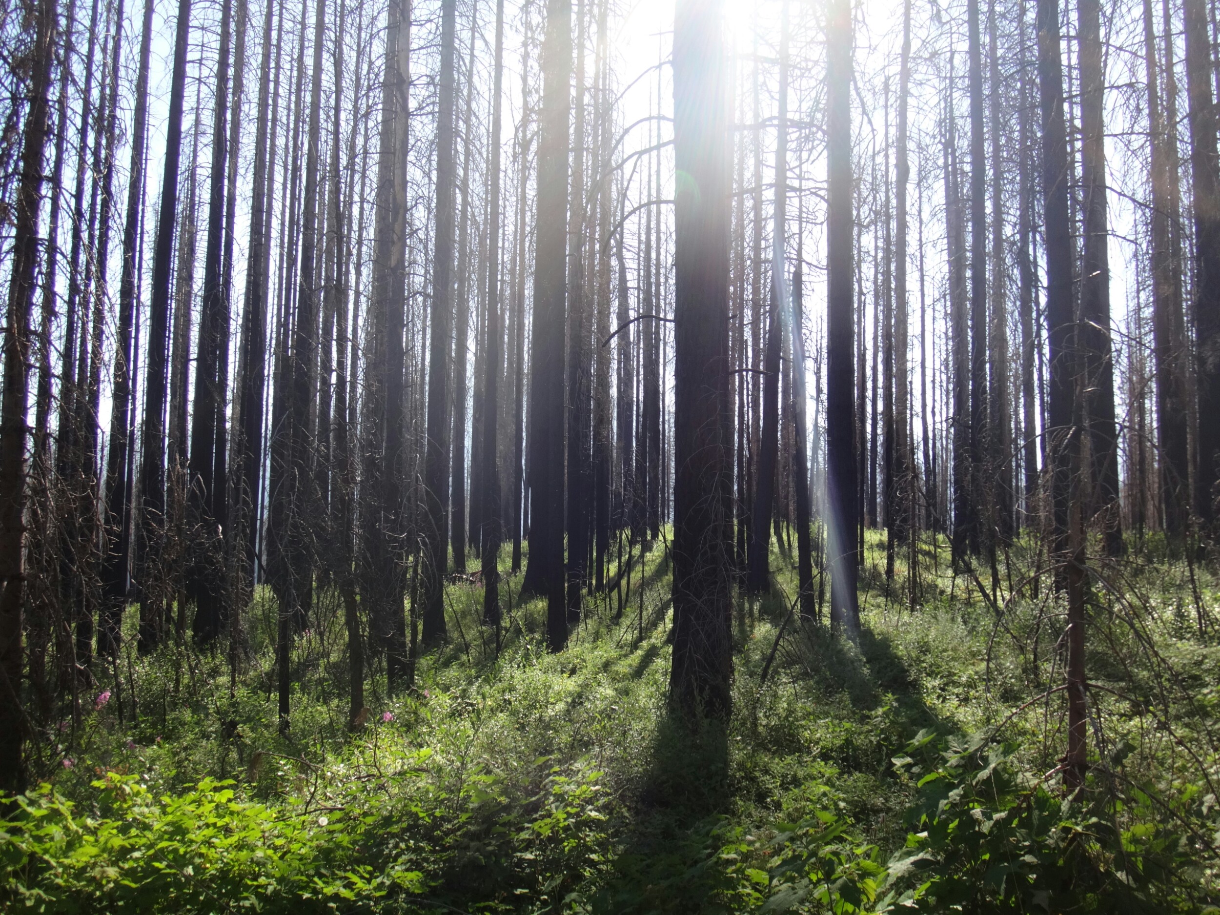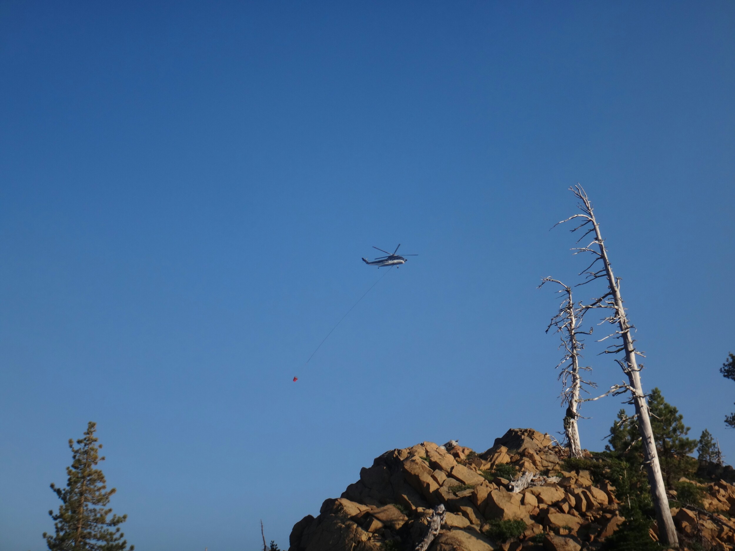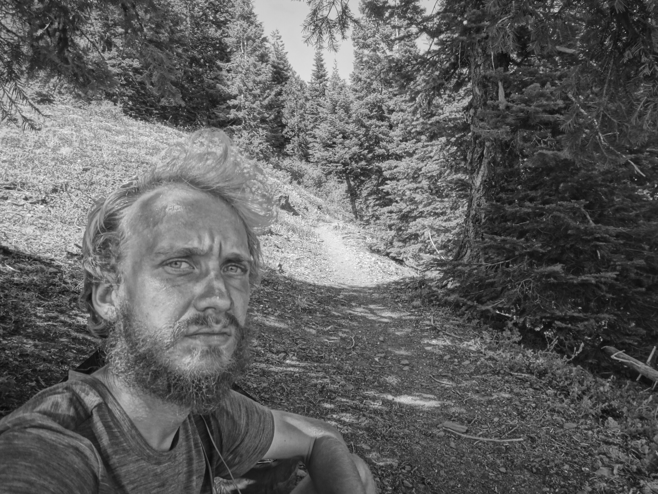 Ich hab mich einfach wieder umgedreht als die ersten an mir vorbei zogen. Dachte schon ich bin super spät dran. Nach einem Blick auf die Uhr konnte ich aber schon um 7.00 auf den Trail. Ich passierte den 1600 Meilen Marker und folgte dem Berg hinauf. Auf dem Bergrücken standen noch 2 Zelte in der Sonne und ich war froh auf der anderen Seite im Schatten zu laufen. Es ging immer leicht bergauf und ab. In den Tälern lag noch der Nebel. Aus einem Tal nicht weit entfernt stieg noch zusätzlich Rauch. Hier brennt es an einigen Stellen. Ich laufe den ganzen Tag am Berg entlang. Es idt wieder heiß. Gegen Mittag komme ich am einen See und kann Mittag im Schatten machen. Die Seen sind alle super klar aber bis auf ein paar Eidechsen sehe ich nichts schwimmen. Das Gelände ist ziemlich raff. Viele Steine und Wasser auf dieser Seite des Berges. Ich muss über ein Schneefeld wieder hoch um auf der anderen Seite weiter zu kommen. In der Ferne sehe ich die Marble Mountains. 2 weiße Berge die aus der Umgebung hinausstechen. Im Marble Tal gibt es eine Rainger Hütte an der ich kurz Rast mache und am Nachmittag endlich mal wieder ein paar Wanderer treffe. Von hier ist es nicht mehr mega weit und ich bin dem nicht abgeneigt. Allerdings geht es ersr wieder einige hundert Meter hinauf. Über mir fliegen die Löschhubschrauber ihre Einsätze. Der Wald wird ziemlich düster und die zu überquerenden Schneefelder tragen ihren Schatten dazu bei. Tief im Gras versunken laufe ich weiter. Ich treffe auf OptimisticTourtle bevor ich an einem See drei weitere Wanderer treffe. Aber ich will noch ein wenig höher und auf einer Ridgelinen pennen. Dort oben stürmt es aber ordentlich und ich koche nur schnell Abendessen bevor ich weiter ziehen muss. Leider wieder 100 Meter hinauf. Aber das geht schnell. Hier gehts in einem schönen Wald, abwechselnd zu Gras, über en Bergrücken. Zwischen ein paar Bäumen schlage ich mein Zelt auf. Gegen 20 Uhr liege ich in Bett. Zum Glück habe ich vor mein Zelt gepinkelt. Jetzt kann ich aus dem Schlafsack Bilder von einem jungen Hirsch schießen der Salzdurst hat. Allerdings läuft erndie halbe Nacht um mein Zelt. Ich schlafe trotzdem gut. Meine Schienbeine sind sind immer noch top. Allerdings hat mein rechtes Knie ab und an mal geschmerz. Aber man hat ja immer etwas das weh tut.