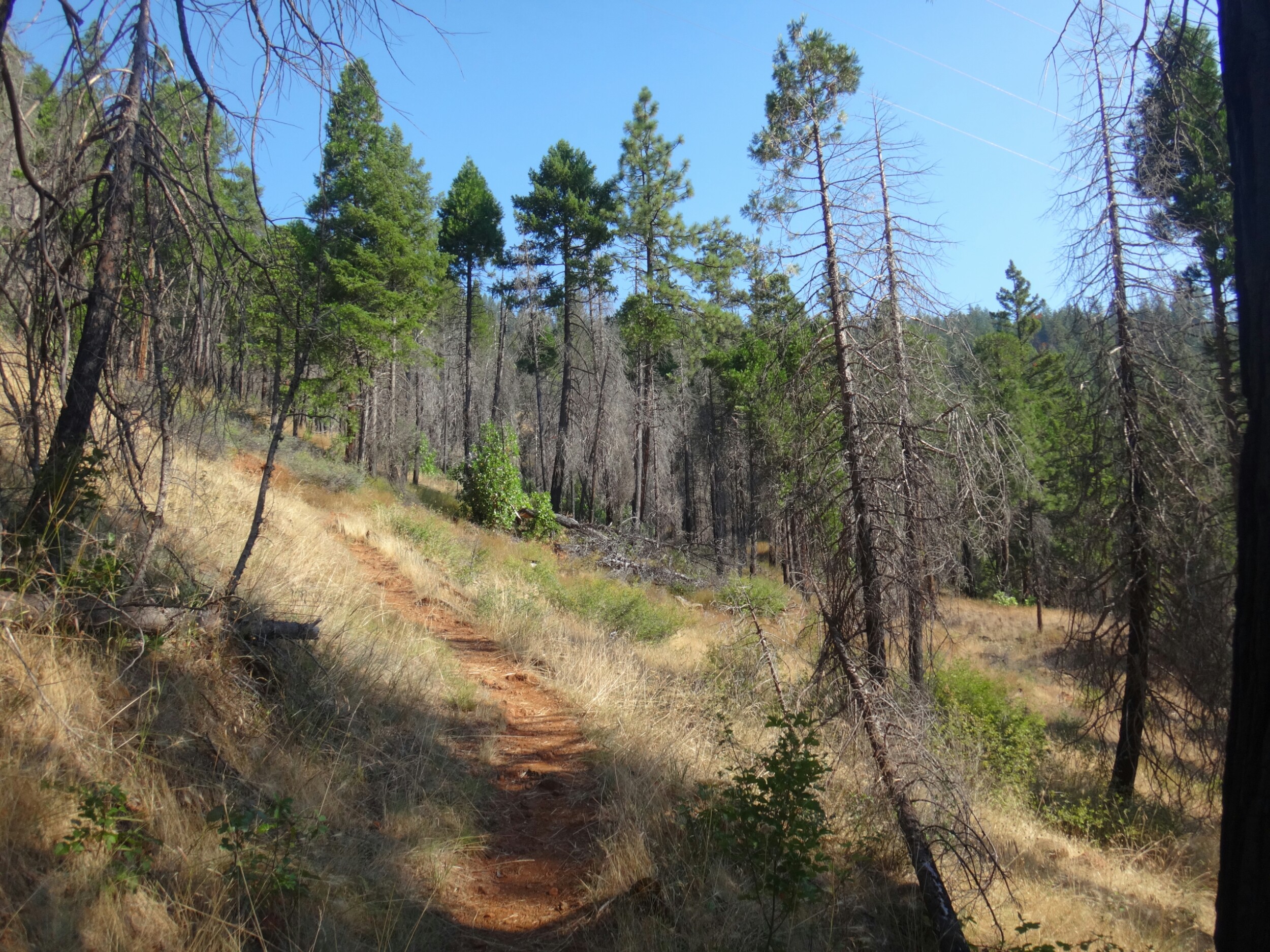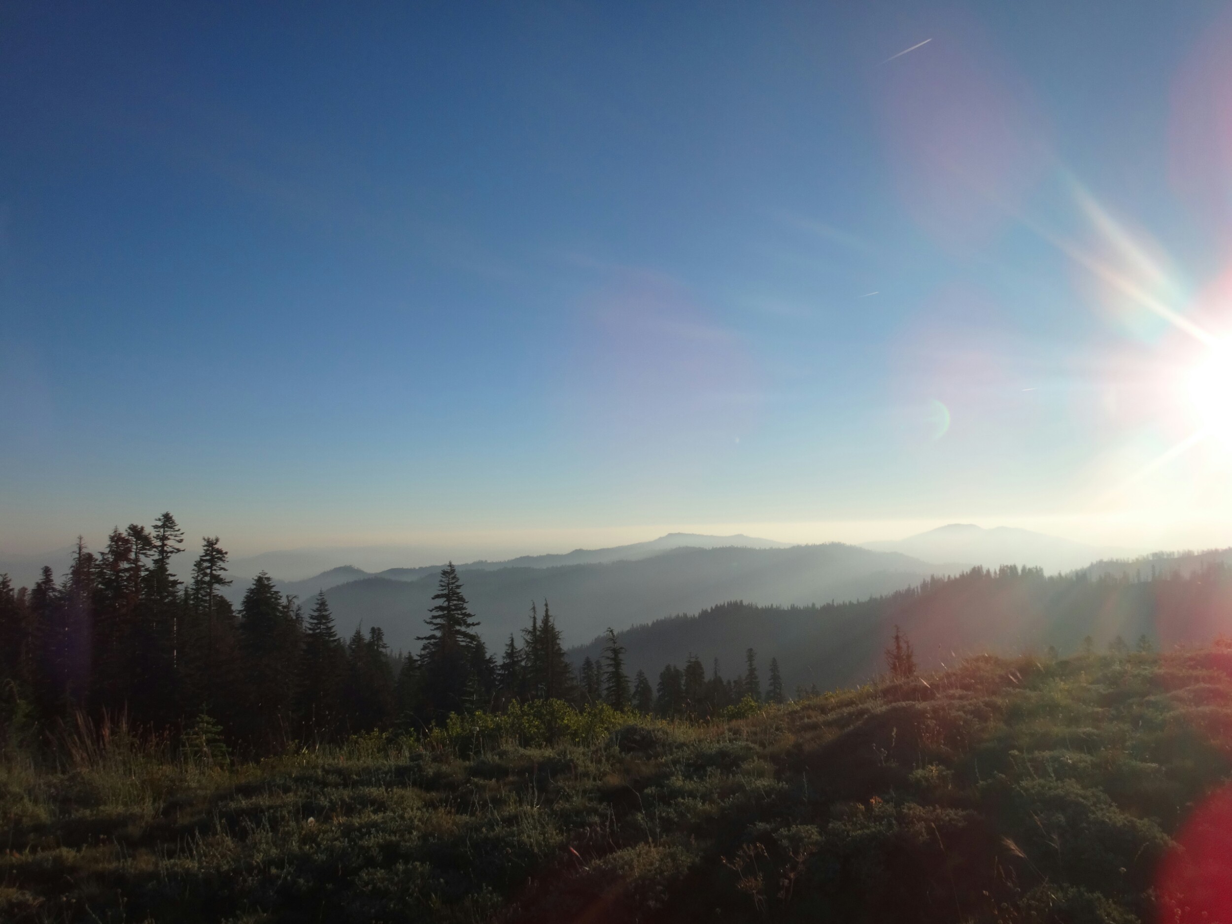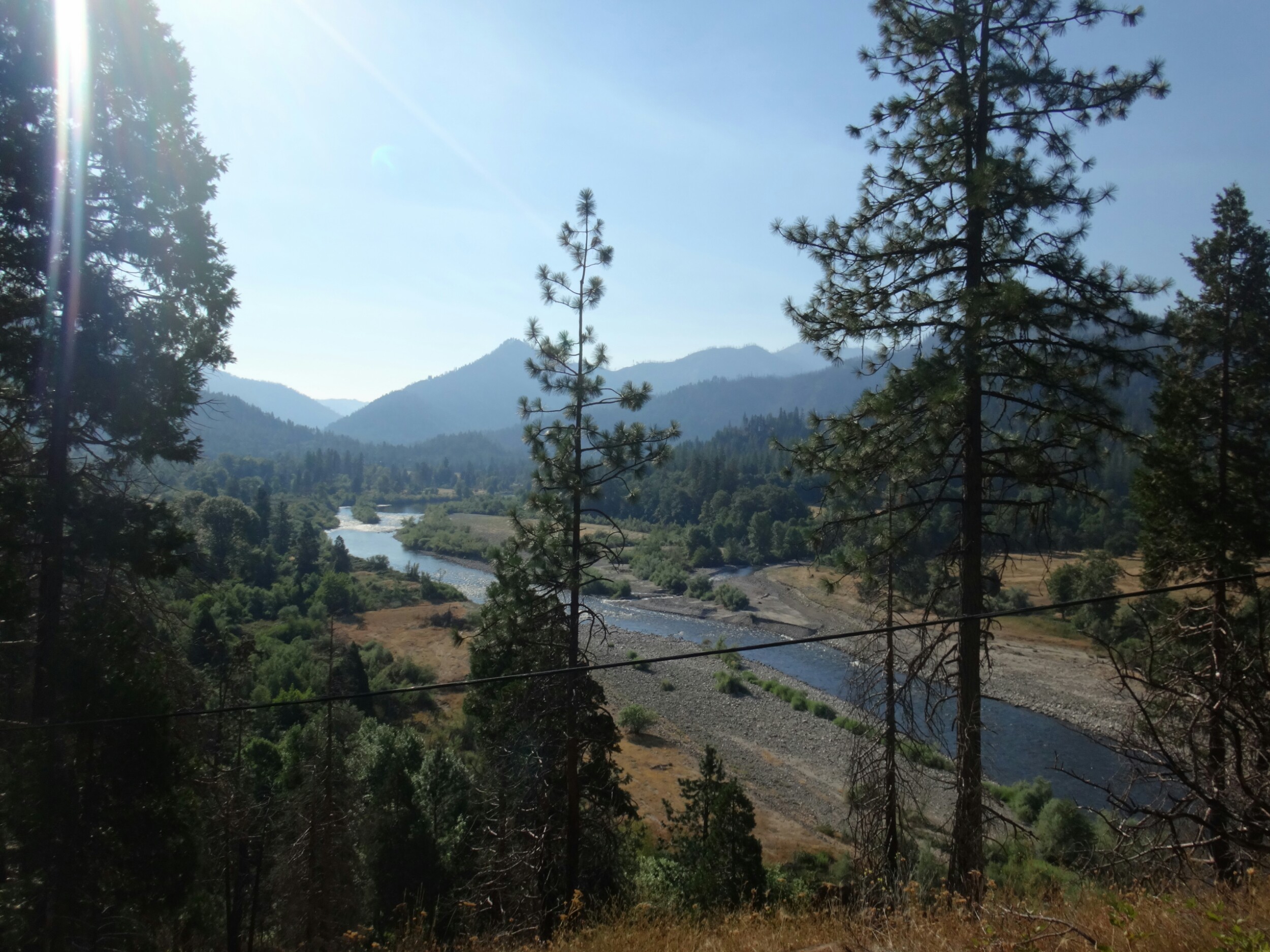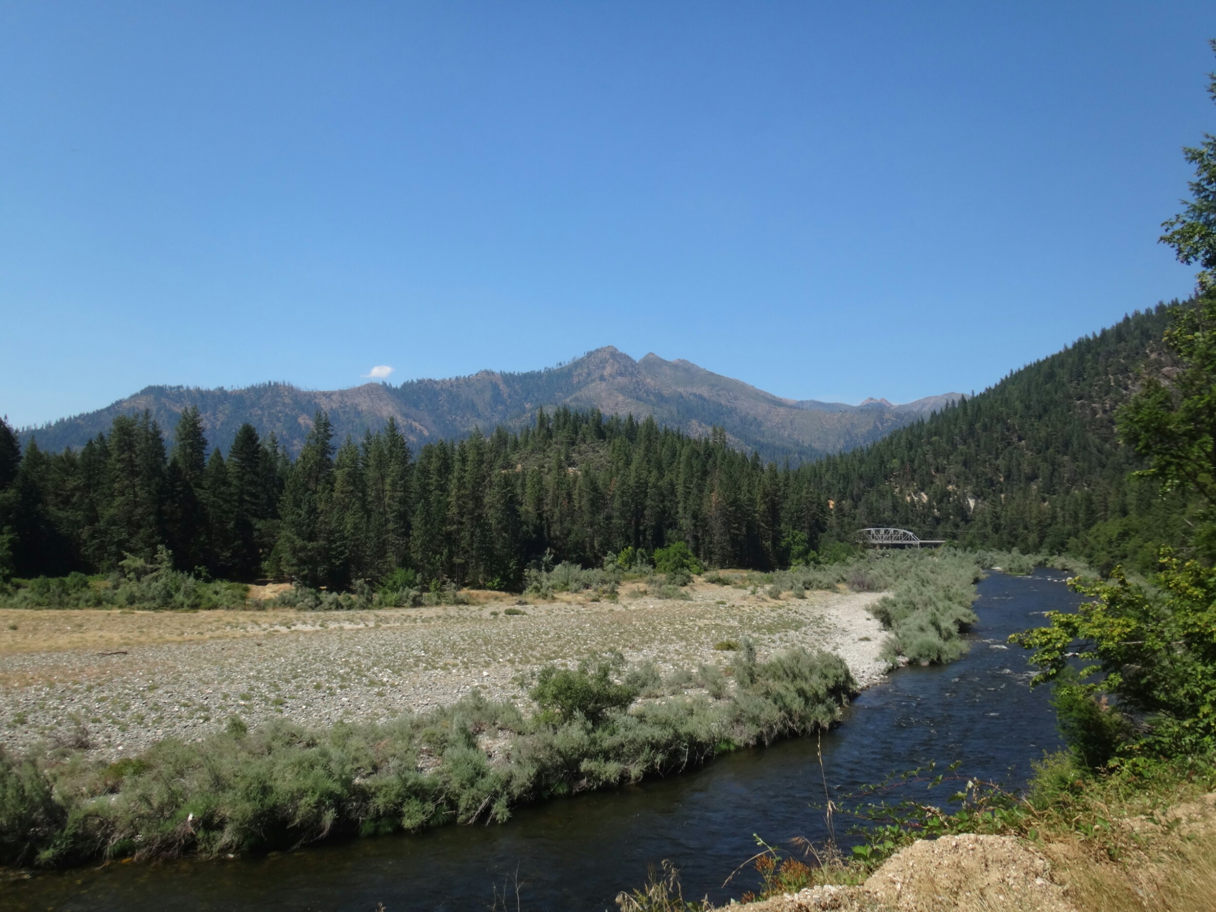 Zum Sonnenaufgang hab ichbes gerad noch raus geschafft. War aber trotzdem gemütlich. Um 6.40 gings los. Wieder am Berghang ging es seicht durch Wiesen und Wälder. Ich traf auf ein Reh das aber schnell verschwand. Der folgende Abstieg zog sich dann bis ins Tal über 1700hm und 35 km lang. Als ich mich einen Zeltplatz nährete sah ich gerade noch einen riesen Schwarzbären der allerdings braun war. Er schaute mich an und verschwand dann den Berg hinab. Ich zückte meine Kamera traf ihn aber nicht wieder an als ich langsam den selben Berg hinab stieg. Dafür traf ich zwischen dichten Buschwerk ein Reh mit ihren Kizz. Mein rechtes Knie startet im weiteren Abstieg wirklich zu schmerzen. Beim anheben und einknicken des Knies ist irgend etwas an der rechten Seite nicht in Ordnung. Aber bis zum Seiad Valley Campground sind es noch ca. 18 km. Das Tal macht mich im weiteren also echt fertig. Ich mache viele Pausen die gut tun. Aber danach geht’s fast kaum voran bis alles wieder warm ist. Echt mies. Am besten gehts wenn das Bein lang ist. Aber so kommt man hier nicht voran. Auch als ich aus dem Wald bin wird es nicht gerad besser. Es sind noch 10 km im Tal über Schotter- und Asphaltstraße. Es zieht sich ewig und bei 38 Grad im Schatten wird man langsam gebraten. Der große Fluss sieht sehr verführerisch aus. Zum Glück sorgen am Wegesrand unzählige Brommbeeren für ein wenig Abwechselung. Im Campground angekommen lege ich mein Bein hoch und verdrücke zuerdt 1,5 L Eiscreme. Dann gehts duschen und waschen. Ich warte auf Morgen um zu schauen wie es mit dem Knie geht. Eigentlich wollte ich heut noch 10 km laufen. War schließlich erst halb 4 als ich hier ankam. Das nervt echt. Aber was soll man machen. Immerhin gibts hier kalte Getränke. 😉