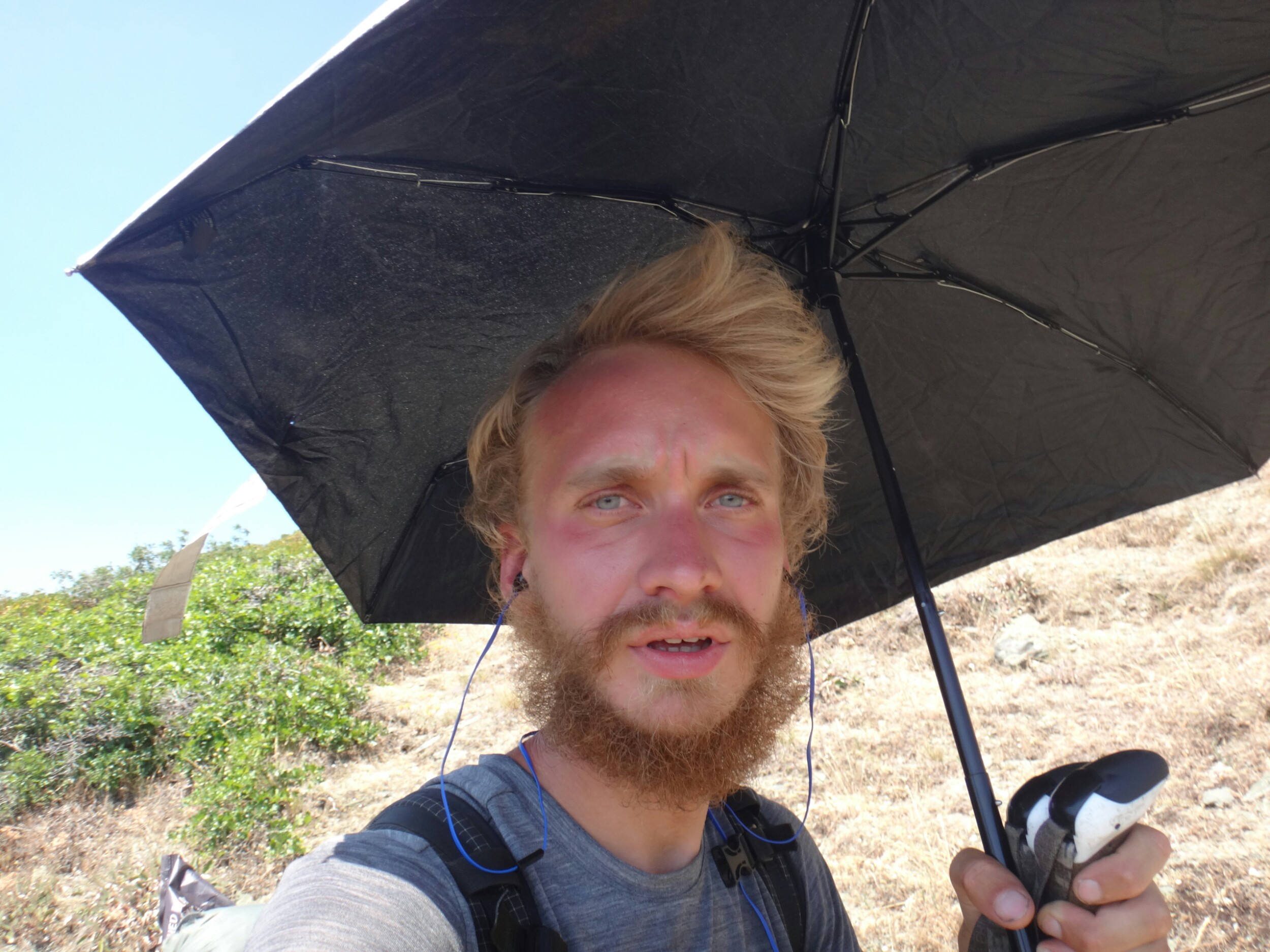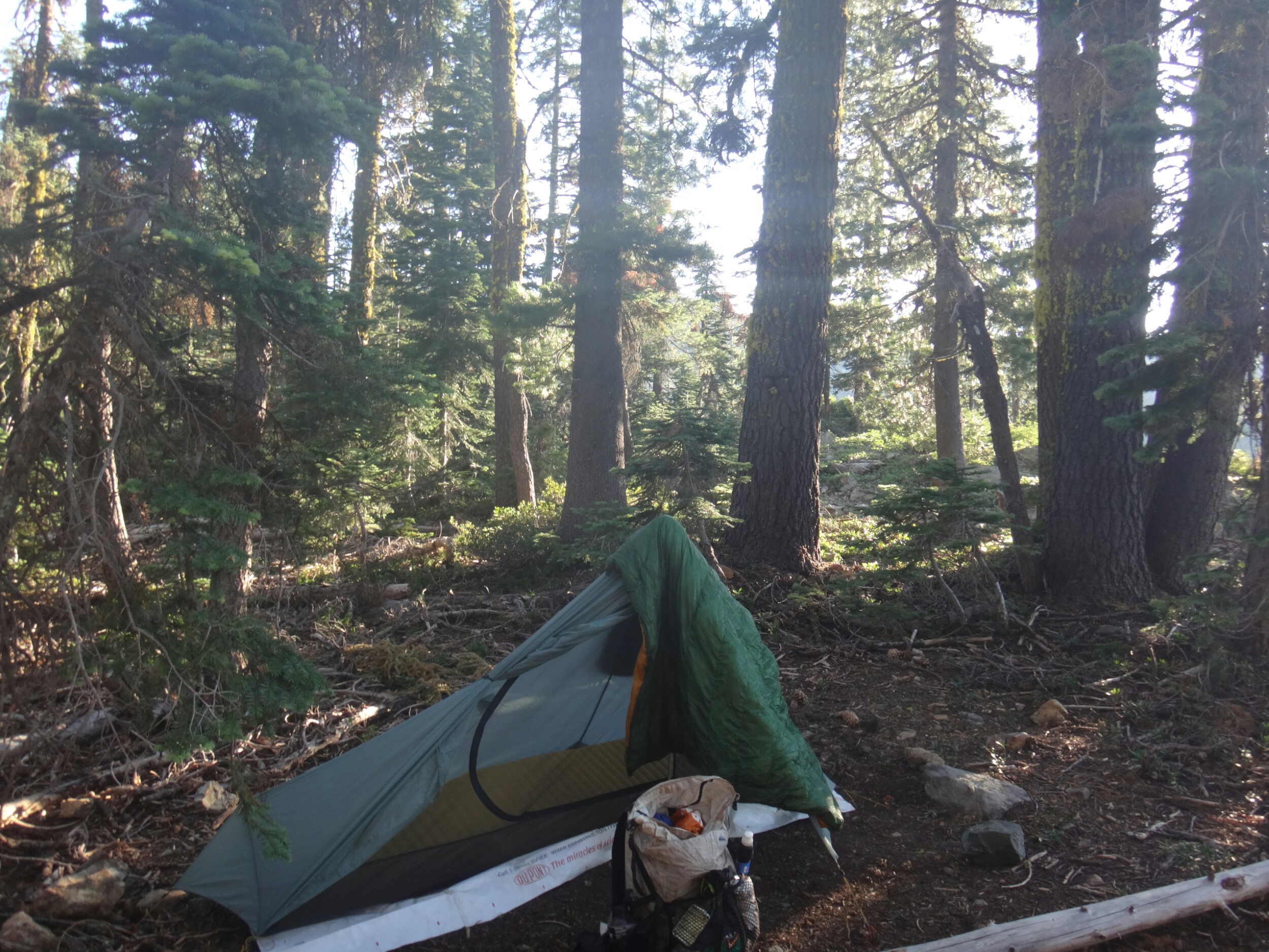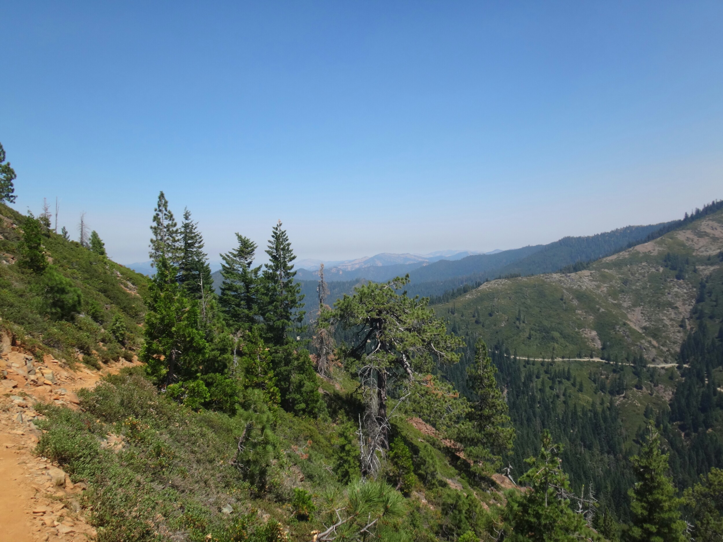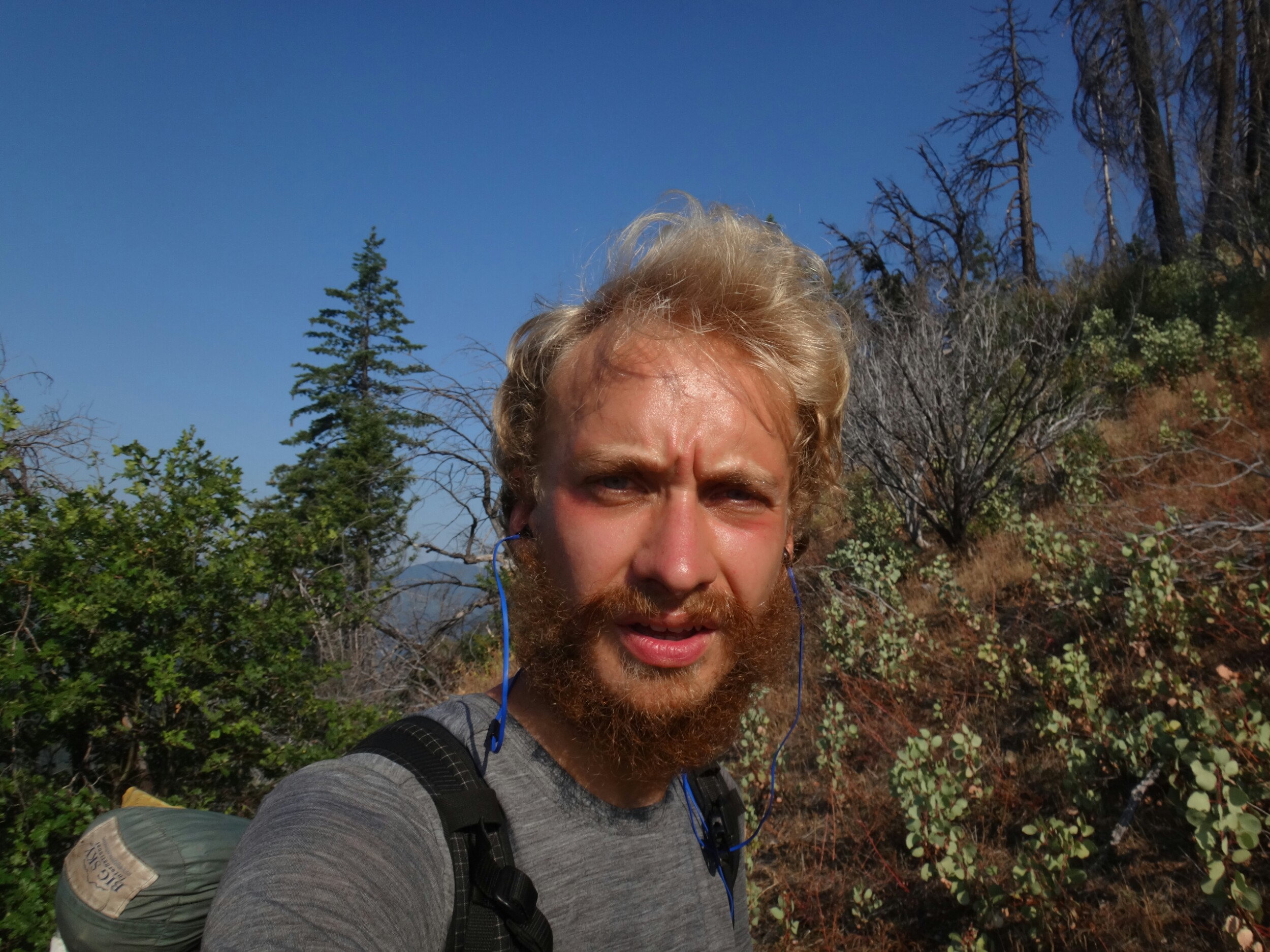 War richtig müde da ich nicht viel geschlafen habe. Deswegen hab ich auch bis 7.20 im Bett gelegen und habe noch 3 Pfannkuchen verdrückt. Dann gings wieder los. Fühlte mich besser als gestern. Aber wieder über die Straße und den gleichen weg hinauf war ein wenig öde bis ich neuen Trail erreichte. An einer langsam fließenden Quelle habe ich noch aufgefüllt und wurde von Moskitos belagert. Dann habe ich Musik aufgelegt und bin durchgestartet. Schließlich wartete ein Anstieg über 1700 Meter auf mich. Also gab ich Gas. Über viele Serpentinen ging es teilweise durch Wald aber auch durch offene Buschfelder. Im Tal lag der große Fluss. Ich atmete schwer und bekam so eine Fliege in den Rachen. War das ekelig. Ich hustete und würgte, kotzte und schlug mich dann mit Übelkeit weiter hinauf. Bähhh. War wirklich nicht angenehm. Dafür konnte ich nach dem ersten steilen Stück im Bergschatten wandern bis ich wieder die Seite wechselte. So ging es füe einige Stunden hinauf. Man kann so schon von weitem sehen an welchen Stellen man später wandert. Das ist gute Motivation und macht es einfacher kurze Zwischenziele zu erreichen. Es ging ein kleiner Wind der es ein wenig erträglicher machte. Nach halber Strecke ging es kurz in eine kleine grüne Oase bevor es wieder in wüstenähnlichen Konditionen am Berg entlang ging. An einer Forststraße lagen schon einige Hiker im Schatten und ich machte auch eine Pause und holte Wasser. Shaggy der gestern Abend schon los ist treffe ich auch. Er macht auch langsam da er ebenfalls Shinsplints hat und ein paar taube Stellen unter dem Fuß. Um 14 Uhr ziehe ich den Sonnenschrim. Es ist ausgesetzt und heiß. Die Heuschrecken knattert und fliegen laut durch die Gegend. Rauf und runter. Ich treffe weitere Hiker und wir machen im Schatten Pause. Ich zerreiße mein Wasserbeutel der ohnehin schon nicht ganz dicht war vollständig. Nahe der Quellen ist alles super grün und tausende Blumen blühen am Wegesrand. Die Bäume sind voller Moos. Auf den letzten 5 Kilometern bis zum Camp fließt mir dann Wasser an der Seite hinunter. Am Ende habe ich ein wenig mehr als einen Liter übrig. Das reicht aus. Wir campen mit Shaggy und Austin einen Sektionhiker und plaudern noch eine Weile. In der Ferne steht überall Rauch vor den Bergen. Es sind einige Brände im Gange. Mein Rucksack ist nass, ebenfalls mein inneres. Ausgerechnet heute ist auch mein Packsack vom Schlafsack gerissen. Das habe ich aber erst gemerkt als ich ihn auspackte. In den letzten Sonnenstrahlen liegt er noch auf dem Boden zum trocknen. Dann gehts ins Zelt. Ohne Schlafsack schlafe ich ein und hole ihn erst in der Nacht als es ein wenig abkühlt.