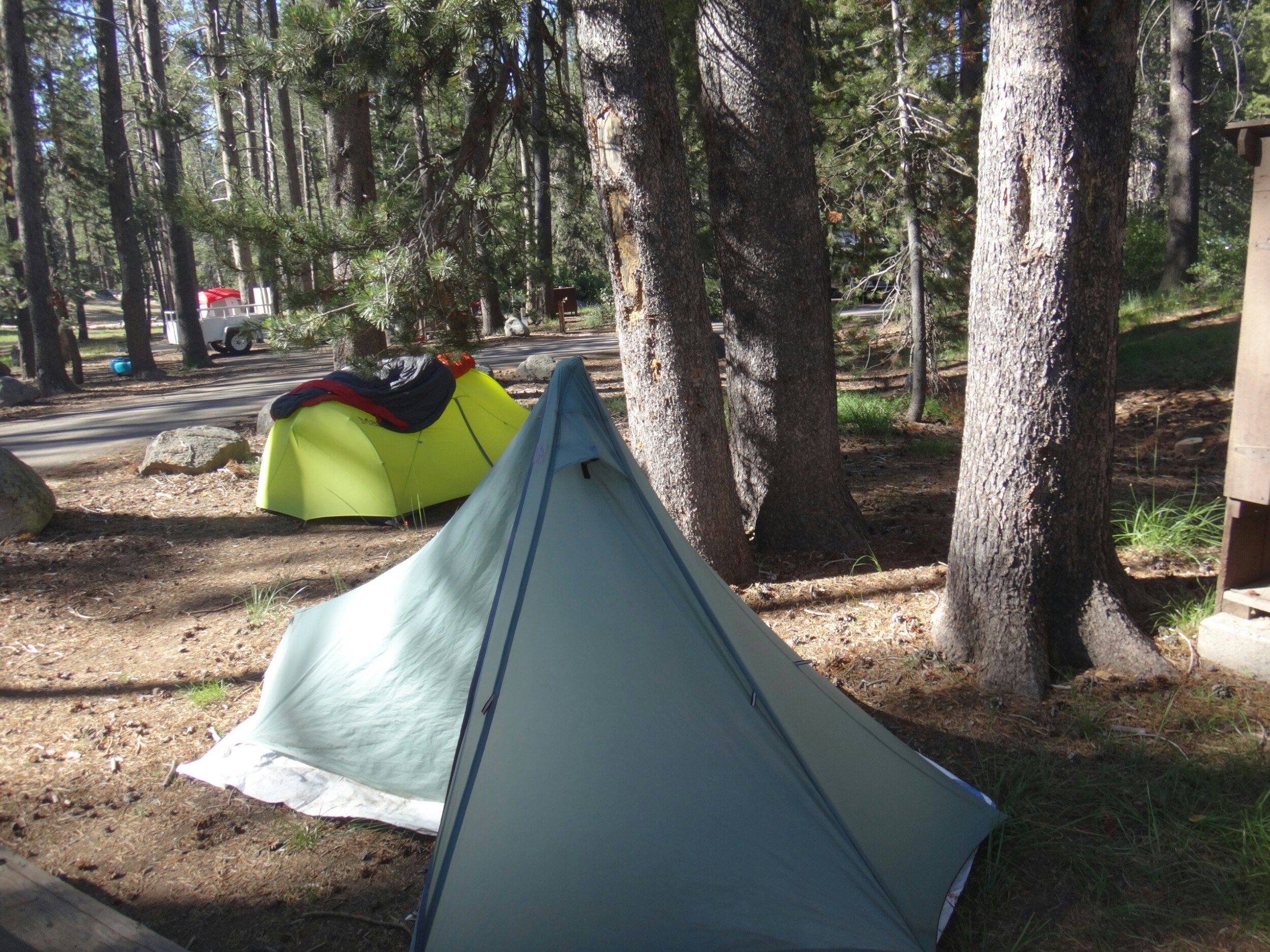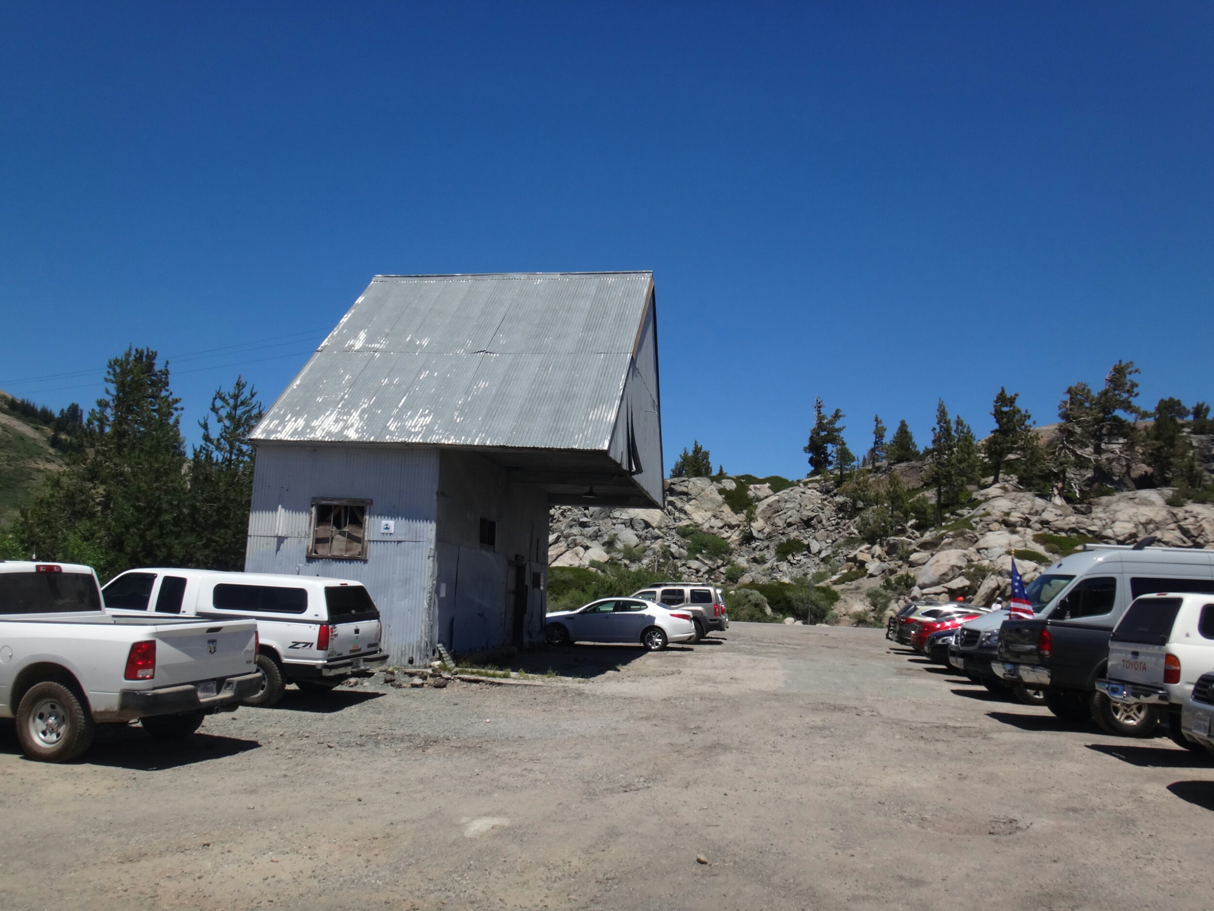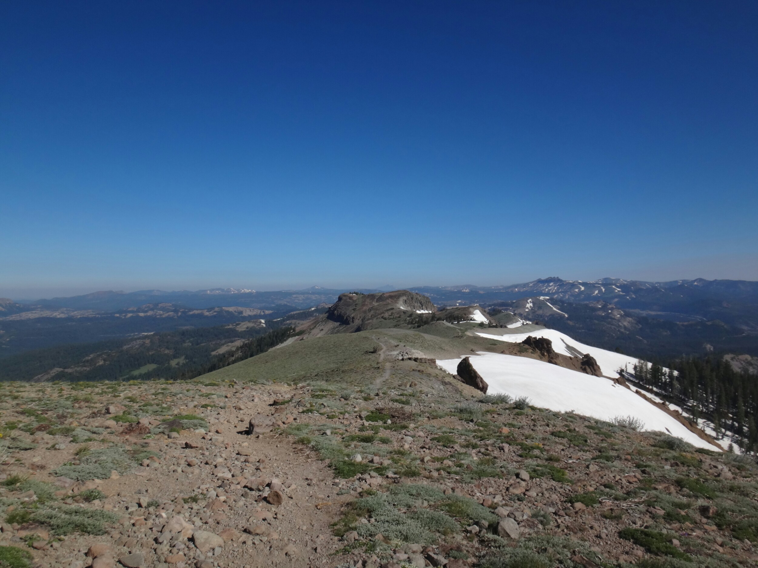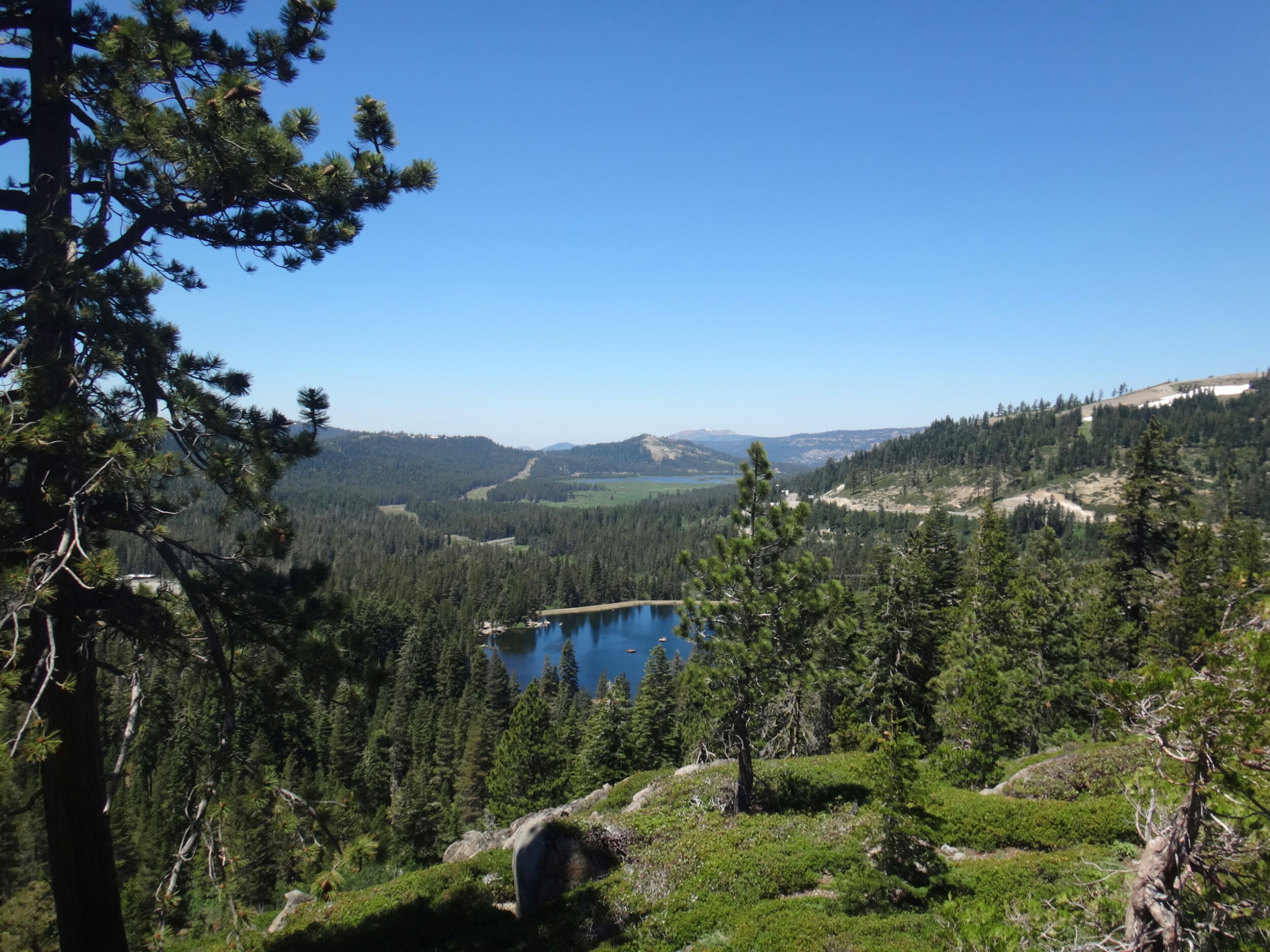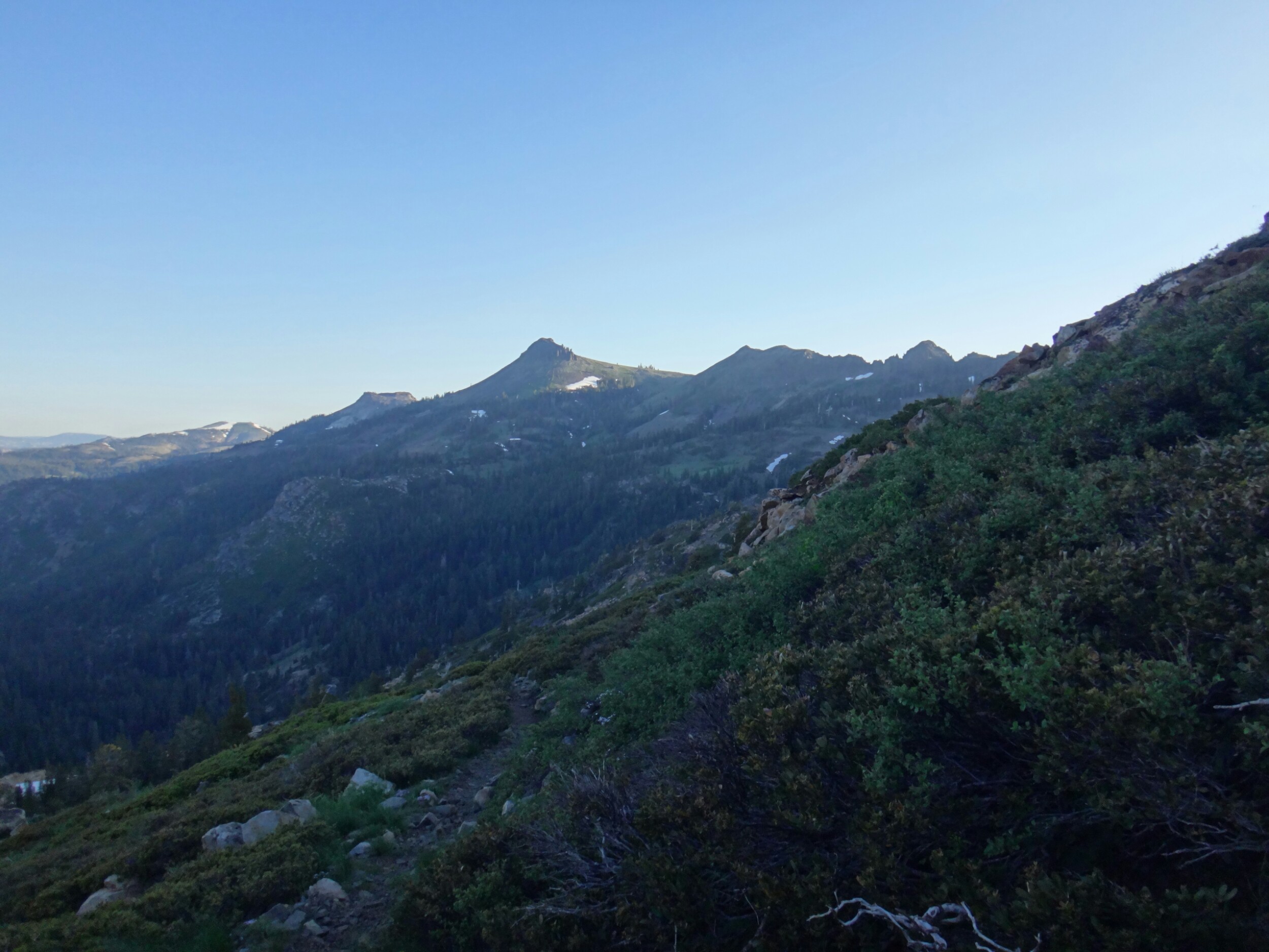 Über dem Bergrücken glühte derweil schönes orange. Die Sonne machte dich bereit und wir gingen für ein paar Minuten auf der obenliegenden Steinwand in Stellung. Die Pause zog sich, obwohl es sehr windig war, lange hin. Bei der Aussicht die wir hatten auch keine Frage. Nebenan schliefen noch 4 Israelis und ein Franzose. Als alle mit essen und rauchen fertig waren konnten wir endlich weiter. Wir waren nun im Squaw Vally Skiresort. Unter einem Lift ging es nur mit Spikes da es definitiv eine schwarze Piste war. Während wir den zweier Sessel unterquerten kam auch die Sonne zum vorschein. Wow! Super toll. Der Berg in der Ferne waren alle von einem nebligen Dunst umgeben. Der South Lake lag ebenfalls geheimnisvoll zur rechten. Was für ein Anblick. Über weitere Pisten liefen wir dann immerhin gemütlich bergab und hielten uns unter der Ridgeline. RocDoc die führte bat mich kurz um hilfe ob wir eine direkte Linie nehmen können da sie die topographische Karte nicht auf der App hatte. Ich war ziemlich stinkig. Wie soll man ohne diese im Schnee navigieren. Ich meine es wird nur der Trail als rote Linie angezeigt aber nicht die Konturen, Flüsse, etc. Wenn der Trail unter Schnee liegt bringt einem das gar nichts. Versucht man stur dem Trail zu folgen kommt man vielleicht in unpassierbar Steilhänge die im Sommer kein Problem sind aber jetzt richtig haarig. Naja, für den Abschnitt unt der Ridgeline nahm ich dann das Zepter an mich. Wir hätten sonst bestimmt wieder am Ende ewig ein Schneebrett hoch gemusst weil wir so tief unter der Bergkuppe endeten. Auf dem Weg schoss ich noch ein paar tolle Bilder von der morgenstimmung. Nachdem ser schlimmste Part vorbei war, gute und vertrauenswürdige Fußspuren auftauchten ging RockDoc wieder vor. Wir stießen über die Ridgeline und kamen ins nächste Tal welches uns zu Tinkers Knob brachte. Auf dieser Seite war es meist schneefrei. Allerdings mussten wir erst noch eine Pause einlegen. Eigentlich wollten wir nur die Spikes ausziehen. Dann ging es über ein schönen Bergpfad und wie stießen in ein Tal. Wir hüpften über 2 kleine Bäche und begannen den Aufstieg. Es war super warm. Die gsnzen Büsche, der Boden und die umliegenden Felsen speicherten die Wärme. Ich wartete auf die anderen und wechselte derweil in kurze Klamotten. Kurze Zeit später überquerten wir den letzten gelisteten Bach für heute und holten uns Nachschub. Dabei verwandelte sich das Wasserfiltern wieder in eine längere Pause. Wir wollten uns am Gipfel treffen und ich, der die ganze Zeit bereit war, schieß direkt los. Die 1,9 km und ca. 200 Hm vielen in 20 Minuten. Was für ein Spaß. Der kleine Wald am Anfang hatte noch ein paar Hindernisse bereit. Schneewehen und Baumstämme. Der letzte Abschnitt lag aber nur zwischen Büschen. Oben angekommen wartete ich auf die anderen. Das war der letzte große Anstieg für heute. Ab jetzt befanden wir uns auf der Ridgeline. Diese war trocken und hatte einen tollen Trail der sich über den Bergrücken schlängelte. Es blühten Blumen und wir trafen die Israelis wieder. Bis zum nächsten Skigebiet am Mt. Lincoln konnten wir so einfache Kilometer machen. Über eine letzte gefährliche Schneetraverse kamen wie auf unseren Finalen Abstieg. Die letzten 7 Meilen sollten laut einer anderen Hikerin eigentlich schneefrei sein. Das stimmte aber mal überhaupt nicht. Bevor wir Höhenmeter fielen ließen mussten wir erst ordentlich am Berg entlang. Überall lagen Schneeberge auf dem Trail die überquert werden mussten. Die Schneeschmelze verwandelte die Waldtrail gleichzeitig in rutschige matschfelder. Je weiter wir runter kamen, kamen uns zig Wanderer entgegen die alle durch das Skigebiet wanderten. Zu viele Leute und 1,5 Meilen vor Schluss ließ ich die Bremsen los. Der Trail war quasi ein Geröllfeld und war perfekt für eine Gangart zwischen schnellen Laufen und Joggen. Ich ließ die meisten Leute mit einem kurzen Gruß hinter mir und kam schnell und ohne große Verzögerung zum Trailhead. Ich musste noch rechts die Straße hoch und fand mich auf dem Parkplatz am Highway 40 wieder. Ich wartete und wartete. 25 Minuten später, die anderen waren nun abgestiegen denn ich hatte einen perfekten Blick aud die letzten Meter, kamen aber nicht. Ich machte mich also auf die Suche und fand sie unten am Parkplatz. Anstatt dem Trail zu folgen waren sie links zu einem kleinen anderen Parkplatz gegangen. Ich war wieder mal ein wenig genervt. Wir suchten uns eine Fahrt die wir schnell bekamen. Da es 4. Juli ist steht alles Kopf. Der See im Tal ist total überfüllt. Überall Flaggen und wir lassen uns am Campingplatz absetzen. Wir reservieren einen Platz und laufen ein paar hundert Meter die Straße hinunter. Dort erwartet uns Taco Bell und wir genießen Klimaanlage und kalte Getränke zu unseren Speisen. Das Wifi ist schrecklich. Ich kann nicht mal telefonieren geschweige denn Fotos hochladen. Zurück am Zeltplatz bauen wir auf, duschen und gammeln. Rocky und Peaks kommen auch noch vom Trail. Das Feurwerk lassen wir rechts liegen und verziehen uns gegen 20.30 lieber ins Zelt. Ich werde die Downhill Bandits übermorgen voraussichtlich verlassen. Es ist Zeit Kilometer zu kloppen. Ich hab noch 2400000 Meter vor mir. Am Donnerstag bin ich hoffentlich in Sierra City. Morgen ein wenig mit meinen Freunden und den Tag danach die restlichen Kilometer bis Sierra City. Hoffe wir machen morgen ein paar Kilometer damit es nicht zu krass wird.