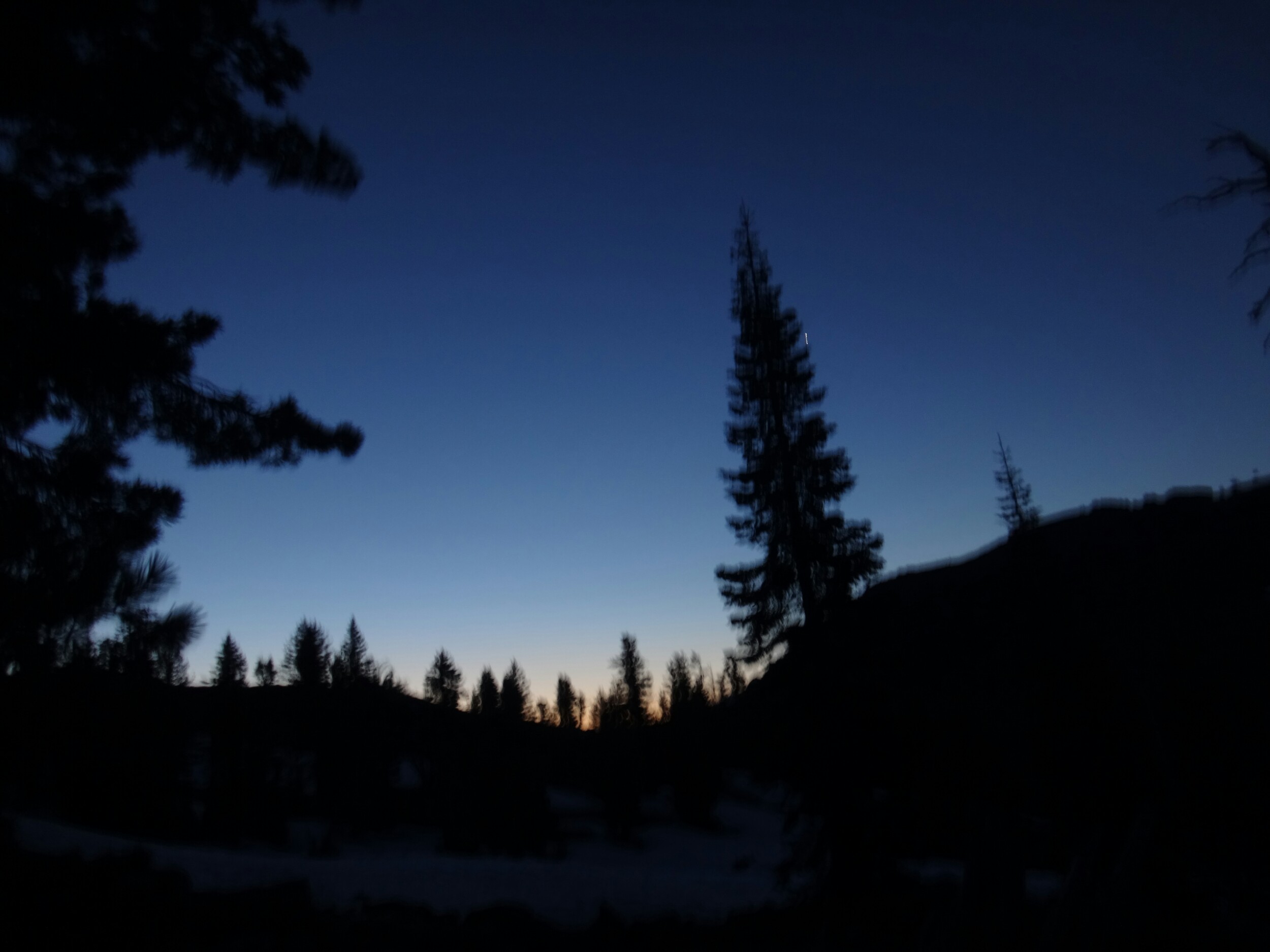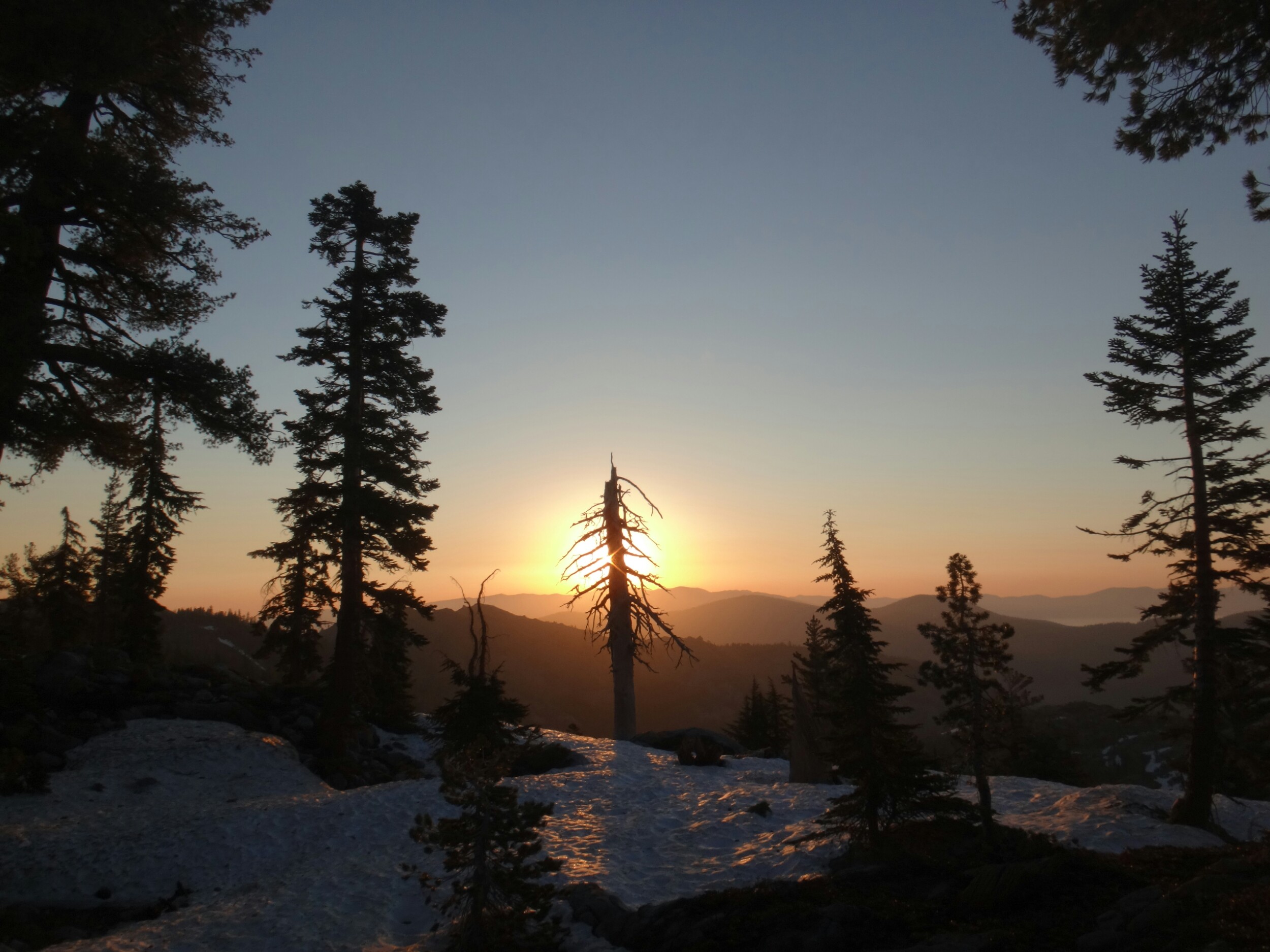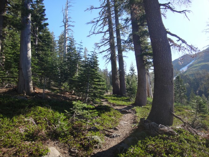 Um 3.25 klingelte der Wecker. Ziemlich früh. Aber wir wollten auch zum Mittag in Truckee sein. Ich war in 25 Minuten mit Packen fertig und aß noch mein Frühstück. Es war gefühlt frisch auch bei 8 Grad. RocDoc führte uns über unseren Baumstamm und dann den Wald hinauf. Der Schnee war matschig. Der Trail bald nicht mehr zu sehen und wir liefen wieder quer Feld ein. Als der Trail auftauchte nahm sie die falsche Seite und wir mussten nach ein paar Minuten umdrehen. Halb so schlimm. Der Wald lichtete sich und wir fanden wieder Spuren unserer Vorgänger denen wir einfach folgen konnten. Der Himmel half dabei und wurde von Minute zu Minute heller. Über den American River liefen wir über den Schnee. Nur Teile der Schneedecke waren eingefallen und entblösten einen tropfenden breiten Wasserteppich. Was für eine Schmach am 4. Juli dachten uns Rattler und ich. 😉