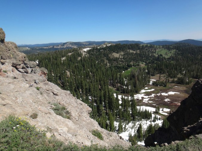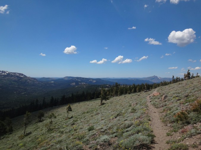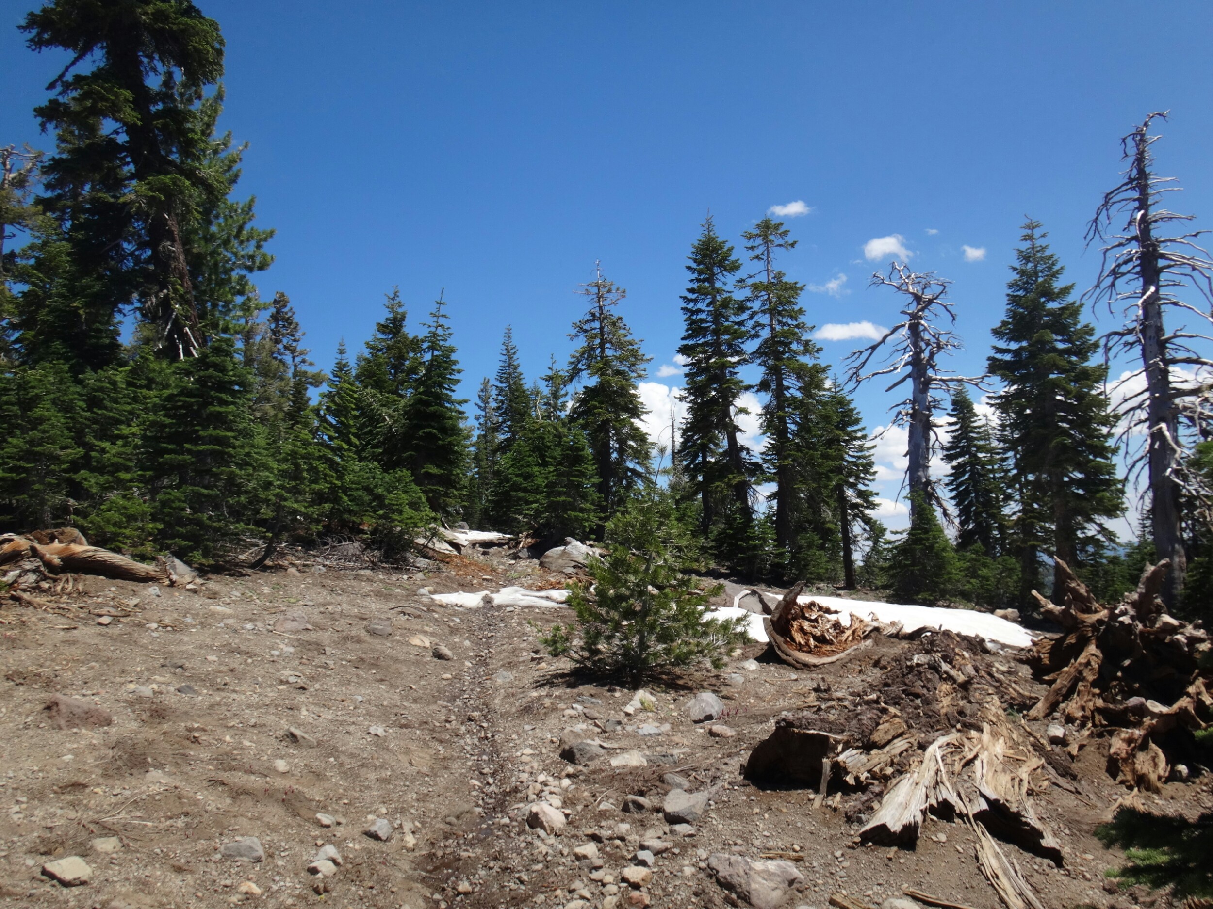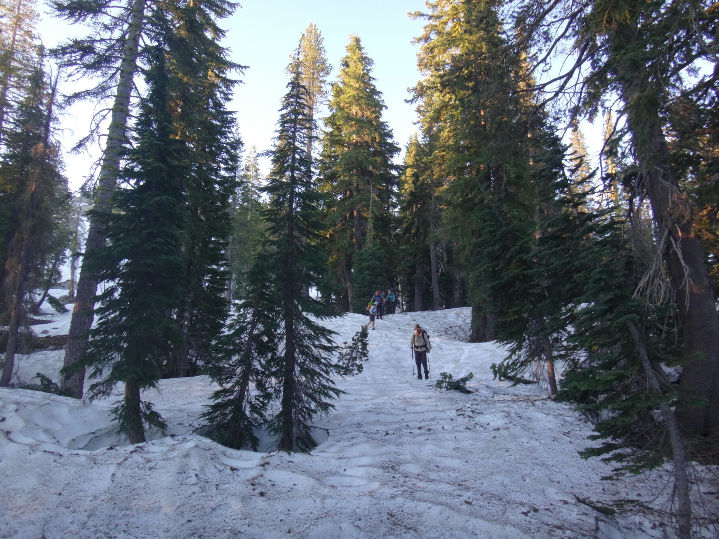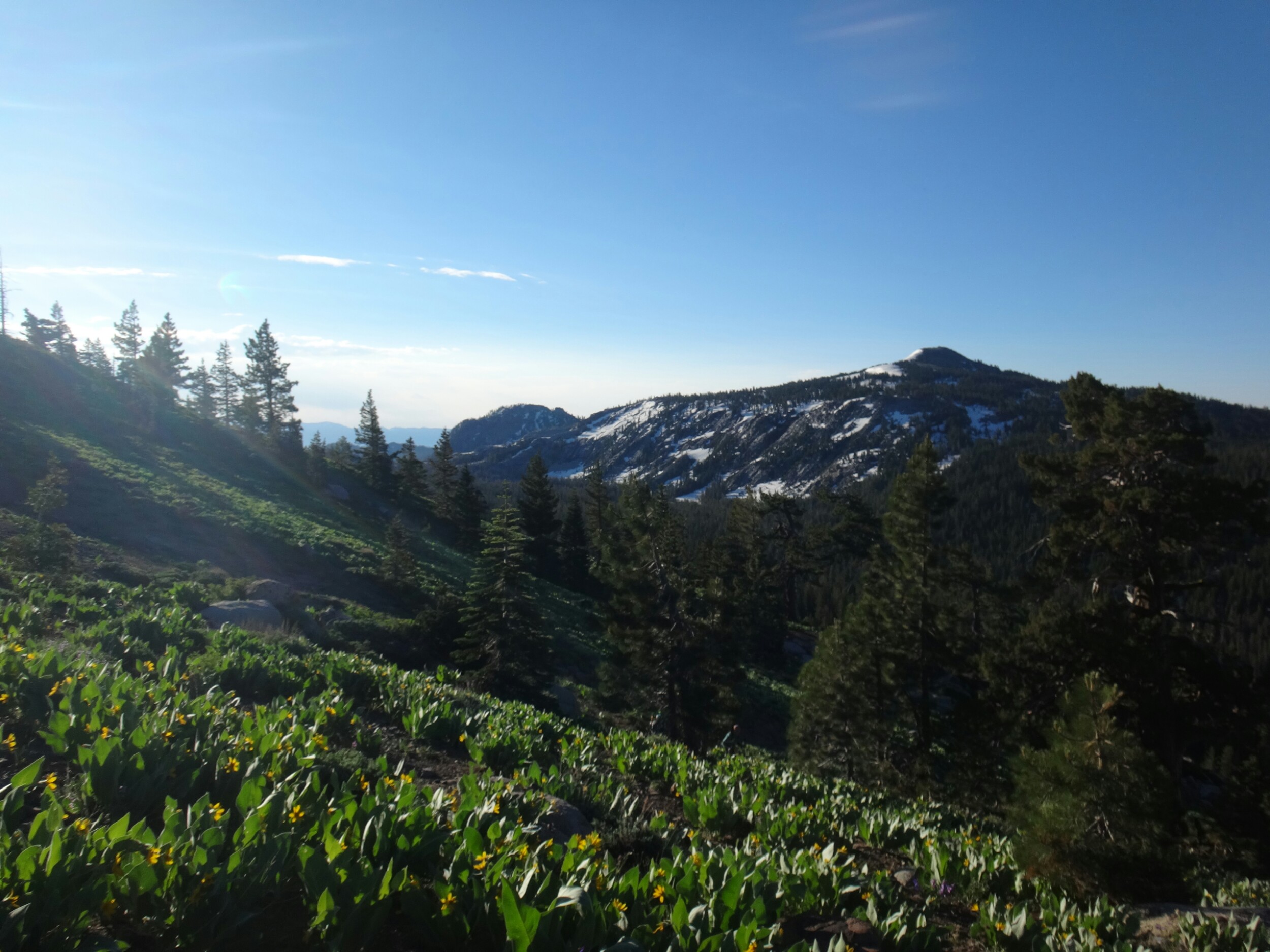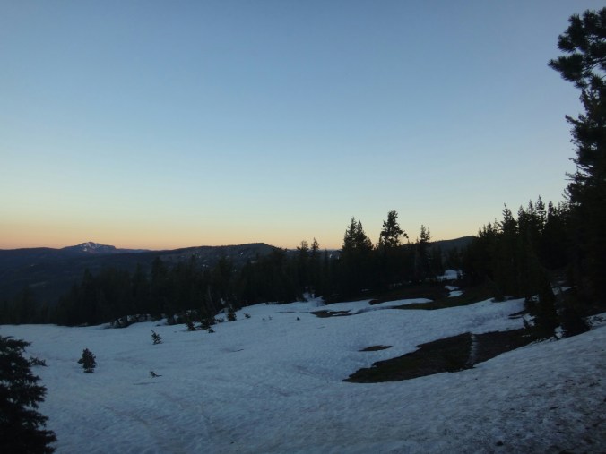 Als wir uns vor der Hütte alle zurecht gemacht haben konntem wir uns noch köstlich über die Nacht amüsieren. Was für ein Spaß. Durch das flache Grastal ging es Richtung Felsklippen. Den Fluss im Tal querten wir über eine Schneebrücke und gleich danach stapfte ich mit meinem linken Fuß tief in eine Pfütze. Bravo 😀 noch mehr zu Lachen für uns. Wir steigen einen von insgesamt 5 der heute fälligen Hügel hinauf. Es ist immer noch alles weiß und wir schlagen uns quer Feld ein bis wir ein wenig Trail finden dem wir einfach folgen können. Trotz der frühen Morgenstunden werden wir nicht mit einem grandiosen Sonnenaufgang belohnt. Die Abstiege kürzen wir in direkter Linir durch Wälder ubd über Schneedecken ab. Der richtige Trail ist nicht zu finden oder nur erschwert zu verfolgen. Die im Tal liegenden Flüsse haben alle eine Brücke. Sehr ungewöhnlich für uns. Ich sehe seit langen wieder ein Reh. Auch ein einsames Zelt passieren wir gegen 8 Uhr morgens. Die Aufstiege führen uns immer erst durch tiefdunklen Wald. Viele Bäume sind am Boden, Bruchstücke liegen weit verteilt. Teilweise wie auf einem Schlachtfeld. Weiter oben verschwinden die Bäume und über einen Schotterpfad geh es entlang des Berges bis zum Bergrücken hinauf. Die Blumen blühen und überall fliegen kleine Tierchen umher. Auf dem dritten Hügel legen wir wieder eine Pause ein. Wir lachen immer noch über den geohrstöpselten Schnarcher. Der Anbstieg dauert dieses Mal etwas länger und wir traversieren ein wenig im Schnee. Ich nehme vor einem Abhang anlauf und springe hinein. Mit den Schuhen gleite ich wie so oft bis unten. Was für ein Spaß. Der Schnee wird langsam weniger und wir laufen über trockene Ridgeline. Die Sonne bruzelt ordentlich und wir sind froh vom Schnee runter zu sein. Durch einen Wald geht es dann wieder bergab. Ich verkünde bei einer kleinen Pause, gegen 11.30Uhr, das wir die letzten zwei Berge noch besteigen und 11 km laufen bevor wir Mittagspause machen. Das kommt nicht überall gut an. Aber ein bisschen Grenzerfahrung hilft manchmal. Ich schlage geradeaus den Wald hinauf und als ich oben auf dem Trail stehe geht Rattler nur wortlos an mir vorbei. LovelyHeart hat mich ebenfalls schon mehrfach verwunschen. Sie ist aber zu weit hinten und ich höre sie nicht. Es geht stetig bergauf und auch hier kommen wir auf dem Gipfel in den Genuss toller Aussichten. Dunkelblaue Seen eingehüllt in immergrüne Laubwälder oder eingezäunt von grauen Granitfelsen. Der Abstieg ist wieder eine Rurschpartie und ich denke schon das die Emotionen so langsam überkochen 😉 Aber alle halten brav durch und machen auch noch den letzten Anstieg über 1,8 km in praller Sonne mit. Auch mir geht jetzt die Pumpe und ich bin froh das ich durch die Buschsauna am Höhepunkt angekommen bin. Im angrenzenden Wald legen wir Mittagspause ein. In weniger als 2 Stunden haben wie gerade 11km gemacht. Von 4.30 – 12.30 haben wir insgesamt 24 km zurückgelegt. Lektion angekommen. Von nun an geht es zun Glück nur noch bergab. Seicht schlängelt sich der Pfad am Berg entlang. Viele Blumen und viel Sonne. Der Trail staub arg und bald sind die Schuhe und Beine grau. Wir kommen toll voran und machen erst an einem Fluss halt um Wasser zu tanken. Jetzt werden die Füße so langsam schwer aber bergab geht immer. Griz läuft voraus und ich lasse meine Beine einfach machen. Tolle Wälder. Im Tal bauen wir in einem kleinen Walsstück unsere Zelte auf. Der Fluss ist direkt nebenan. Vereinzelt trudeln später noch Wanderer von der Hütte ein. Morgen gehts um 4 wieder los in die Stadt. Um 10 öffnet das Post Office und vorher muss ich noch Bilder hochladen. Schuhe abholen und Eisaxt verschicken. Hoffentlich ist das Wlan gut. Anschließend gehts direkt zurück auf den Trail. Vielleicht finde ich ja schnell einen neuen Wanderpartner. Jeder der die Strecke bis hierher von der Hütte gepackt hat ist auf jeden Fall qualifiziert 😉