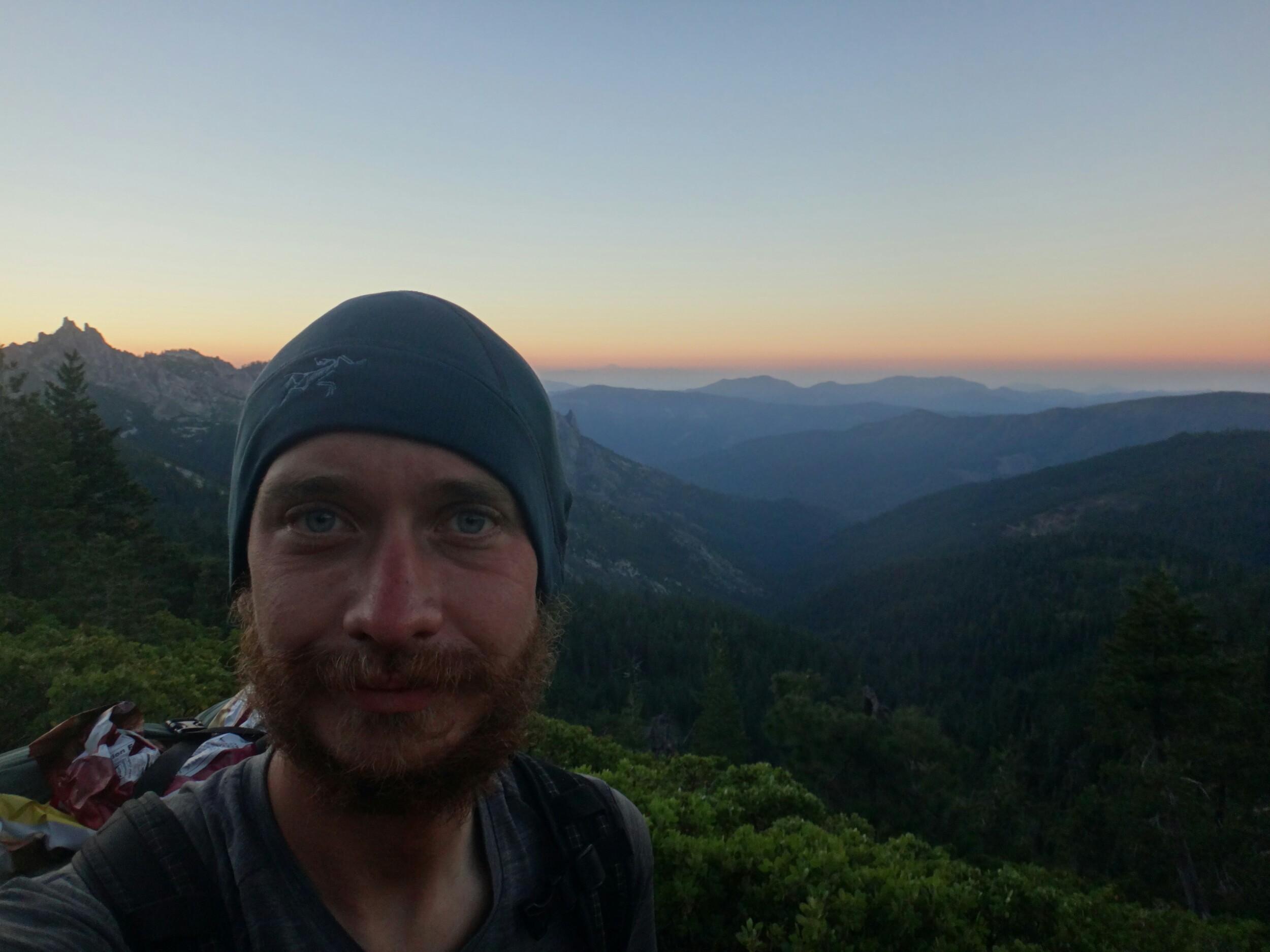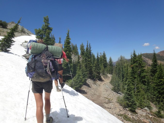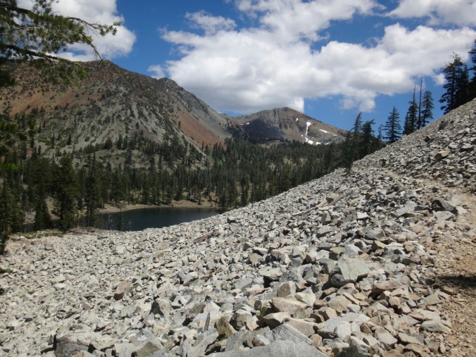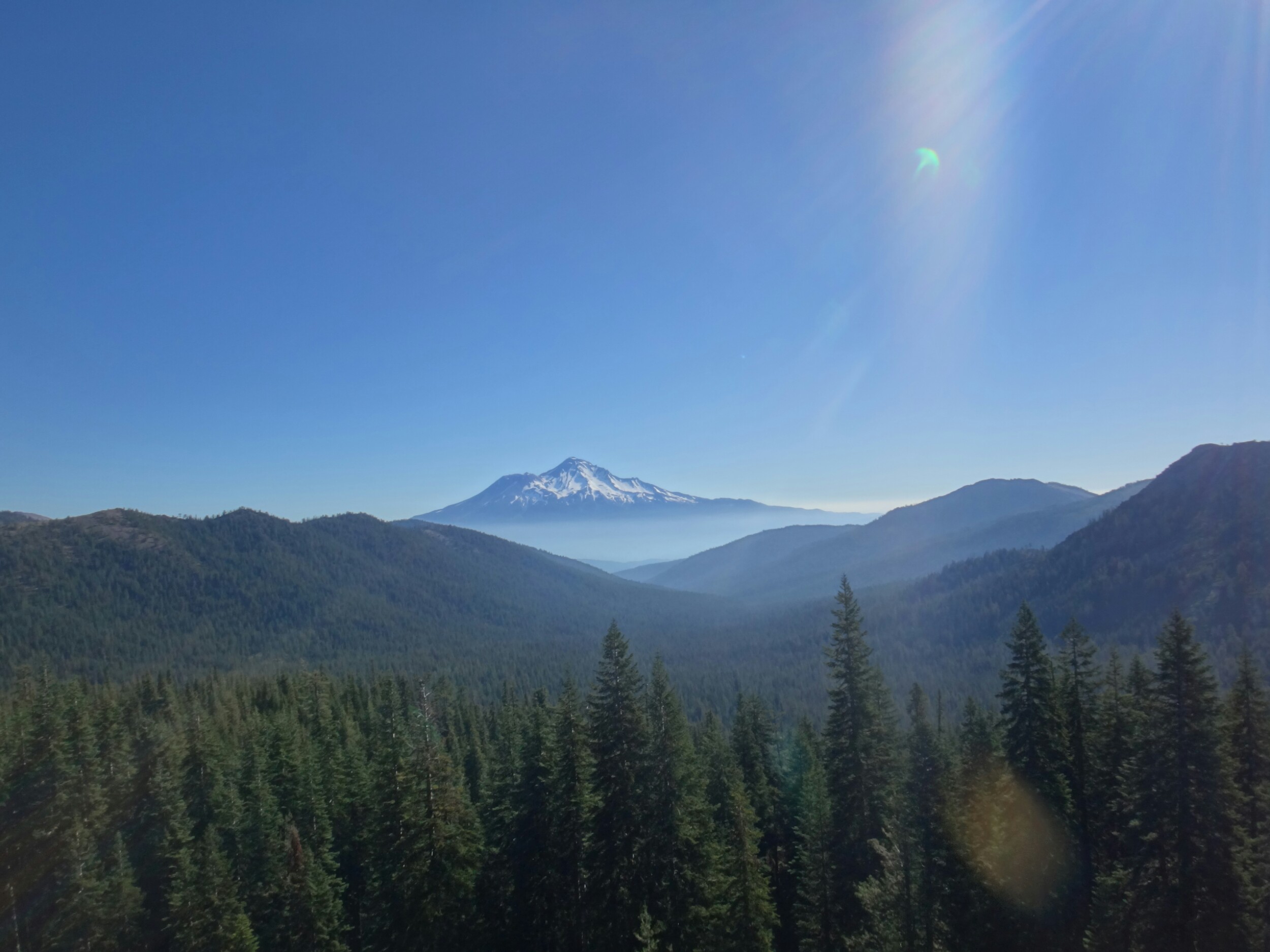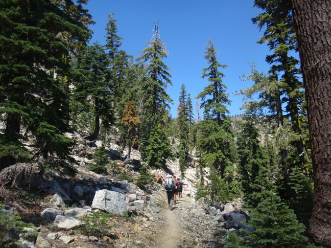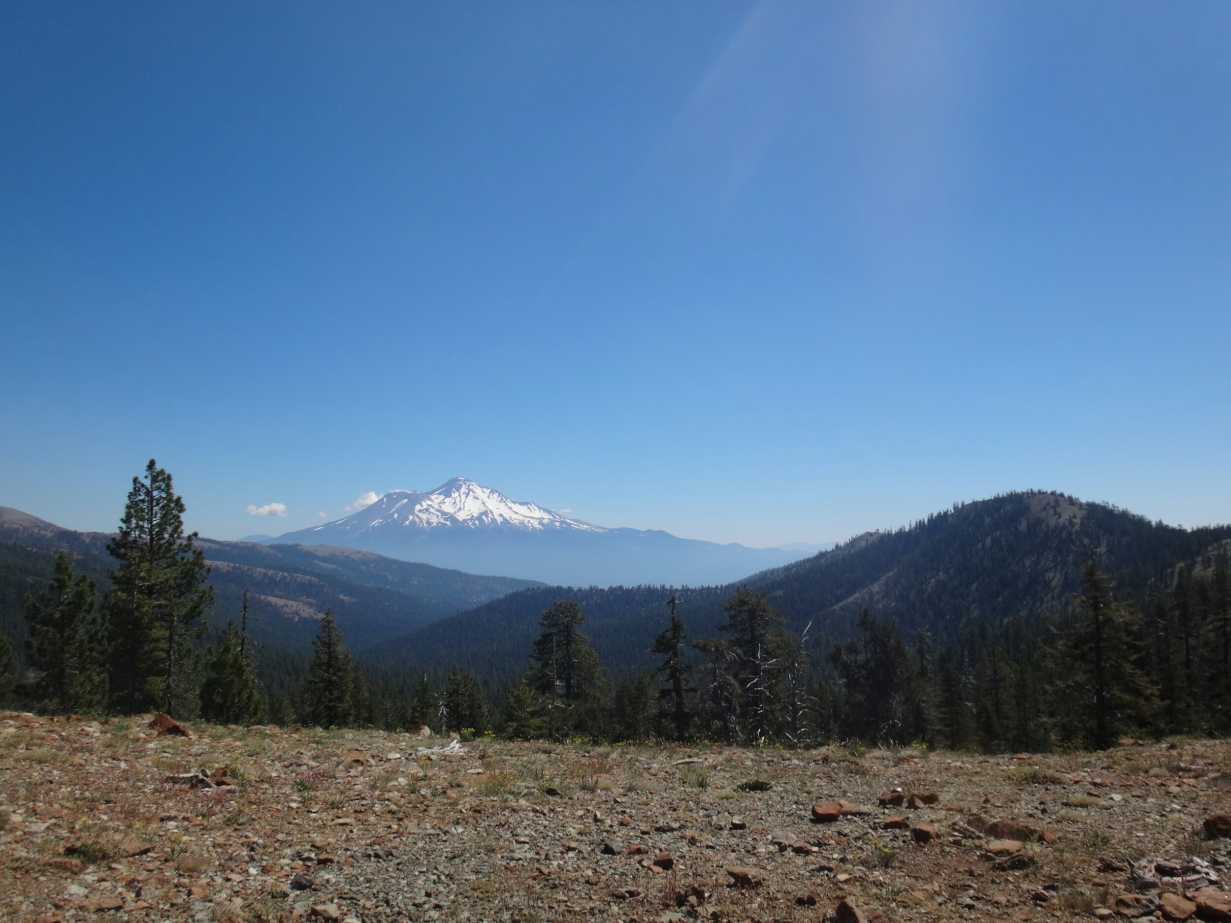 Die meisten stehen schon um 4 auf um den Sonnenaufgang 3 km weiter oben zu genießen. Ich gehöre nicht dazu und treffe erst gegen 6.30 am nächsten Campplatz ein. Mt. Shasta liegt im blauen Dunst. Wir hängen noch ein wenig herum und wandern dann weiter. Es geht durch ein Tal hinauf bevor wir auf der anderen Seite wieder Absteigen und zu einem Parkplatz kommen. Ich lege wieder eine Pause ein da meine Schienbeine schmerzen. Also lasse ich es ein wenig langsamer angehen. Die Gruppe überholt mich und ich treffe erst an einer Quelle auf dem Trail wieder auf sie. Wir essen zusammen und laufen dann gemeindam weiter. Das Gelände ist sehr speziell. Viele Seen, Geröll und Bäume wie im Gebirge. Sehr schön. Nachdem wir uns den letzten Anstieg für heute hoch gearbeitet haben machen wir nach einem kleinen Schneefeld unsere Mittagspause. Aber hier geht es größtenteils bergab und wir laufe die meiste Zeit am Berghang. Wir sehen viele Seen und Geröllfelder. An einem weiteren Parkplatz 10km vor unserem Campplatz gibt’s wieder Pause. Meine Schienbeine sind jetzt richtig übel. Bei jedem Tritt zieht ein böser Schmerz von unten nach oben über meine Knochen. Ich versuche an den anderen dran zu bleiben da die Gruppe einen gut mit zieht. Nach 5,5 km lasse ich mich aber ein wenig zurückfallen. Nur wenig später komme ich am Zeltplatz an der gut besucht ist. Wir kochen zusammen und ich verziehe mich ins Zelt. Ich brauche auf jeden Fall eine Pause bevor es noch schlimmer wird und die Genesung Wochen dauert. Morgen gehts nach Etna.