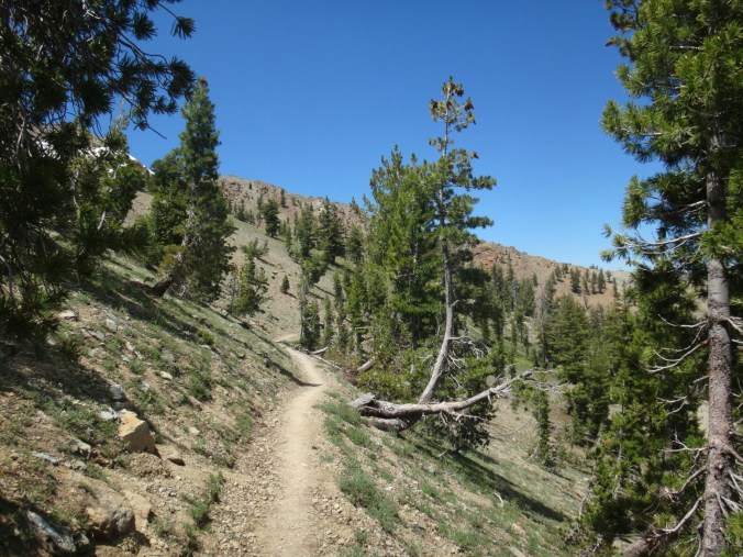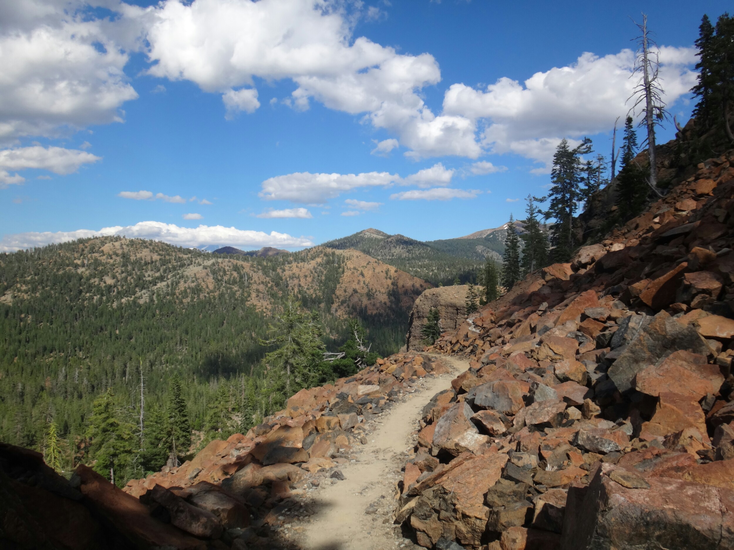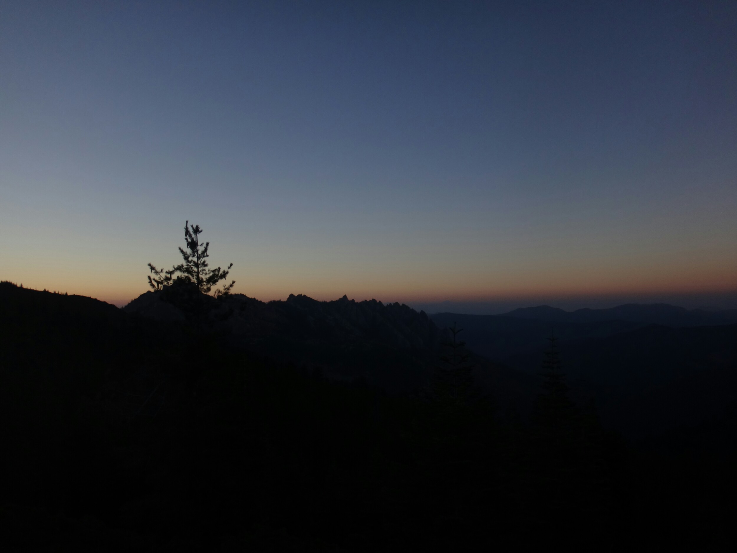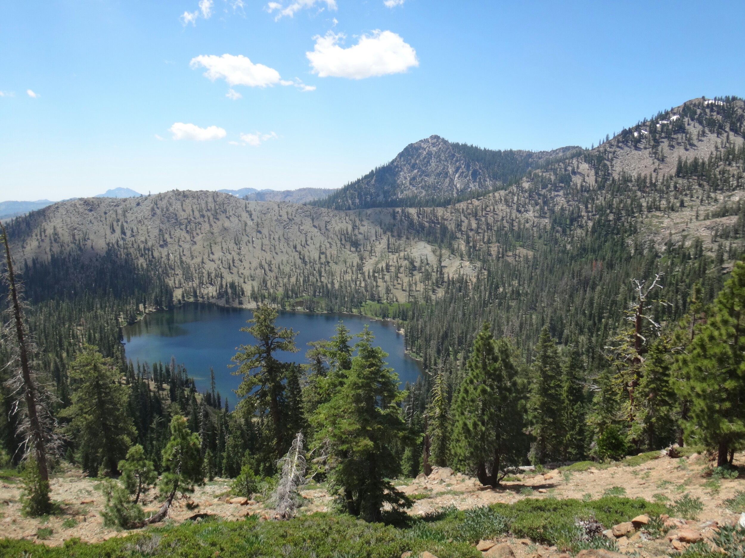 Die meisten stehen schon um 4 auf um den Sonnenaufgang 3 km weiter oben zu genießen. Ich gehöre nicht dazu und treffe erst gegen 6.30 am nächsten Campplatz ein. Mt. Shasta liegt im blauen Dunst. Wir hängen noch ein wenig herum und wandern dann weiter. Es geht durch ein Tal hinauf bevor wir auf der anderen Seite wieder Absteigen und zu einem Parkplatz kommen. Ich lege wieder eine Pause ein da meine Schienbeine schmerzen. Also lasse ich es ein wenig langsamer angehen. Die Gruppe überholt mich und ich treffe erst an einer Quelle auf dem Trail wieder auf sie. Wir essen zusammen und laufen dann gemeindam weiter. Das Gelände ist sehr speziell. Viele Seen, Geröll und Bäume wie im Gebirge. Sehr schön. Nachdem wir uns den letzten Anstieg für heute hoch gearbeitet haben machen wir nach einem kleinen Schneefeld unsere Mittagspause. Aber hier geht es größtenteils bergab und wir laufe die meiste Zeit am Berghang. Wir sehen viele Seen und Geröllfelder. An einem weiteren Parkplatz 10km vor unserem Campplatz gibt’s wieder Pause. Meine Schienbeine sind jetzt richtig übel. Bei jedem Tritt zieht ein böser Schmerz von unten nach oben über meine Knochen. Ich versuche an den anderen dran zu bleiben da die Gruppe einen gut mit zieht. Nach 5,5 km lasse ich mich aber ein wenig zurückfallen. Nur wenig später komme ich am Zeltplatz an der gut besucht ist. Wir kochen zusammen und ich verziehe mich ins Zelt. Ich brauche auf jeden Fall eine Pause bevor es noch schlimmer wird und die Genesung Wochen dauert. Morgen gehts nach Etna.