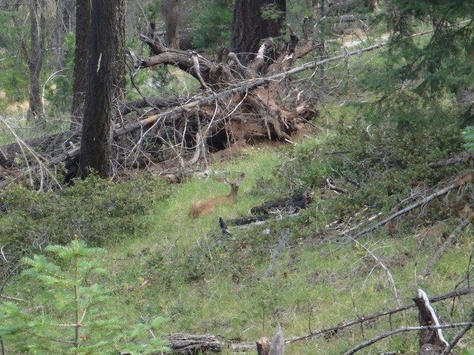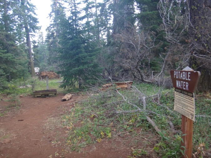 Verdammt war es kalt. Um 5.30 aufestanden und dann aber Gas gegeben um schnell zu starten. Es waren nur 13 Grad. Ich lief los und wärmte mich zum Glück schnell auf. Ich schreckte ein paar Rehe auf und füllte an einem Wasserhahn meinen Wasservorrat. Der Trail schlängelt sich an den vielen Seen und Resorts entlang ohne diese wirklich zu berühren. Das zieht sich ewig und mir hängt der gestrige Tag arg in den Knochen. Also viele Pausen und Shaggy und Hui holen mich ein. Wie kommen für die meiste Zeit nicht aus dem Wald hinaus. Dafür geht es schön einen langen Anstieg hinauf. Ohhg. Einfsch ein Fuß nach dem anderen. Eigentlich ganz einfach. Aber als wir am Nachmittag auf die letzten 10km stoßen muss ich schon stark dran glauben. Der Ausschlag ist zwar wieder abgeschwollen aber meine Füße sind müde und jetzt beginnt der Vulkanabschnitt. Wir laufen auf zerbrochenen Vulkangestein und schlängeln uns an einem Berg entlang. Jede Mündung in den Berg nehmen wir mit. Dafür gibt es erste Aussichten auf einen Schneebedeckte Berg der vor uns liegt und an dem wir heute zelten. Auch wenn es nicht weit ist dauert es mit den ganzen extra Kurven doch ewig und ich bin heil froh als endlich der Highway zu hören ist. Meine Beine sind wie Wackelpudding. Am Parkplatz hängt eine Information. Wegen Feuer ist der Trail ab der Sevenmile Abzweigung gesperrt. Ebenso der Crater Lake Trail ist zu. Mal schauen was das wird. Wir laufen morgen erst mal weiter und schauen was so abgeht. Zum Glück campen wir direkt am Fluss und ich kann meine Füße und Beine waschen die total eingestaubt sind. Auch ein paar Kilo Sand kann ich aus meinen Schuhen kippen. Als ich gerade meinen rechten Fuß wasche kommt RockDoc den Trail hinunter. Sie und Rattler campen ein paar Meter weiter oben 🙂 . Zum Abendessen habe ich natürlich Kartoffelpüree und eine Instant Nudelsuppe. Irgendwas neues mit Meeresfrüchten. Ist nicht der Bringer, dafür aber sehr scharf und mit mehr Kalorien als die normale Ramen Suppe. Heute liege ich gegen 20.40 Uhr im Bett.
