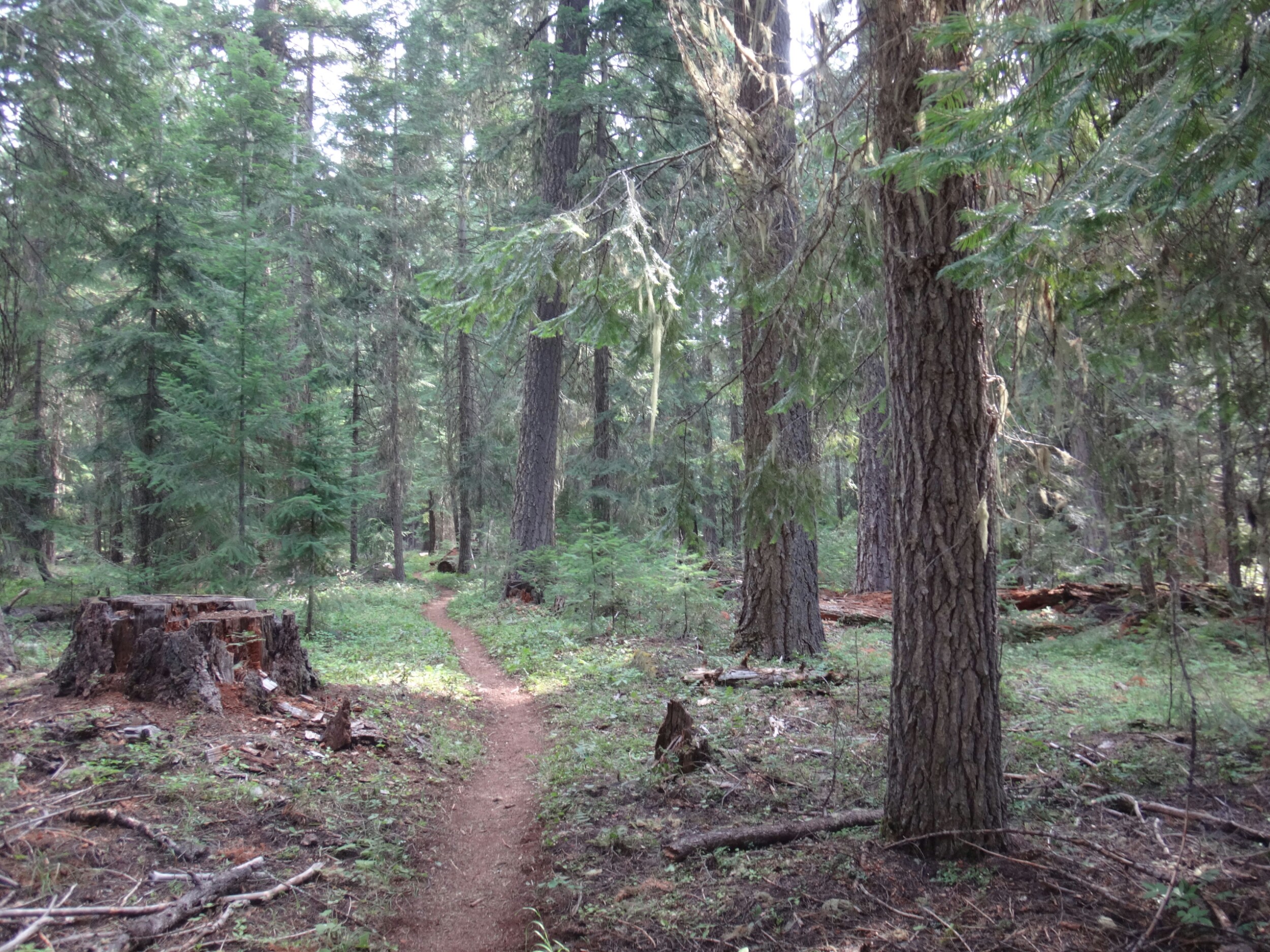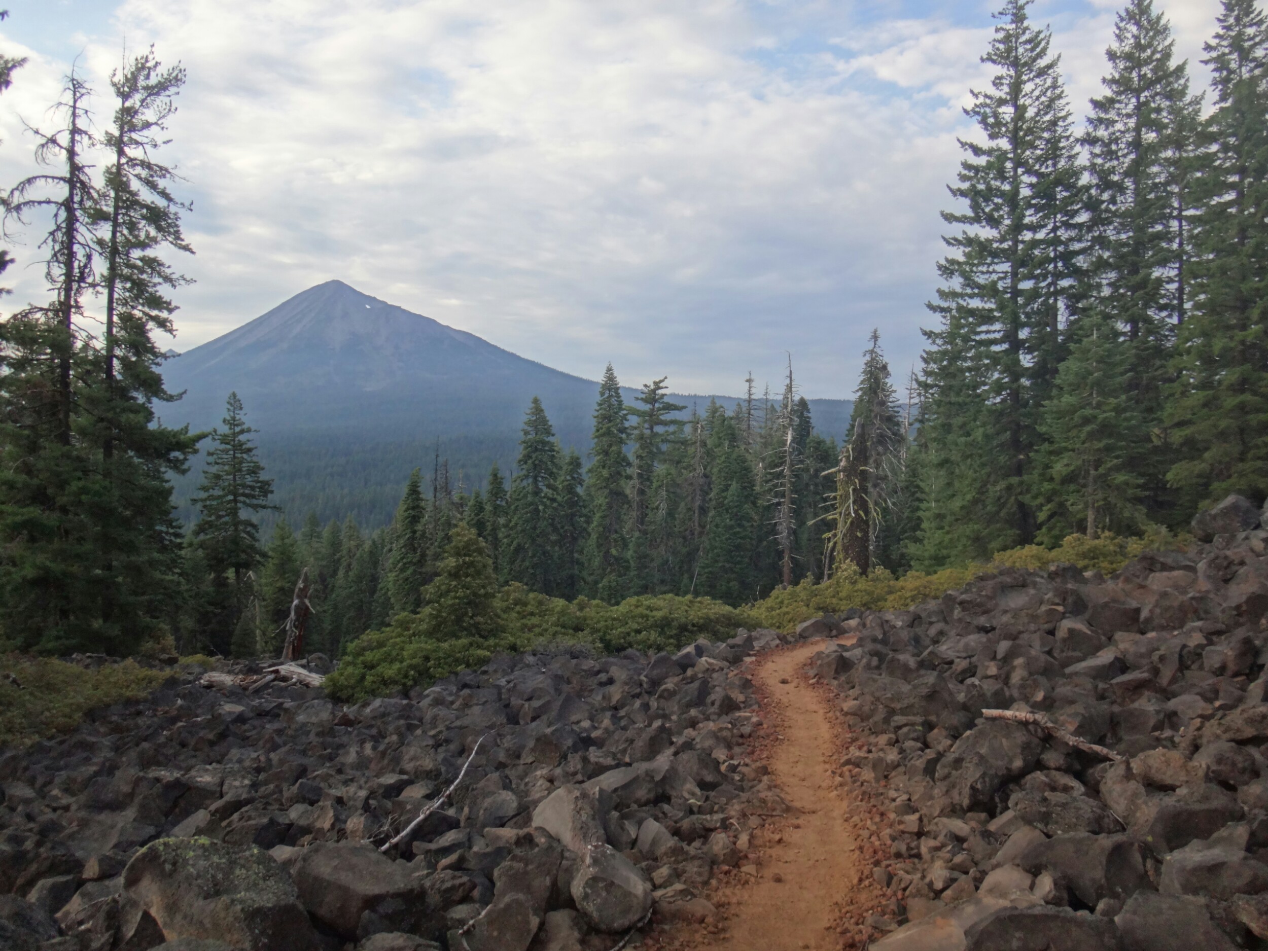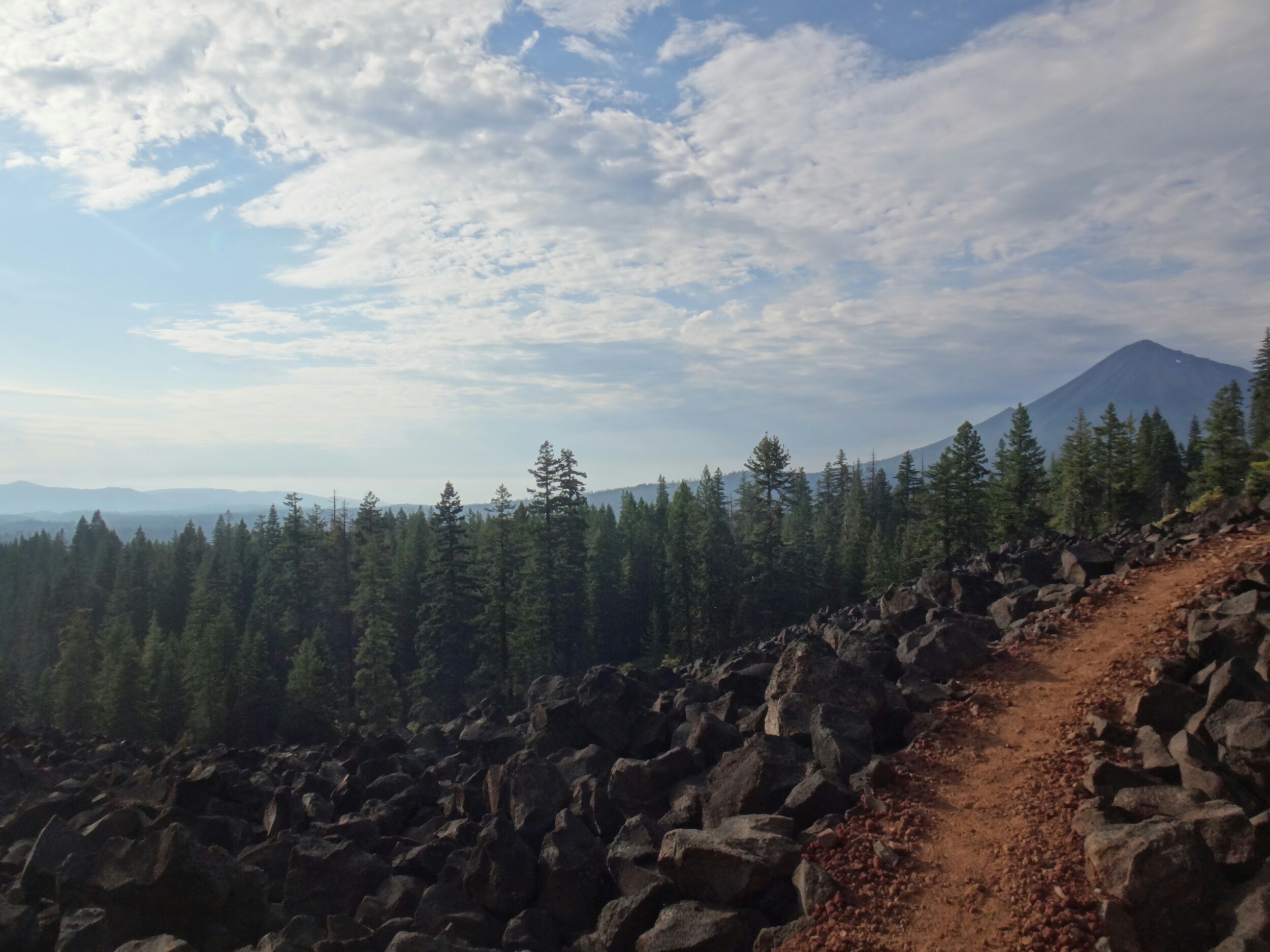 Verdammt war es kalt. Um 5.30 aufestanden und dann aber Gas gegeben um schnell zu starten. Es waren nur 13 Grad. Ich lief los und wärmte mich zum Glück schnell auf. Ich schreckte ein paar Rehe auf und füllte an einem Wasserhahn meinen Wasservorrat. Der Trail schlängelt sich an den vielen Seen und Resorts entlang ohne diese wirklich zu berühren. Das zieht sich ewig und mir hängt der gestrige Tag arg in den Knochen. Also viele Pausen und Shaggy und Hui holen mich ein. Wie kommen für die meiste Zeit nicht aus dem Wald hinaus. Dafür geht es schön einen langen Anstieg hinauf. Ohhg. Einfsch ein Fuß nach dem anderen. Eigentlich ganz einfach. Aber als wir am Nachmittag auf die letzten 10km stoßen muss ich schon stark dran glauben. Der Ausschlag ist zwar wieder abgeschwollen aber meine Füße sind müde und jetzt beginnt der Vulkanabschnitt. Wir laufen auf zerbrochenen Vulkangestein und schlängeln uns an einem Berg entlang. Jede Mündung in den Berg nehmen wir mit. Dafür gibt es erste Aussichten auf einen Schneebedeckte Berg der vor uns liegt und an dem wir heute zelten. Auch wenn es nicht weit ist dauert es mit den ganzen extra Kurven doch ewig und ich bin heil froh als endlich der Highway zu hören ist. Meine Beine sind wie Wackelpudding. Am Parkplatz hängt eine Information. Wegen Feuer ist der Trail ab der Sevenmile Abzweigung gesperrt. Ebenso der Crater Lake Trail ist zu. Mal schauen was das wird. Wir laufen morgen erst mal weiter und schauen was so abgeht. Zum Glück campen wir direkt am Fluss und ich kann meine Füße und Beine waschen die total eingestaubt sind. Auch ein paar Kilo Sand kann ich aus meinen Schuhen kippen. Als ich gerade meinen rechten Fuß wasche kommt RockDoc den Trail hinunter. Sie und Rattler campen ein paar Meter weiter oben 🙂 . Zum Abendessen habe ich natürlich Kartoffelpüree und eine Instant Nudelsuppe. Irgendwas neues mit Meeresfrüchten. Ist nicht der Bringer, dafür aber sehr scharf und mit mehr Kalorien als die normale Ramen Suppe. Heute liege ich gegen 20.40 Uhr im Bett.