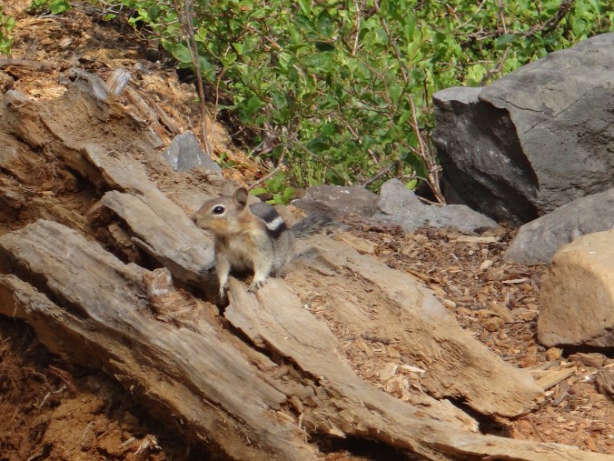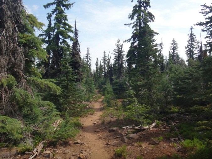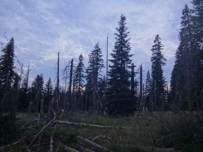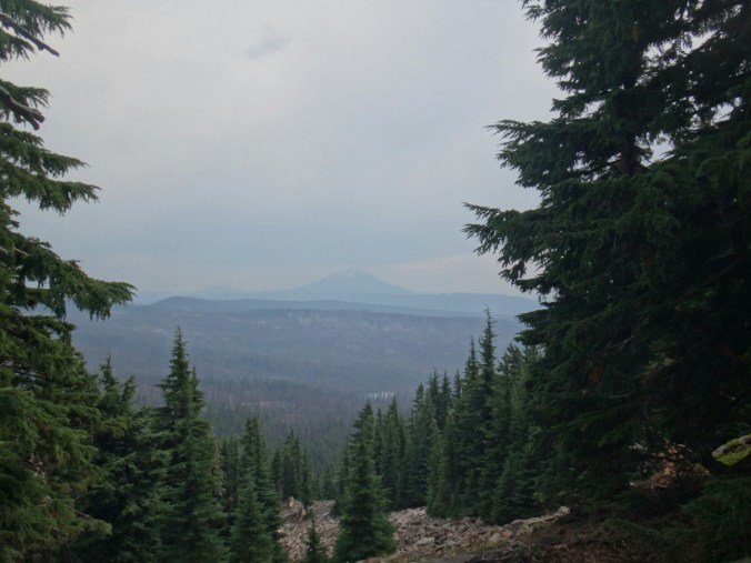 Heute war es schon wieder so kalt. Es wir echt ungemütlich. Aber auch heute gibt der Trail Abhilfe. Um 6 geht Es langsam aber stetig den Wald hinauf. Immer schön am Mt. McLoughlin. Der Wald ist offen und die Bäume voller Flechten und Moos. Ich hatte eigentlich erwartet einen Bären und Reh zu sehen. Aber bis zur Quelle war ich erfolglos. Die ersten 16 km ging es ohne Pause. Dafür aß ich jetzt ausgiebig Nutella. Ein Chipmunk tollte die ganze Zeit um uns herum und war wohl hungrig. An der Christis Quelle haben wir auch noch JackRabbit und Blossom getroffen. Der ganze Anstieg führte uns 600m in die Höhe. Immer mal mehr mal weniger aufwärts. Gegen Mittag kam dann auch noch ein Regenschauer über uns. Ich musste alles wasserdicht verpacken und lief unter meinem Schirm weiter. Bis auf Donner kam aber nicht weiter hinzu. Je höher wir kamen desto karger wurde die Landschaft. Aus dichten Tannen wurde verbannte Erde. Es bot sich ein schöner Blick zurück auf Mt. McLoughlin. Ich musste noch eine Pause machen und mehr essen bevor ich die letzten Meter über den Bergrücken machte. Ich fand ein wenig Schnee vor und es ging in Serpentinen bergab. Ab hier kamen dann auch die ganzen Moskitos wieder zum Vorschein. An einem kleinen Bach konnten wir aber zum Glück wieder Wasser aufnehmen. Die Abschnitte hier sind echt elendig lang. Der Berg hinab folgte ich Shaggy bis wir am letzten Bach für heute Rattler und RockDoc trafen. Wir kochten auf dem Trail und unterhielten uns bis wir gegen ca. 18.30 weiter liefen. Es donnerte in der Ferne und bis zur Abzweigung wo wir zelten wollten waren es nur noch 5 km. Trotz Pause war ich wieder mal sehr kaputt. Die Tage sind sehr lang und irgendwie schaffen wir es nie mal früh das Zelt aufzuschlagen. Also bin ich den letzten Abschnitt in einem durch. Es sind noch zwei deutsch um uns herum. An der Abzweigung angekommen, ich hatte wieder ein paar Tropfen abbekommen, waren keine Zeltplätze zu finden und wir liefen auch noch die letztn 3km bis zum Parkplatz hinab. 3km können gsnz schön lang sein. Auch wenn es nur ca. 30 Min dauert. Aber die ziehen sich ewig und ich hielt mich hinter einem Hiker um nicht in hunderte Pausen zu verfallen. Am Campingplatz saßen schon JackRabbit und Blossom. Ich baute nur noch mein Zelt auf und verschwand ohne viel Worte zu verlieren darin und knackte gegen 21 Uhr weg.