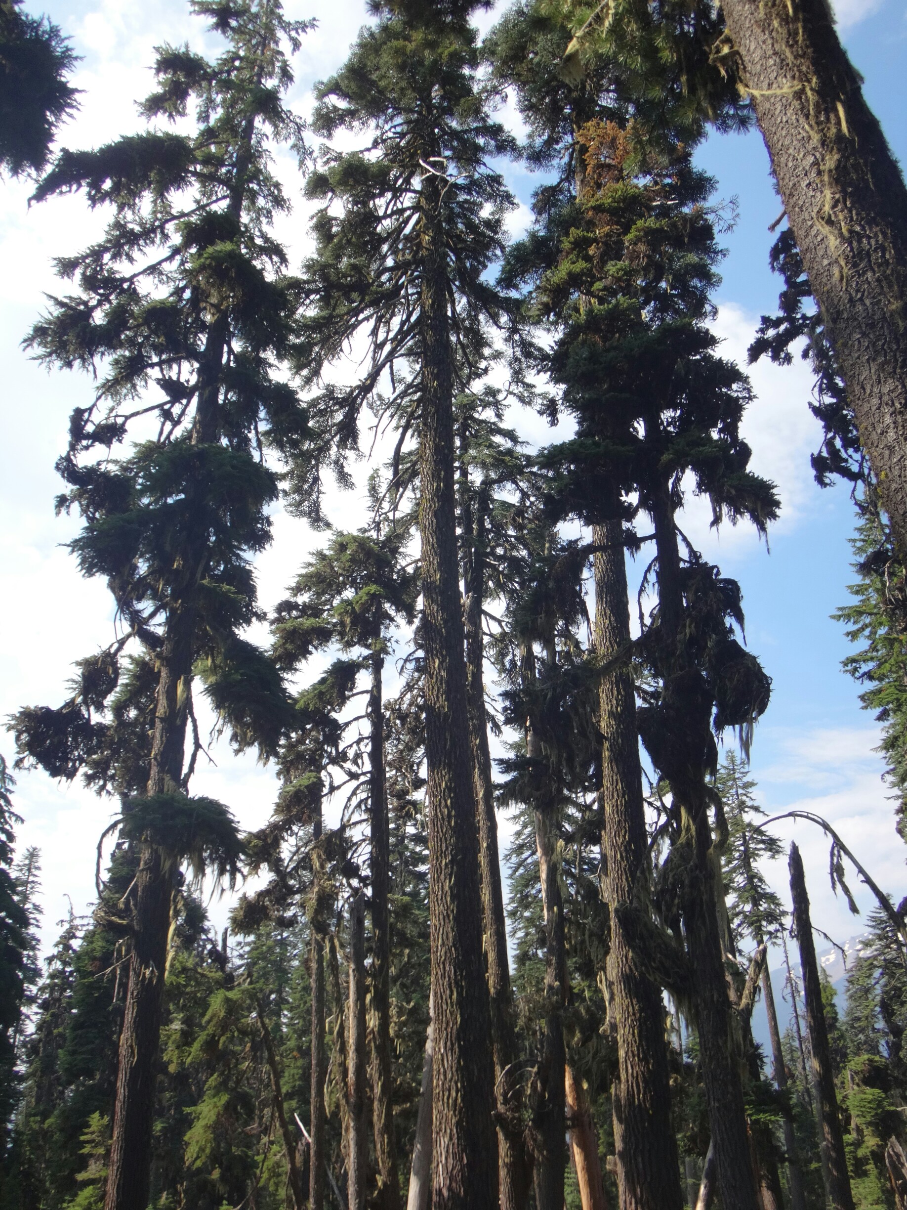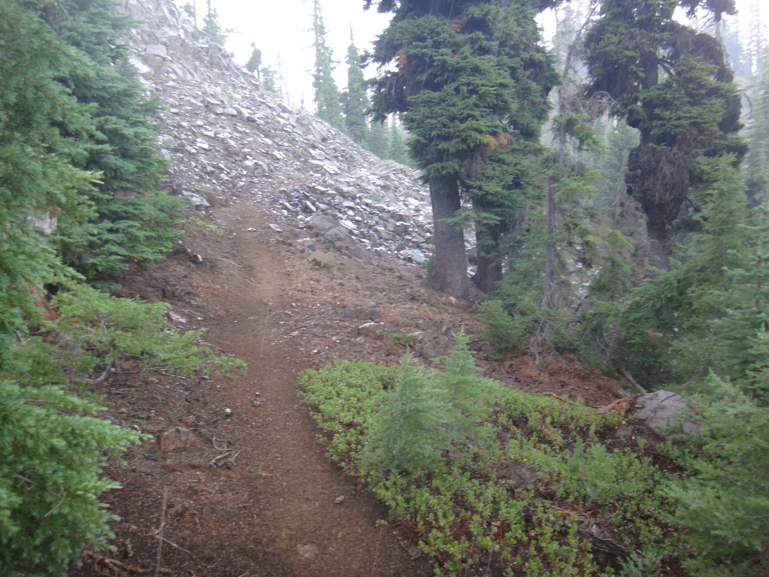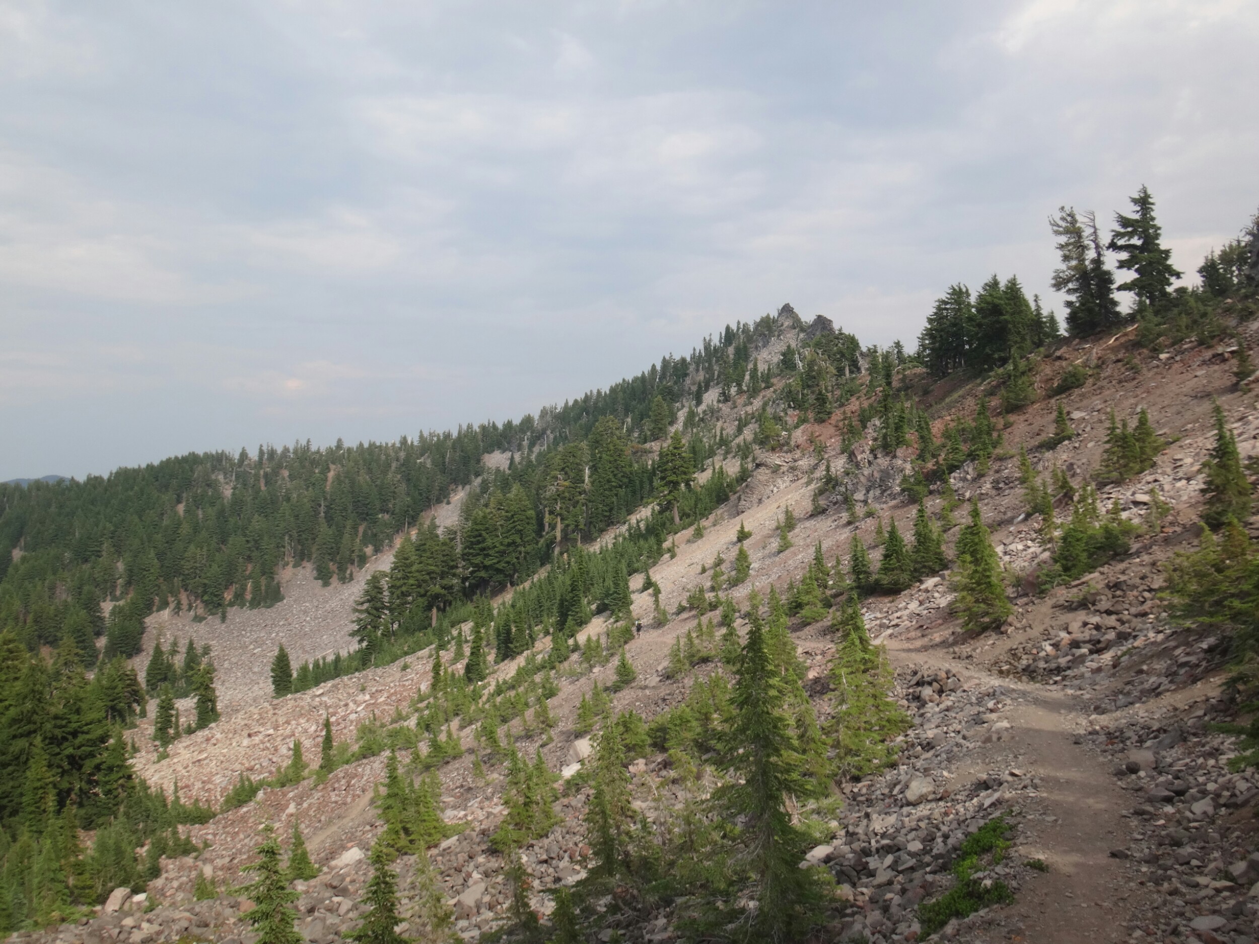 Heute war es schon wieder so kalt. Es wir echt ungemütlich. Aber auch heute gibt der Trail Abhilfe. Um 6 geht Es langsam aber stetig den Wald hinauf. Immer schön am Mt. McLoughlin. Der Wald ist offen und die Bäume voller Flechten und Moos. Ich hatte eigentlich erwartet einen Bären und Reh zu sehen. Aber bis zur Quelle war ich erfolglos. Die ersten 16 km ging es ohne Pause. Dafür aß ich jetzt ausgiebig Nutella. Ein Chipmunk tollte die ganze Zeit um uns herum und war wohl hungrig. An der Christis Quelle haben wir auch noch JackRabbit und Blossom getroffen. Der ganze Anstieg führte uns 600m in die Höhe. Immer mal mehr mal weniger aufwärts. Gegen Mittag kam dann auch noch ein Regenschauer über uns. Ich musste alles wasserdicht verpacken und lief unter meinem Schirm weiter. Bis auf Donner kam aber nicht weiter hinzu. Je höher wir kamen desto karger wurde die Landschaft. Aus dichten Tannen wurde verbannte Erde. Es bot sich ein schöner Blick zurück auf Mt. McLoughlin. Ich musste noch eine Pause machen und mehr essen bevor ich die letzten Meter über den Bergrücken machte. Ich fand ein wenig Schnee vor und es ging in Serpentinen bergab. Ab hier kamen dann auch die ganzen Moskitos wieder zum Vorschein. An einem kleinen Bach konnten wir aber zum Glück wieder Wasser aufnehmen. Die Abschnitte hier sind echt elendig lang. Der Berg hinab folgte ich Shaggy bis wir am letzten Bach für heute Rattler und RockDoc trafen. Wir kochten auf dem Trail und unterhielten uns bis wir gegen ca. 18.30 weiter liefen. Es donnerte in der Ferne und bis zur Abzweigung wo wir zelten wollten waren es nur noch 5 km. Trotz Pause war ich wieder mal sehr kaputt. Die Tage sind sehr lang und irgendwie schaffen wir es nie mal früh das Zelt aufzuschlagen. Also bin ich den letzten Abschnitt in einem durch. Es sind noch zwei deutsch um uns herum. An der Abzweigung angekommen, ich hatte wieder ein paar Tropfen abbekommen, waren keine Zeltplätze zu finden und wir liefen auch noch die letztn 3km bis zum Parkplatz hinab. 3km können gsnz schön lang sein. Auch wenn es nur ca. 30 Min dauert. Aber die ziehen sich ewig und ich hielt mich hinter einem Hiker um nicht in hunderte Pausen zu verfallen. Am Campingplatz saßen schon JackRabbit und Blossom. Ich baute nur noch mein Zelt auf und verschwand ohne viel Worte zu verlieren darin und knackte gegen 21 Uhr weg.