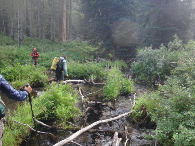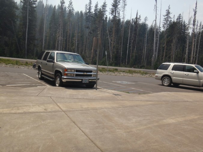 Ohne uns abzusprechen krochen Shaggy und ich heute mal ein wenig später aus dem Zelt. Es war nötig. Wir trafen direkt auf JackRabbit und Blossom mit denen wir über Forststraßen zum Highway gingen. Wir nahmen eine kleine Abkürzung über einen kleinen Fluss und schlugen uns durch das Gebüsch. Ab dort ging es auf Asphalt Kilometerweit geradeaus. Die beiden schlugen ein starkes Tempo an und ich habe ganz schön gepustet. Gerade als ich mich umdreht um mit Shaggy zu reden deutete er auf einen Bären ca. 150m vor uns. Es war der größte Schwarzbär den ich je gesehen habe. Wie ein kleines Auto. Ging einfach und unbekümmert von uns von einen in den anderen Wald hinein. Wir kamen auf den Highway und liefen aber hier weiter Richtung Mazama Village am Crater Lake. Auch hier blieben die beiden gnadenlos bis JackRabbits Mutter mit dem Auto kam und uns Käse mit Krackern servierte. Das war die einzige Pause auf den 30 km. Es war echt übel. Über uns flogen Hubschrauber und Rattler kam uns im Auto entgegen. Gegen 13.30 kamen wir dafür fix und fertig am Ziel. Mein Paket war trotz Feuer da. Shaggy und ich aßen im Restaurant und gingen dann zum Zeltplatz. Er war wie ausgestorben. Am Nachmittag zog dann auch viel Rauch durch die Bäume. Ich machte ein Nickerchen. Dann Essen packen und wie waren gegen 18 Uhr im Bett. Morgen gehts um 5 los um über die Östliche Straße um den Crater Lake zu laufen da alles andere gesperrt ist. Wir wollen aber nicht mit dem Shuttel fahren.