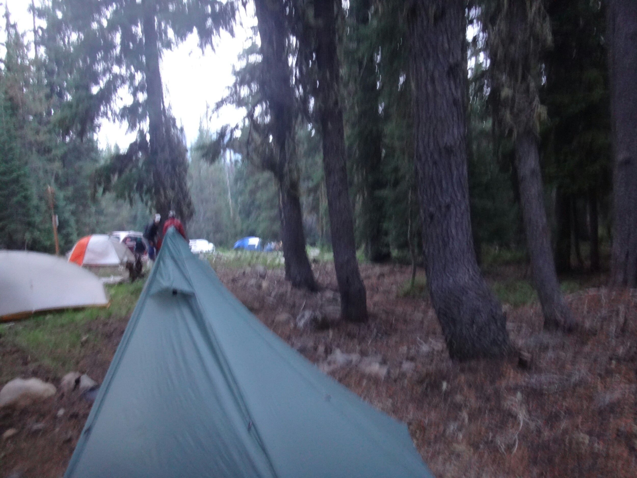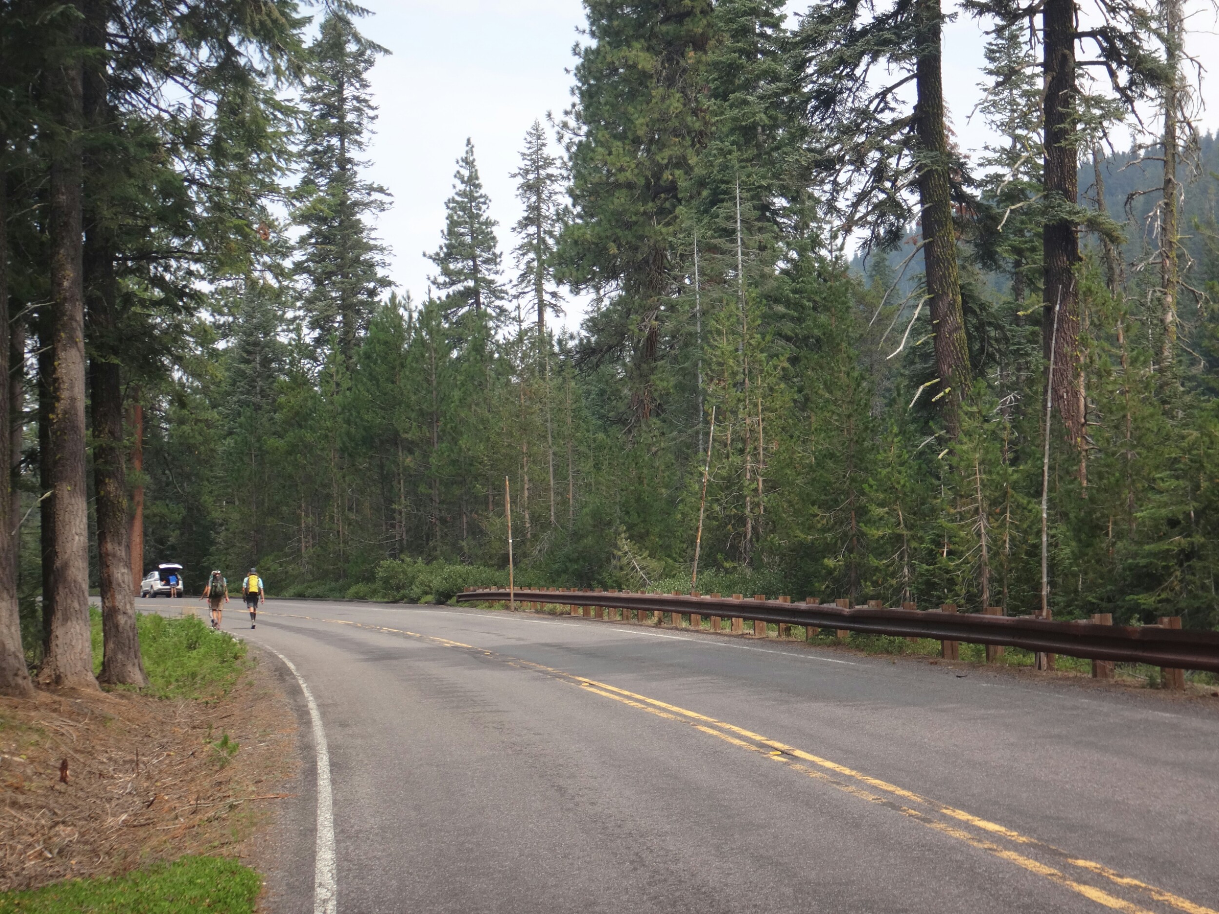 Ohne uns abzusprechen krochen Shaggy und ich heute mal ein wenig später aus dem Zelt. Es war nötig. Wir trafen direkt auf JackRabbit und Blossom mit denen wir über Forststraßen zum Highway gingen. Wir nahmen eine kleine Abkürzung über einen kleinen Fluss und schlugen uns durch das Gebüsch. Ab dort ging es auf Asphalt Kilometerweit geradeaus. Die beiden schlugen ein starkes Tempo an und ich habe ganz schön gepustet. Gerade als ich mich umdreht um mit Shaggy zu reden deutete er auf einen Bären ca. 150m vor uns. Es war der größte Schwarzbär den ich je gesehen habe. Wie ein kleines Auto. Ging einfach und unbekümmert von uns von einen in den anderen Wald hinein. Wir kamen auf den Highway und liefen aber hier weiter Richtung Mazama Village am Crater Lake. Auch hier blieben die beiden gnadenlos bis JackRabbits Mutter mit dem Auto kam und uns Käse mit Krackern servierte. Das war die einzige Pause auf den 30 km. Es war echt übel. Über uns flogen Hubschrauber und Rattler kam uns im Auto entgegen. Gegen 13.30 kamen wir dafür fix und fertig am Ziel. Mein Paket war trotz Feuer da. Shaggy und ich aßen im Restaurant und gingen dann zum Zeltplatz. Er war wie ausgestorben. Am Nachmittag zog dann auch viel Rauch durch die Bäume. Ich machte ein Nickerchen. Dann Essen packen und wie waren gegen 18 Uhr im Bett. Morgen gehts um 5 los um über die Östliche Straße um den Crater Lake zu laufen da alles andere gesperrt ist. Wir wollen aber nicht mit dem Shuttel fahren.