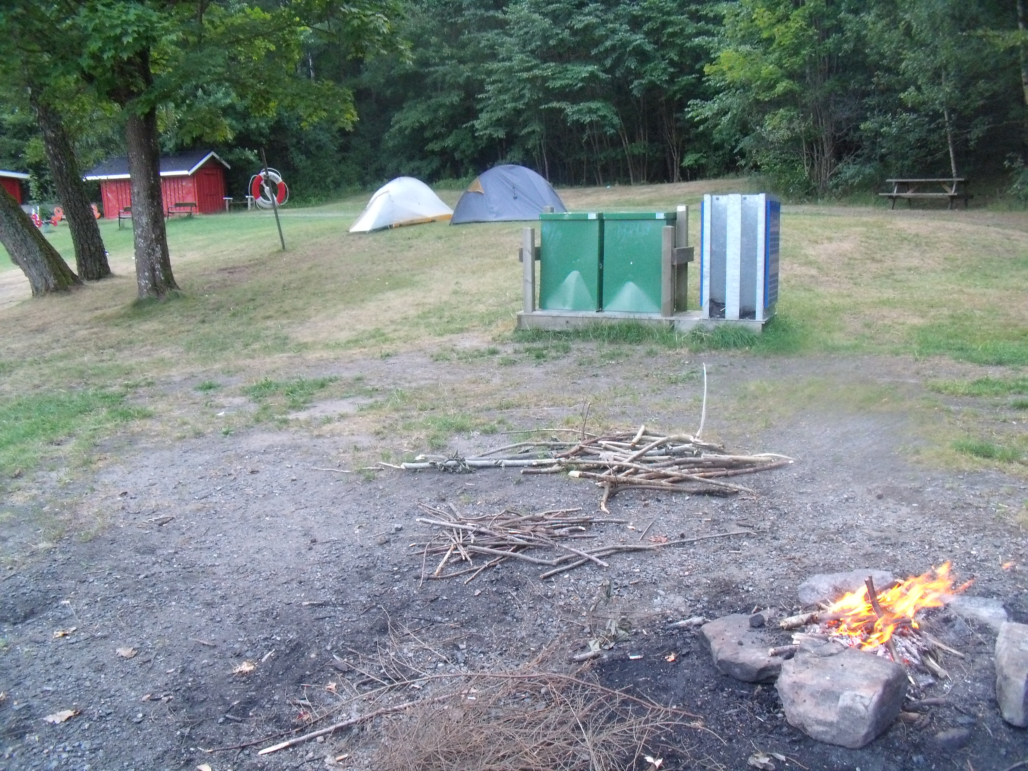Wir lassen die Füße im Wasser baumeln und schauen vom Steg aus, den Jugendlichen beim Turmspringen zu. Ab und an fährt am Ufer gegenüber ein Zug entlang und holt uns zurück in die heutige Zeit. So vergeht der Nachmittag damit, unsere „alten Klassiker“ zu lesen und den Rucksack leichter zu essen. Gegen Abend bauen wir dann unsere Zelte auf und kochen an einem Tisch unser Essen. Anschließend schlagen wir uns gut genährt in den Wald uns sammeln Holz für unser Abendprogramm. Es läuft, „Best of Kamin 2014 – Vol. 2“. Nebenbei muss ich sagen, es erstaunt mich LEIDER nicht wirklich, welch amüsante Texte es auf google zu finden gibt, wenn nach „Kamin DVD“ gesucht wird!