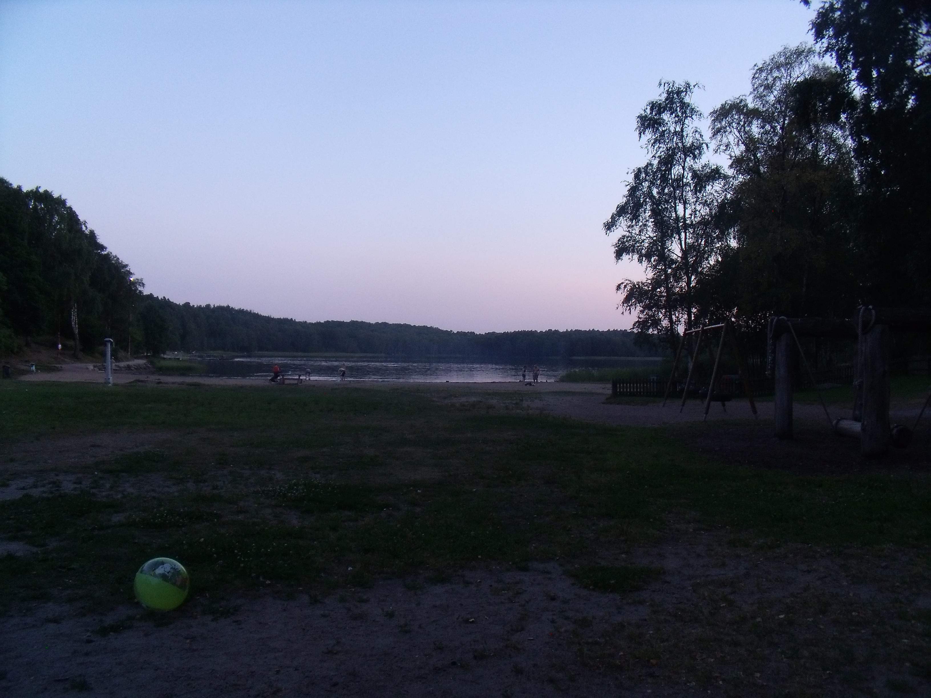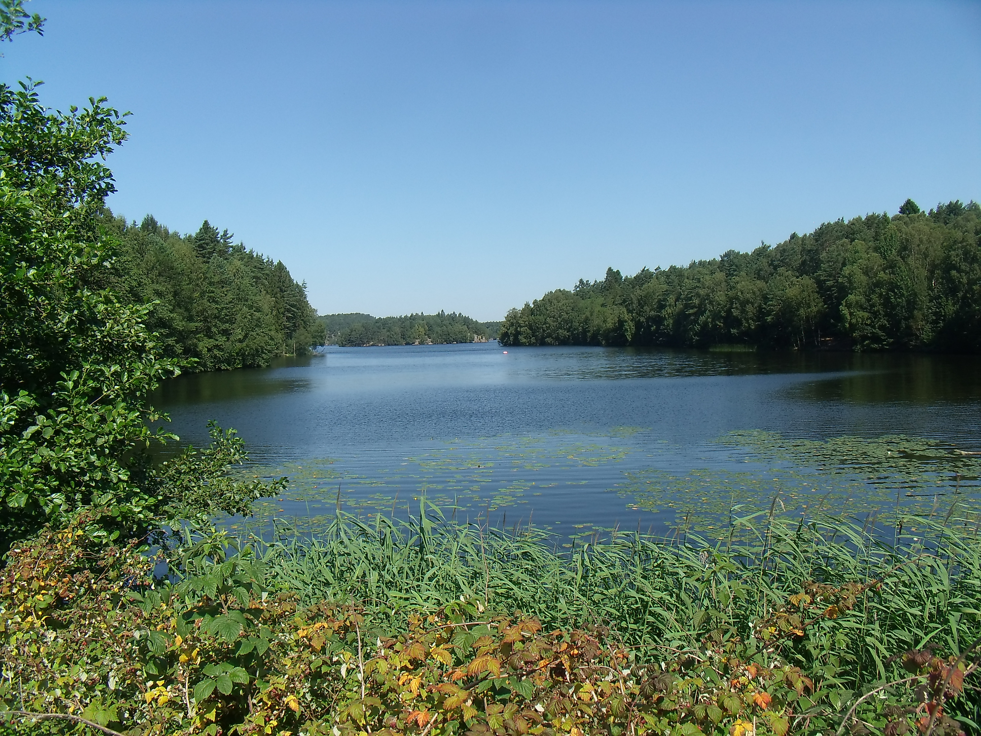 Hier endet auch offiziell die dritte Etappe. Allerdings ziehen wir es vor, an Badeseen zu nächtigen und laufen entlang des Flusses Säveån, der auch als Energielieferant dient, bis zum See Humlebadet. Dieser Weg führt nun ausschließlich über Asphalt und wird nicht nur von uns benutzt. Der See bietet beim ersten Anblick einen tollen Ausblick. Er erstreckt sich weiter, als das Auge sehen kann. Entlang des Sees folgen wir dann einem gut befestigten Pfad bis zur Badestelle, ca. 500 Meter außerhalb von Jonsered.