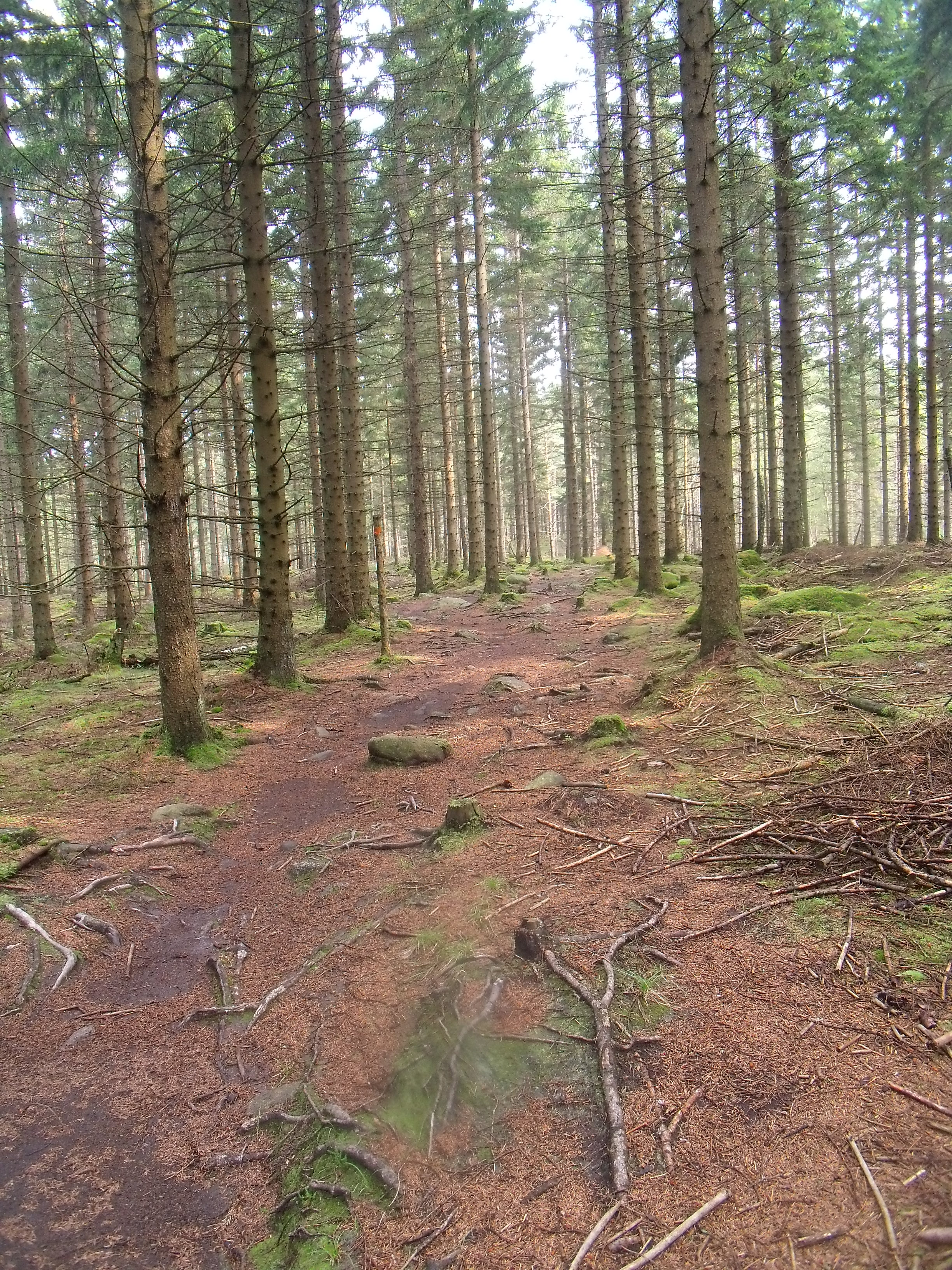 Wir bewegen uns in leichten Sonnenschein, durch ein Moosbedeckten Nadelwald. Der Himmel ist noch mit Wolken behangen und die Morgenfeuchtigkeit bildet leichte Nebelbänke . Die Atmosphäre ist hier ganz anders als in den letzten Tagen. Man fühlt sich in diesem Teil des Waldes zeitlos.