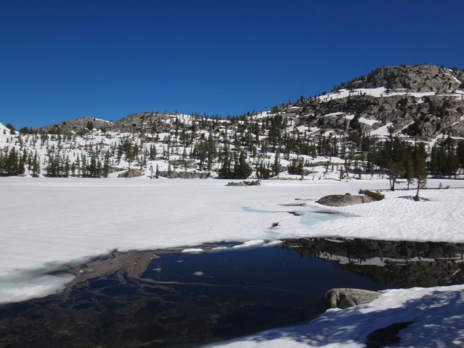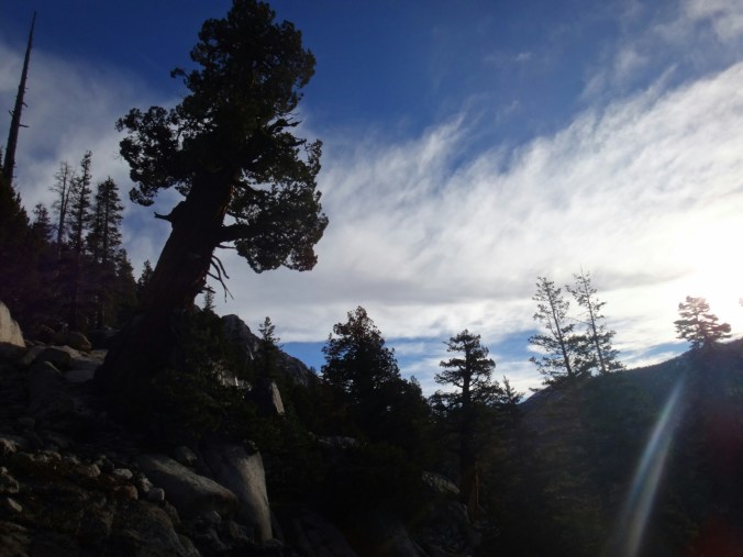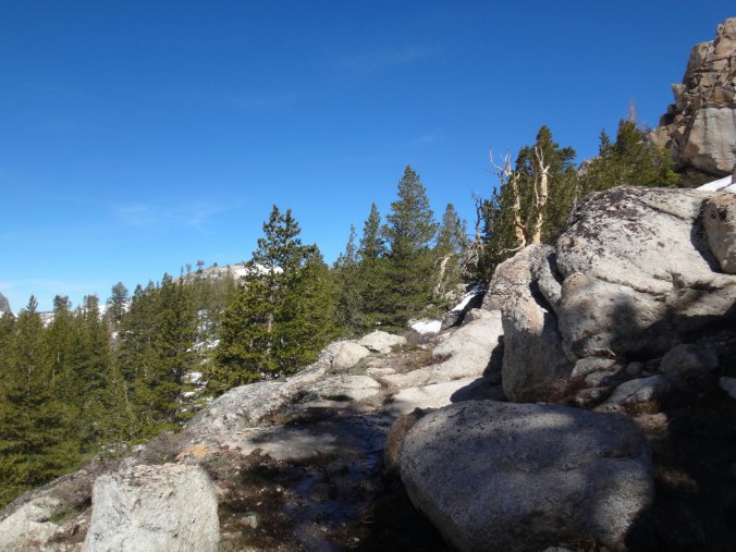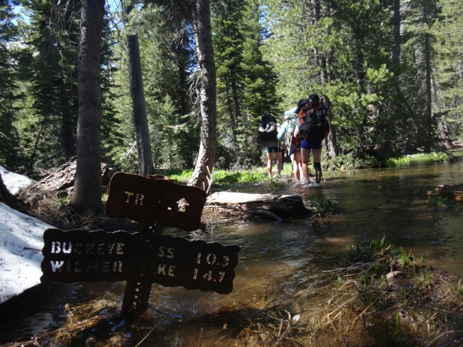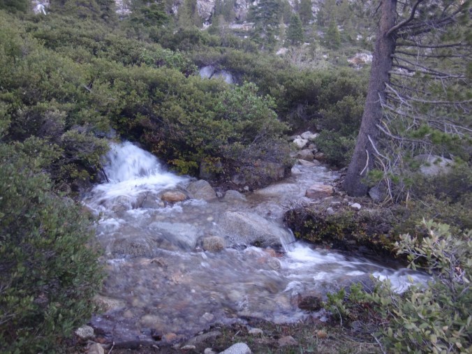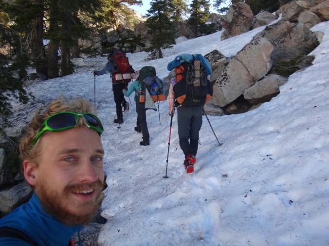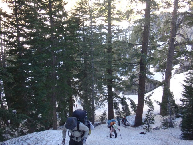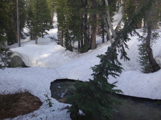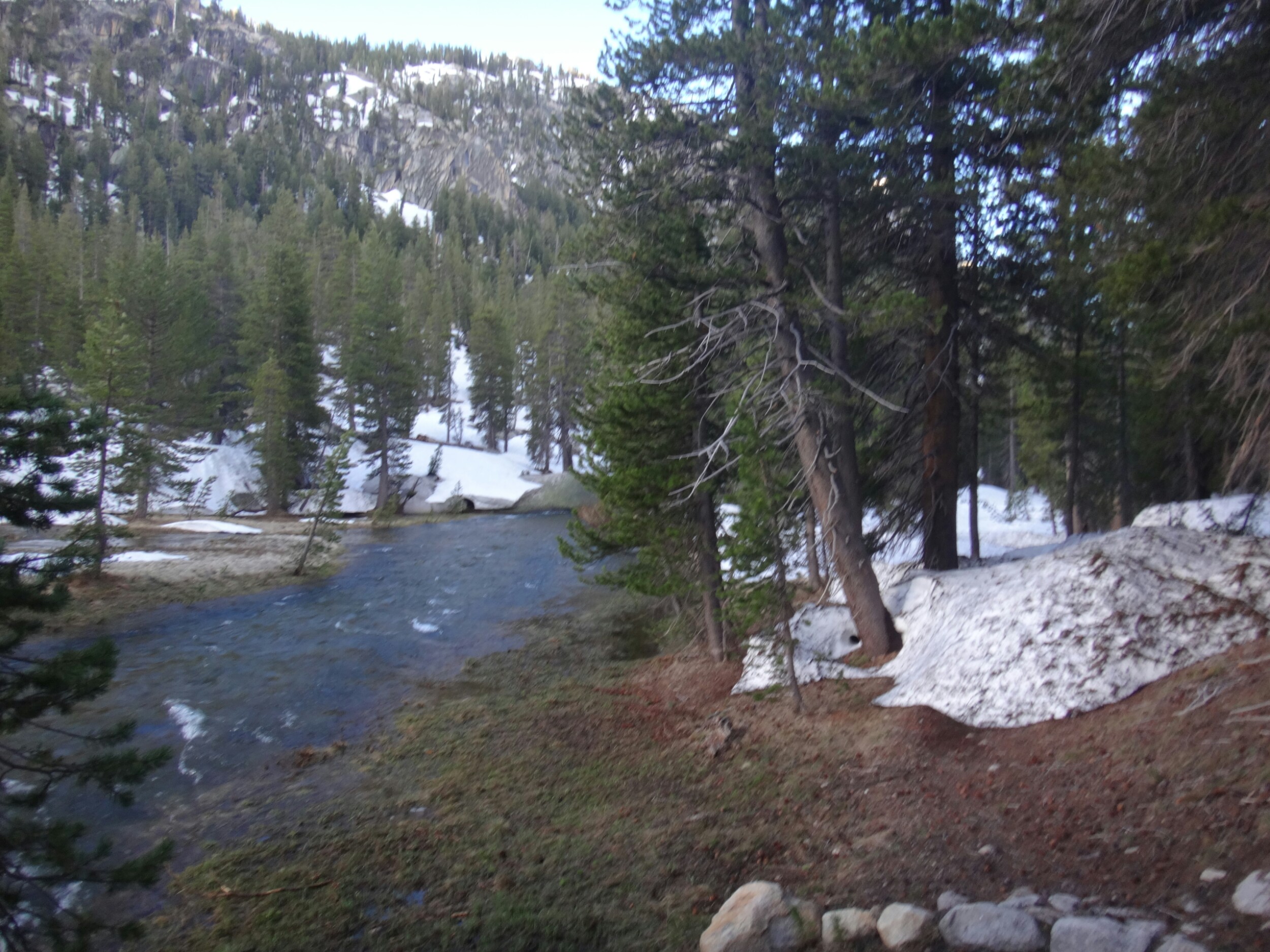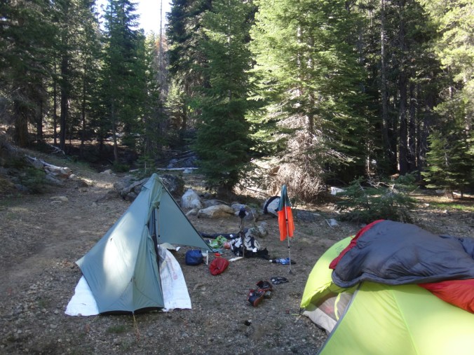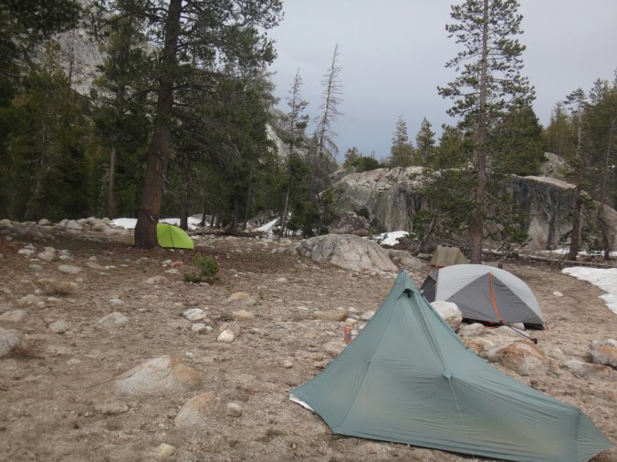 Da es gegen 3 anfängt zu regnen verziehen sich alle in die Zelte. Ich schlafe sofort ein nachdem ich ein Hörspiel angemacht habe. Totaler Blackout 😀 . Ich wache erst gegen 5 wieder auf und bin total durchgeschwitzt. Ich treffe draußen auf Rattler und RockDoc. RockDoc hat gesehen wie der Fluss einen Baum entwurzelt hat der am Ufer Stand. Das war dann wohl kein Donner. Wir haben noch für 5 Tage Essen und knapp 60 km vor uns. Allerdings sind auch noch ein paar Flüsse zu queren. Dies ist wohl der letzte wirklich gefährliche aber man weis nie. Die letzte gesicherte Überquerung dieser Passage bis zum Sonora Pass war vor einer Woche. Die Temperaturen sind jetzt auch Nachts über 0 Grad. Es taut und taut also.