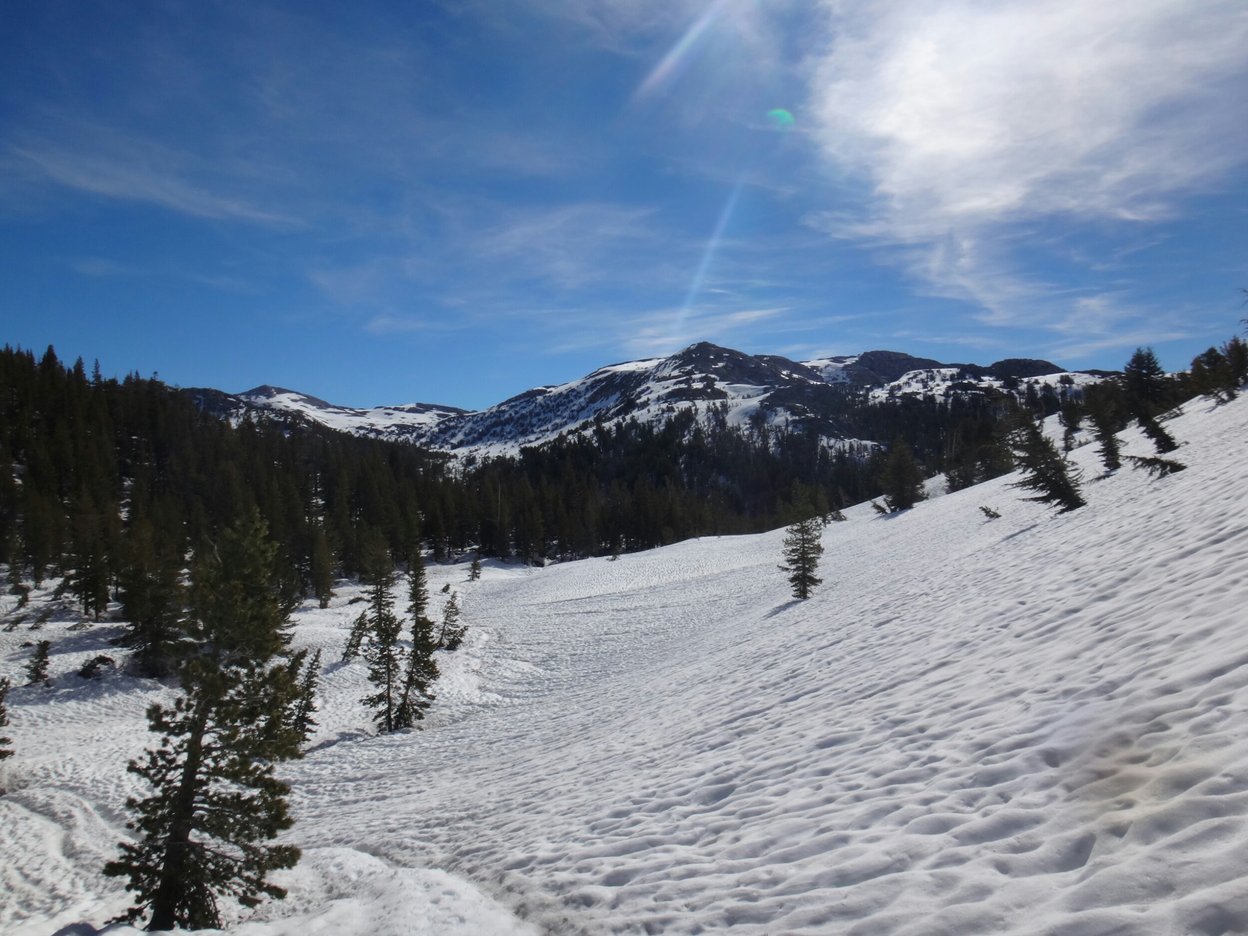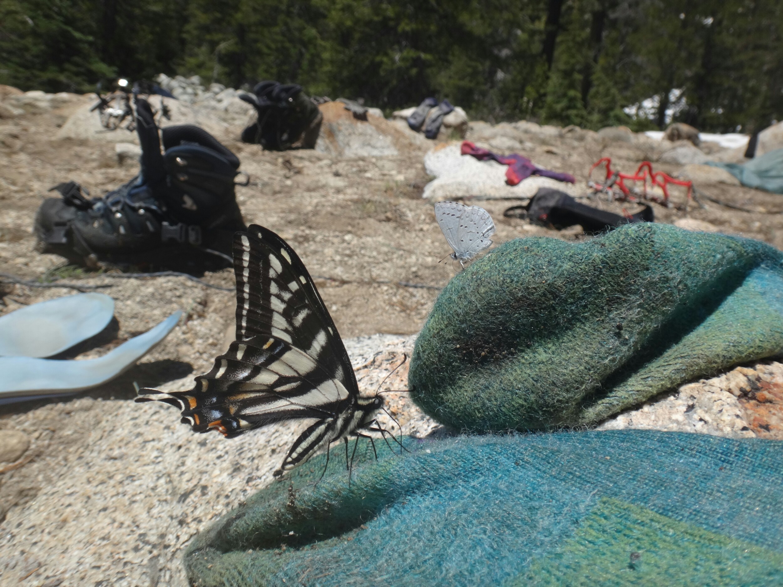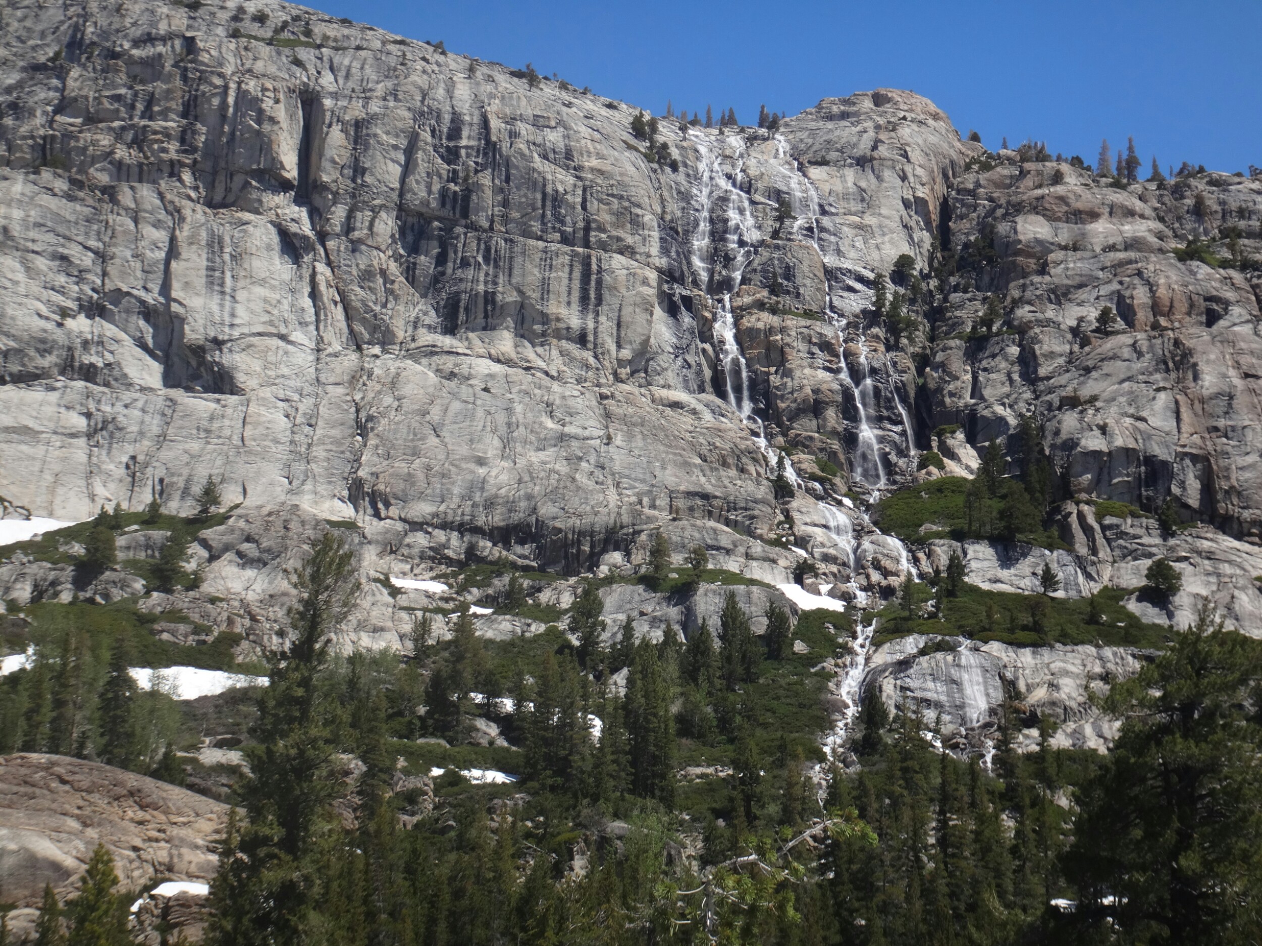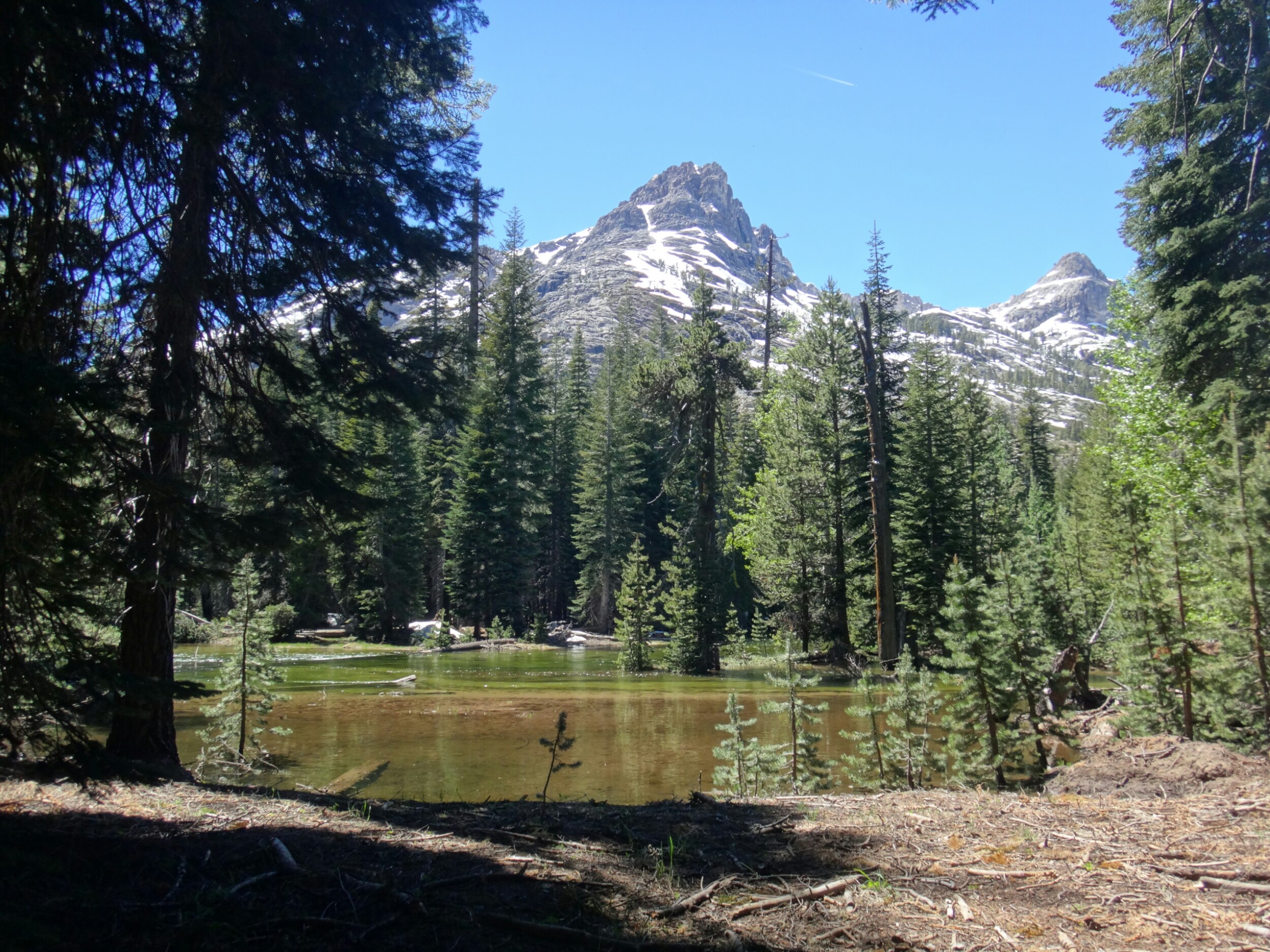 Da es gegen 3 anfängt zu regnen verziehen sich alle in die Zelte. Ich schlafe sofort ein nachdem ich ein Hörspiel angemacht habe. Totaler Blackout 😀 . Ich wache erst gegen 5 wieder auf und bin total durchgeschwitzt. Ich treffe draußen auf Rattler und RockDoc. RockDoc hat gesehen wie der Fluss einen Baum entwurzelt hat der am Ufer Stand. Das war dann wohl kein Donner. Wir haben noch für 5 Tage Essen und knapp 60 km vor uns. Allerdings sind auch noch ein paar Flüsse zu queren. Dies ist wohl der letzte wirklich gefährliche aber man weis nie. Die letzte gesicherte Überquerung dieser Passage bis zum Sonora Pass war vor einer Woche. Die Temperaturen sind jetzt auch Nachts über 0 Grad. Es taut und taut also.