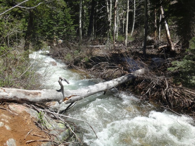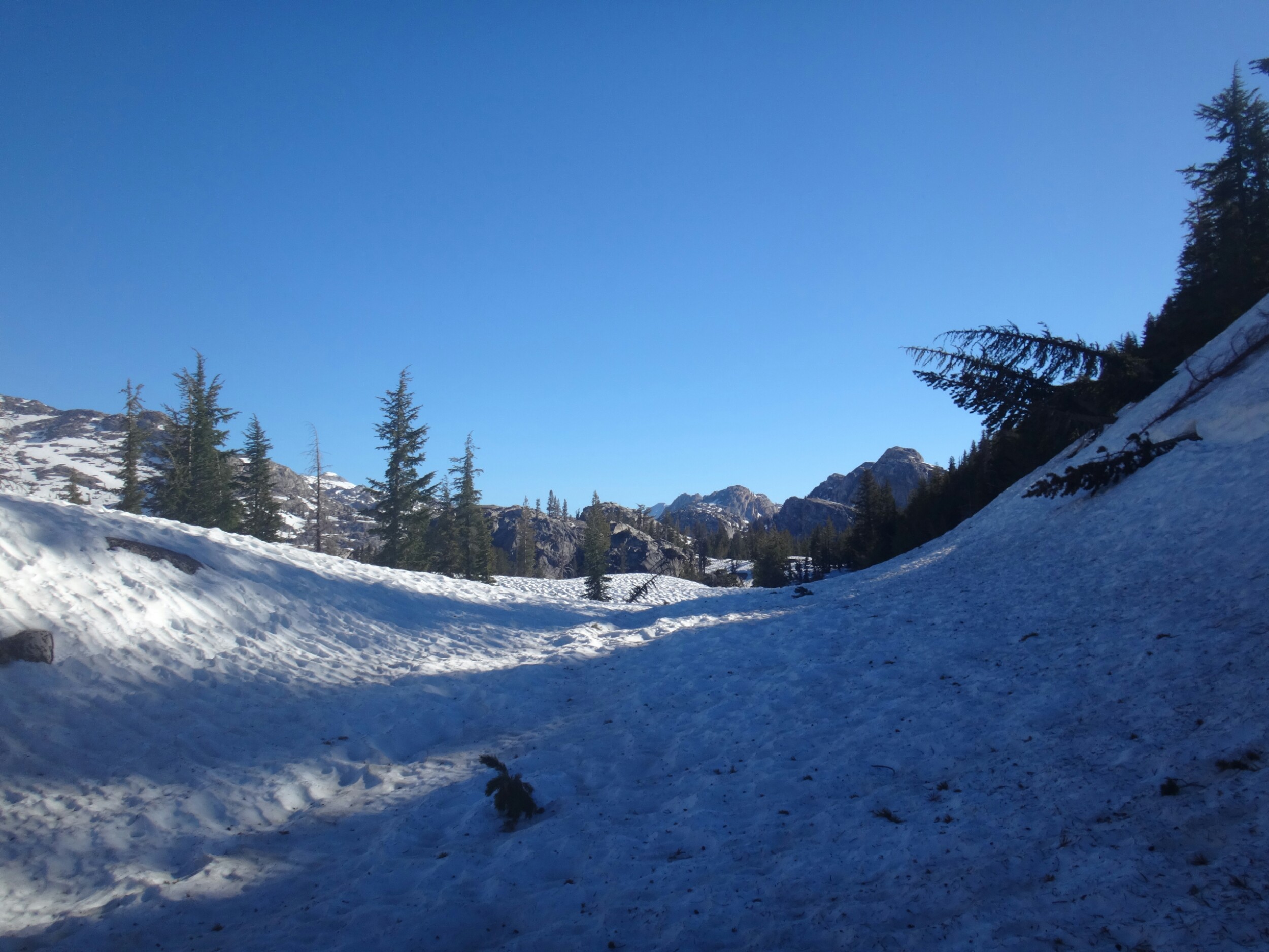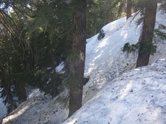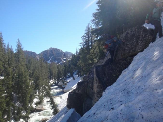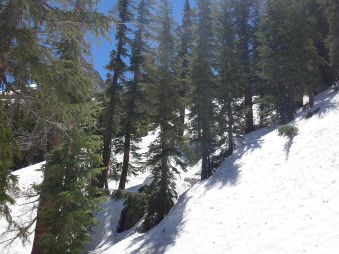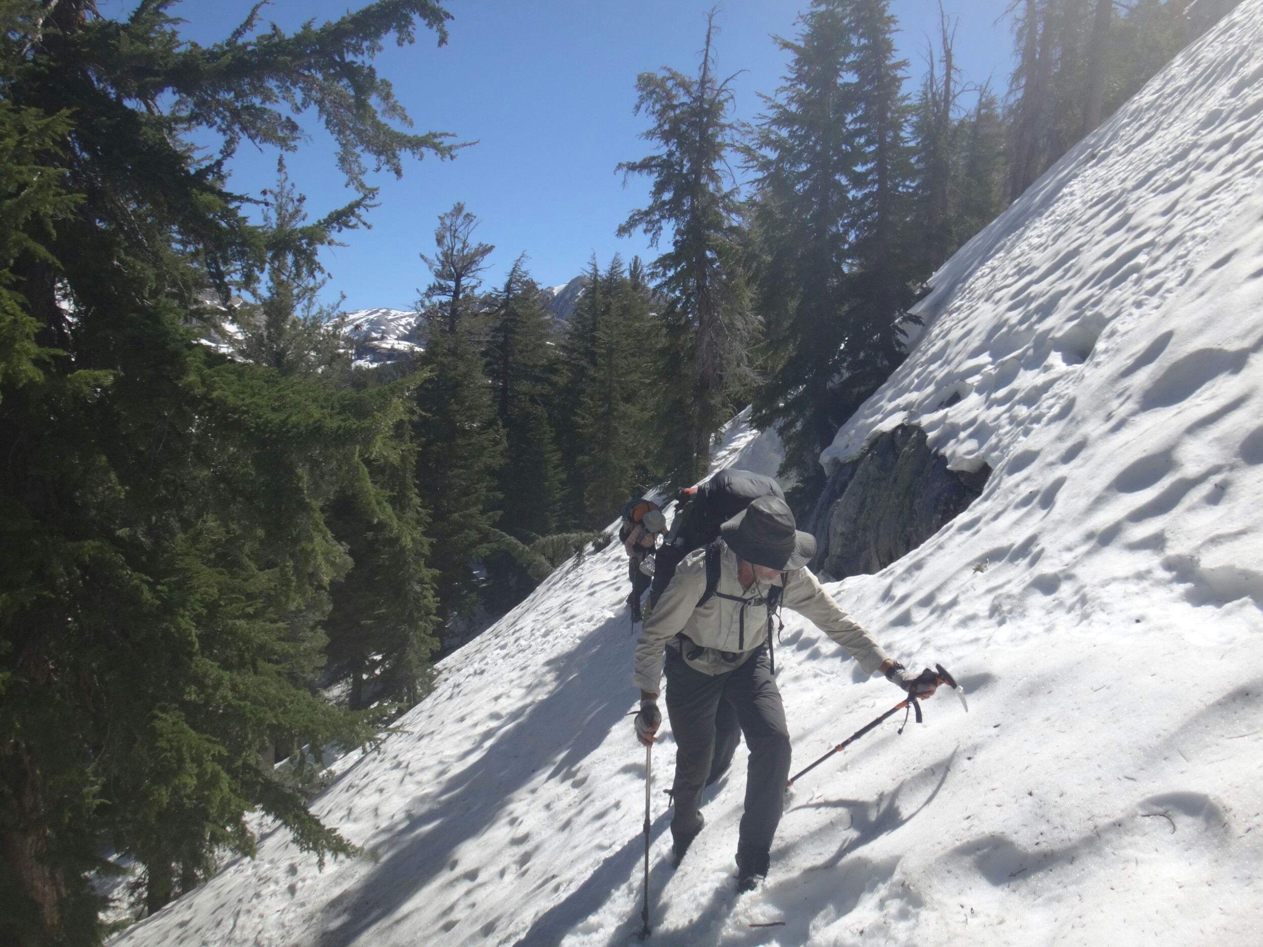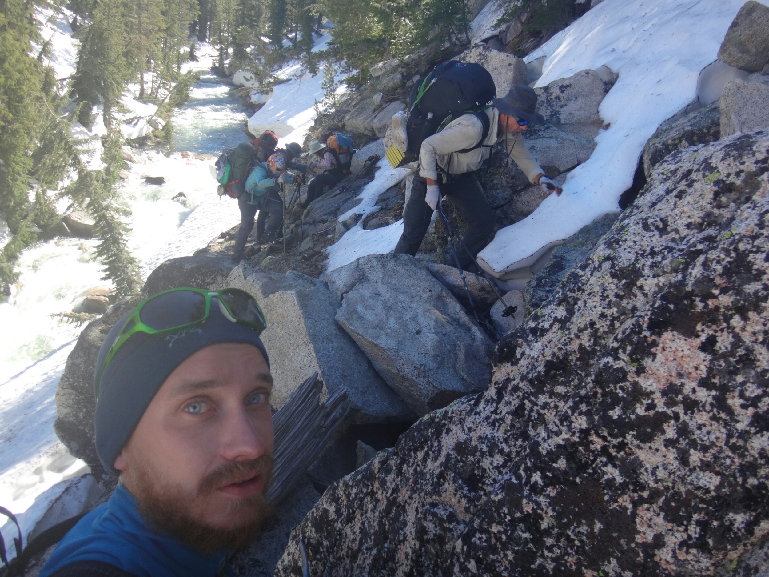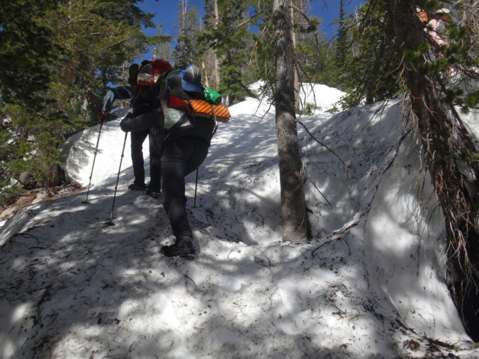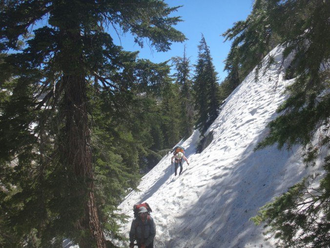 Ich habe wirklich komisches geträumt und war total gerädert als wir um 5 unsere Sachen gepackt haben. Wir starten gegen 6. Es ging auf einem guten Trail durch grüne Büsche den Berg hinauf. Wir sehen ein Reh was schnell verschwindet. Die Sonne tupfelt die hohen Berggipfel in erste Strahlen. Wir müssen einige kleine Bäche durchqueren und bekommen schon um halb 7 nasse Füße. Der Trail wird mit jedem Höhenmeter schneereicher. Wir stapfen über Schneefelder und kommen wieder auf einen steinigen Trail. Es ist anstrengend. Als der Schnee überhand nimmt ziehen alle ihre Steigeisen an. Wir laufen nun über einen Lawinenabgangfeld und sehen Eric D. auf der anderen Seite. Er macht sich gerade fertig. Zusammen laufen wir weiter. Der Trail schwenkt nach rechts und wir erklimmen schnell einen steilen Abschnitt. Durch ein kleines Tal mit toller Aussicht müssen wir leider zurück und links ein Schneefeld hoch. Das hatte ich verpasst. Es windet sehr und wir kommen oben an und legen direkt eine Pause auf trockenen Felsen ein. Unter uns liegt ein zugefrorener See. Mit den nassen Füßen wird es schnell kalt. Bis zum Piute Pass ist es nicht mehr weit und wir haben schon die meisten Höhenmeter hinter uns. Wir driften nochmal in ein kleines Tal bevor wir noch ein paar Steinstufen vom Trail finden. Die letzten Meter vergehen schnell und wir bekommen die Überschreitung nicht mit. Durch ein kleine Schneescharte gelangen wir zu unserem Abstieg in den Kerrick Canyon. Es ist super steil und wir schlagen uns sehr weit nach rechts in die Bäume bevor wir die Versen in den Schnee rammen. Eric D. läuft weiter Richtung Norden und geht in die Stadt. Wir müssen am Canyon entlang ins Tal. Der Fluss ist schon mächtig. Leider gibt es hier keinen sichtbaren Trail als wir gegen 8.30 Uhr loslaufen. Der Hang ist sehr steil und ich muss jeden Tritt in den nassen Schnee schlagen. Der Rest kann so sicher folgen. Ich habe meine Eisaxt in Aktion gebracht da unter uns der Fluss direkt abgeht. Nach dem Hang erwartet einen nur ein 2 m Sturz von einer Schneewehe. Wir arbeiten uns zu einem Felsen vor und überqueren diesen. Ich muss so manches Moos entfernen um den Weg passabel zu machen. Wir kommen nur sehr sehr langsam voran und das Tal will sich nicht wirklich öffnen. Also geht es weiter in sehr vorsichtiger Gehweise am Schneehang. Wir arbeiten uns so Stunden durch den Hang und kommen nach einem steilen Anstieg auf eine bessere Passage. Hier ist es flacher und wir können ein bisschen Gas geben. Wir queren den angrenzenden Wald und sehen wieder ein Reh. Ich folge meist deren Spuren da sie die sichersten Flussüberquerungen finden. Wir können so drei kleine Seitenbäche über Schneebrücken queren. Der Kerrick Fluss liegt im Tal und brodelt. Wir laufen und ab und zu kommt ein Trail zum Vorschein der jedoch meist unter Wasser steht. Das Vorgehen und Spuren, Tritte treten, navigieren ist super anstrengend und ich bin total platt. Richtig matsche. Aber wir kommen gegen 12 Uhr am Sommer Überquerungspunkt an. Unter einem großen Baum direkt am Fluss, alle sind total platt, legen wir die Mittagspause ein. Ich stopfe mir schnell meine Wraps rein und esse dann löffelweise Erdnussbutter. Danach muss ich mich rehydrieren. Alle sind wirklich geschafft von den letzten 5 km für die wir 3,5 Stunden benötigt haben. Allein für den steilen Abschnitt am Anfang, vielleicht 800 m, haben wir mindestes 1,5 Stunden benötigt. Jeder Meter also wirklich hart erkämpft.
